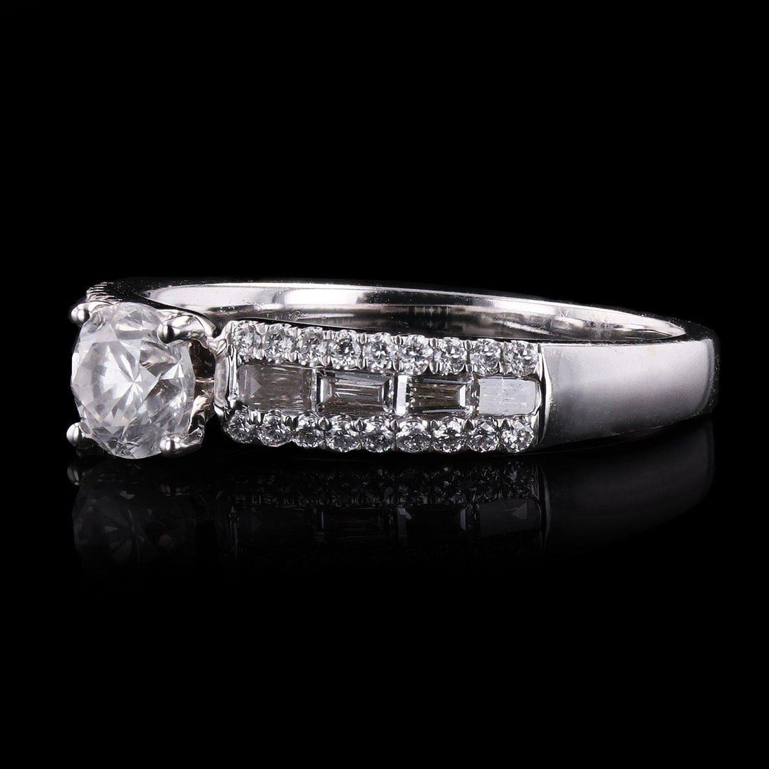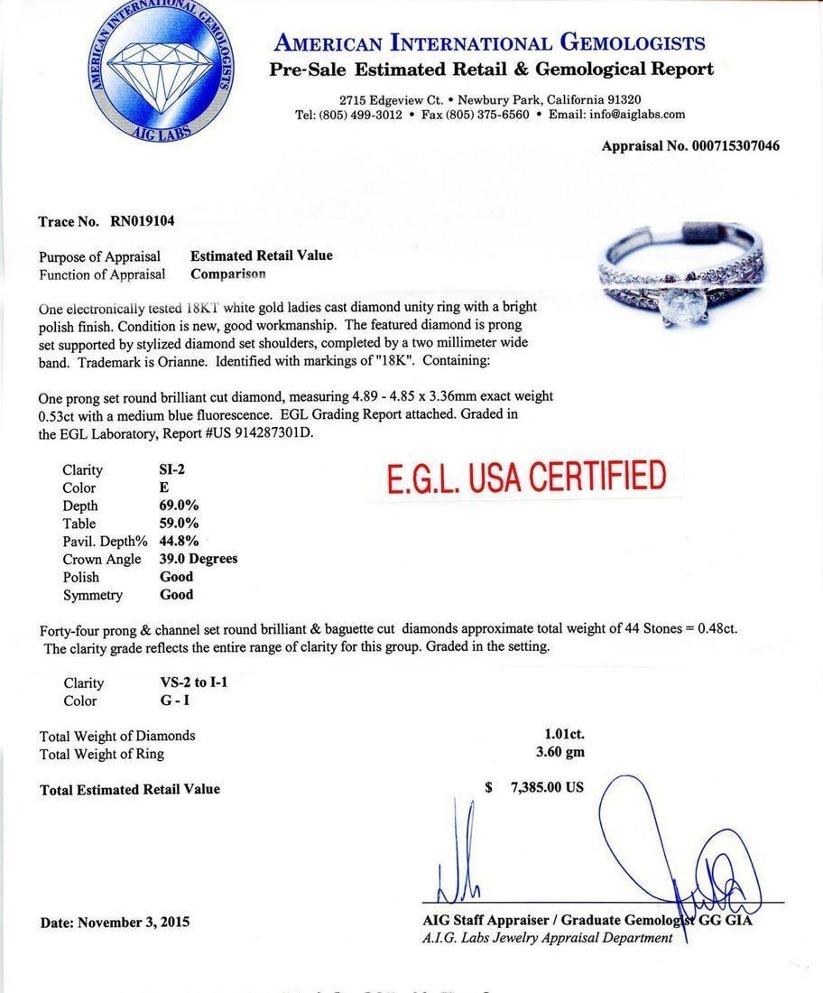 One electronically tested 18KT white gold ladies cast diamond unity ring with a bright polish finish. Condition is new, good workmanship. The featured diamond is prong set supported by stylized diamond setshoulders, completed by a two millimeter wide band. Trademark is Orianne. Identified with markings of "18K". Containing: One prong set round brilliant cut diamond, measuring 4.89 - 4.85 x 3.36mm exact weight 0.53ct with amedium blue fluorescence. EGL Grading Report attached. Graded in the EGL Laboratory, Report #US 914287301D. Clarity SI-2 Color E Depth 69.0% Table 59.0% Pavil. Depth% 44.8% Crown Angle 39.0 Degrees Polish Good Symmetry Good Forty-four prong and channel set round brilliant and baguette cut diamonds approximate total weight of 44 Stones = 0.48ct. The clarity grade reflects the entire range of clarity for this group. Graded inthe setting. Clarity VS-2 to I-1 Color G-I Total Weight of Diamonds 1.01ct. Total Weight of Ring 3.60 gm