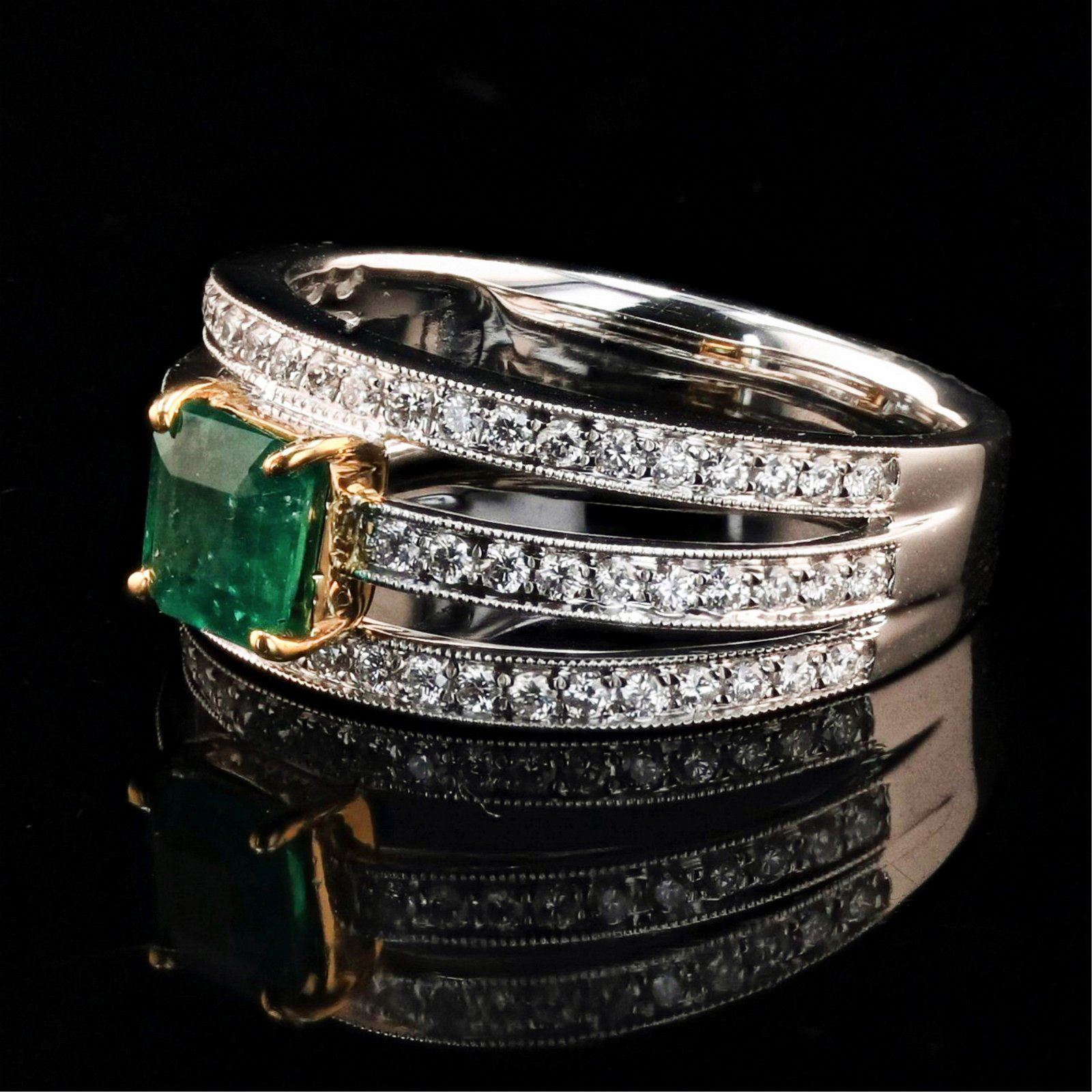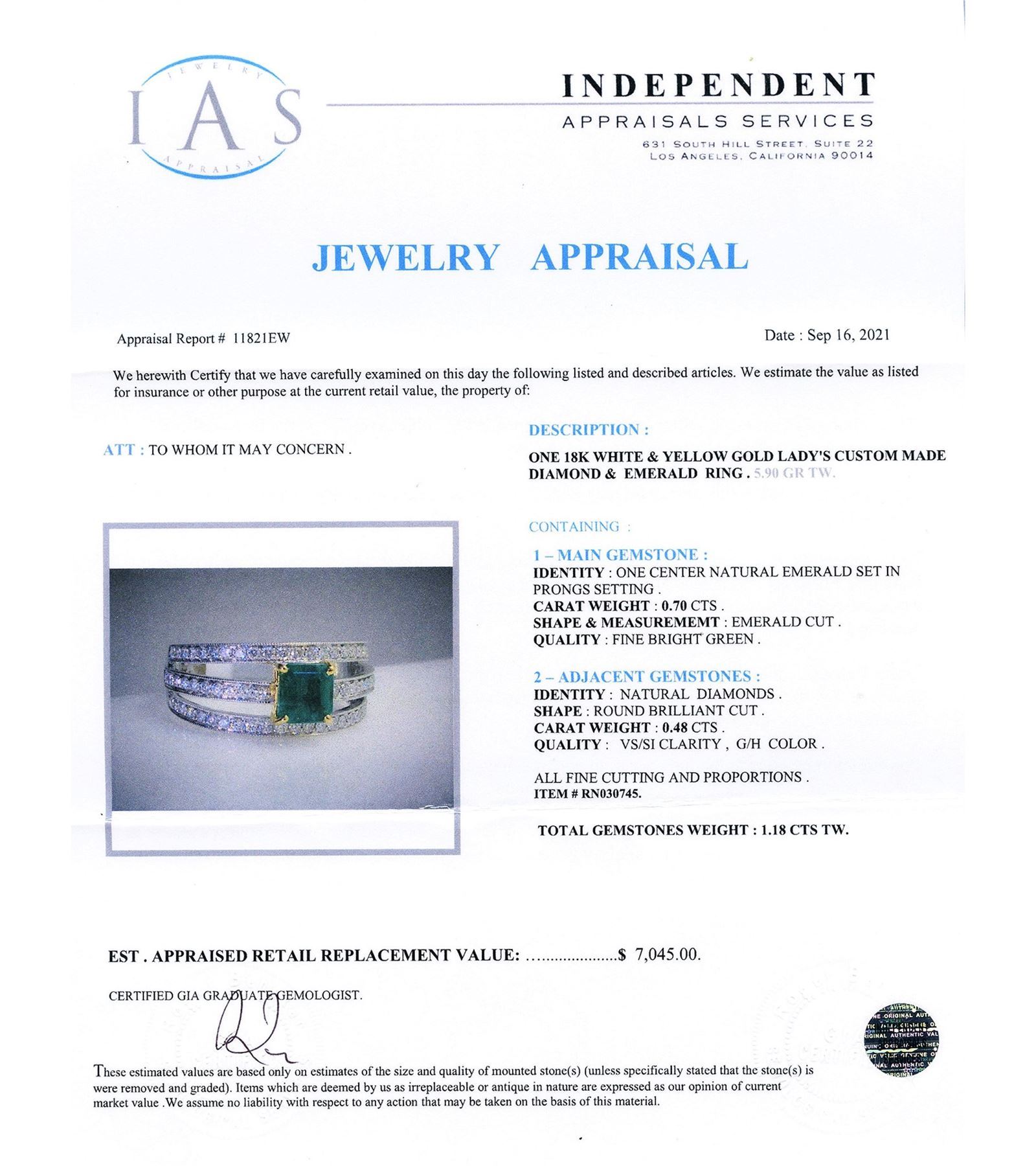 One 18k white and yellow gold lady's custom made diamond and emerald ring #1 - main gemstone:# identity: one center natural emerald set in prongs setting carat weight: 0.70 cts shape and measurememt: emerald cutquality: fine bright green #2 - adjacent gemstones:# identity: natural diamonds shape: round brilliant cut carat weight: 0.48 cts quality: vs/si clarity, g/h color all fine cutting and proportions total gemstonesweight: 1.18 cts tw.