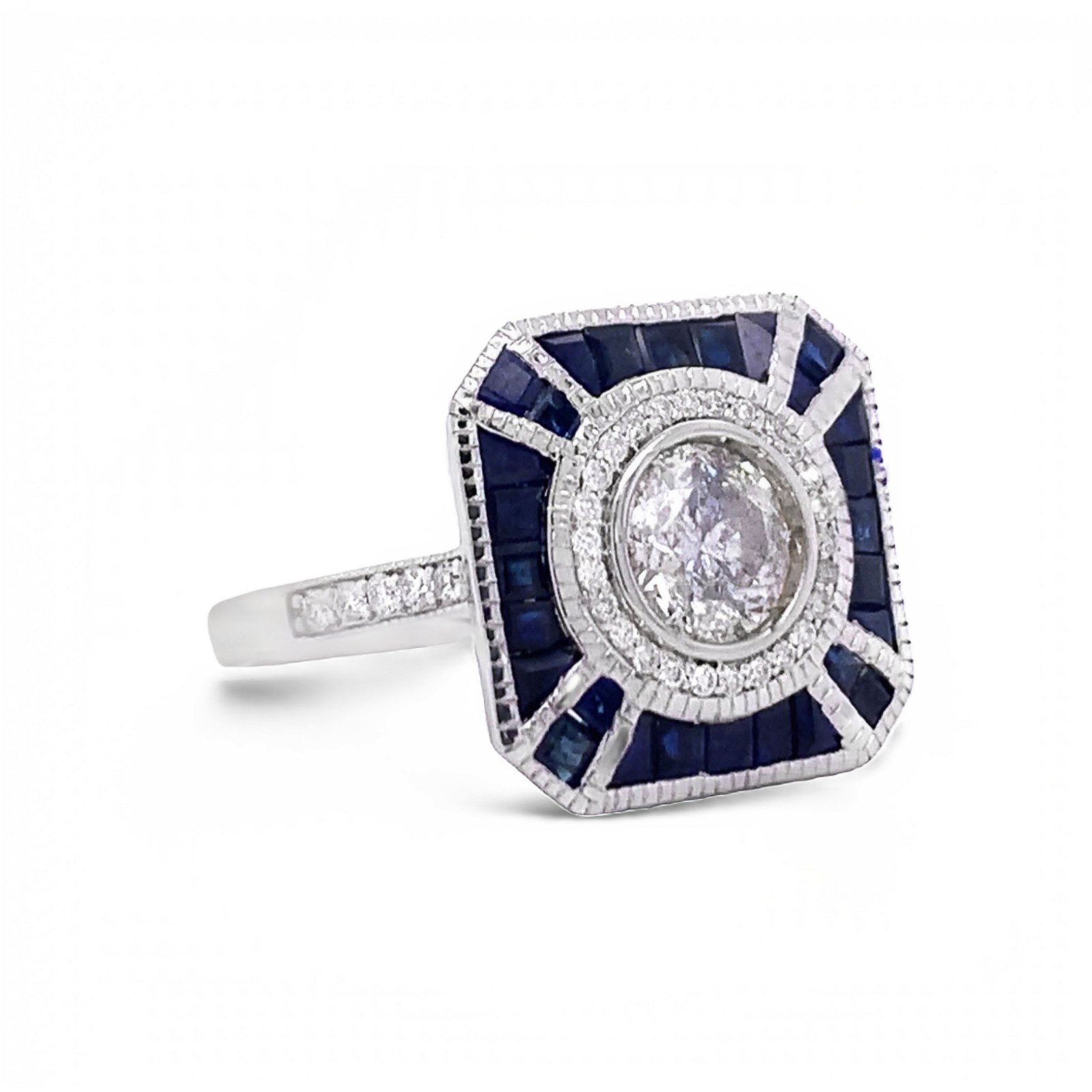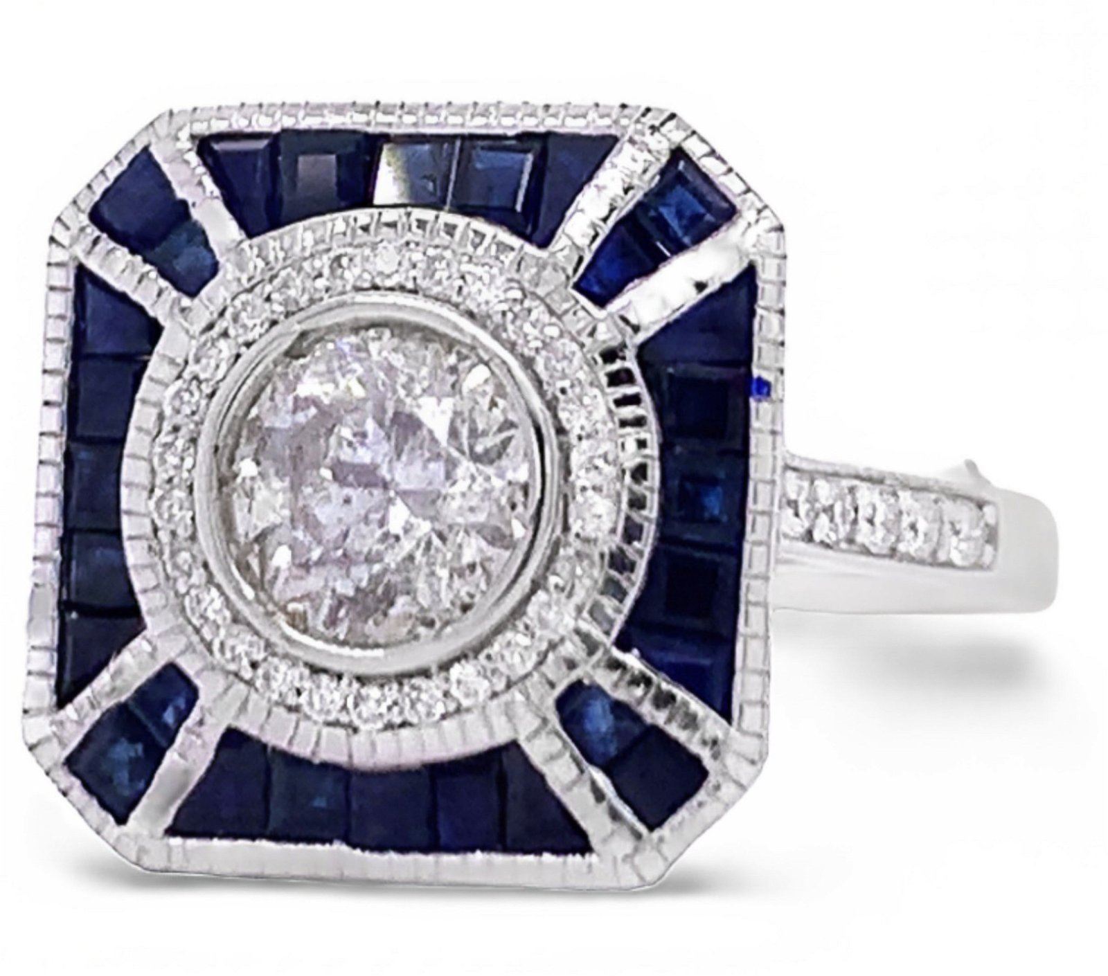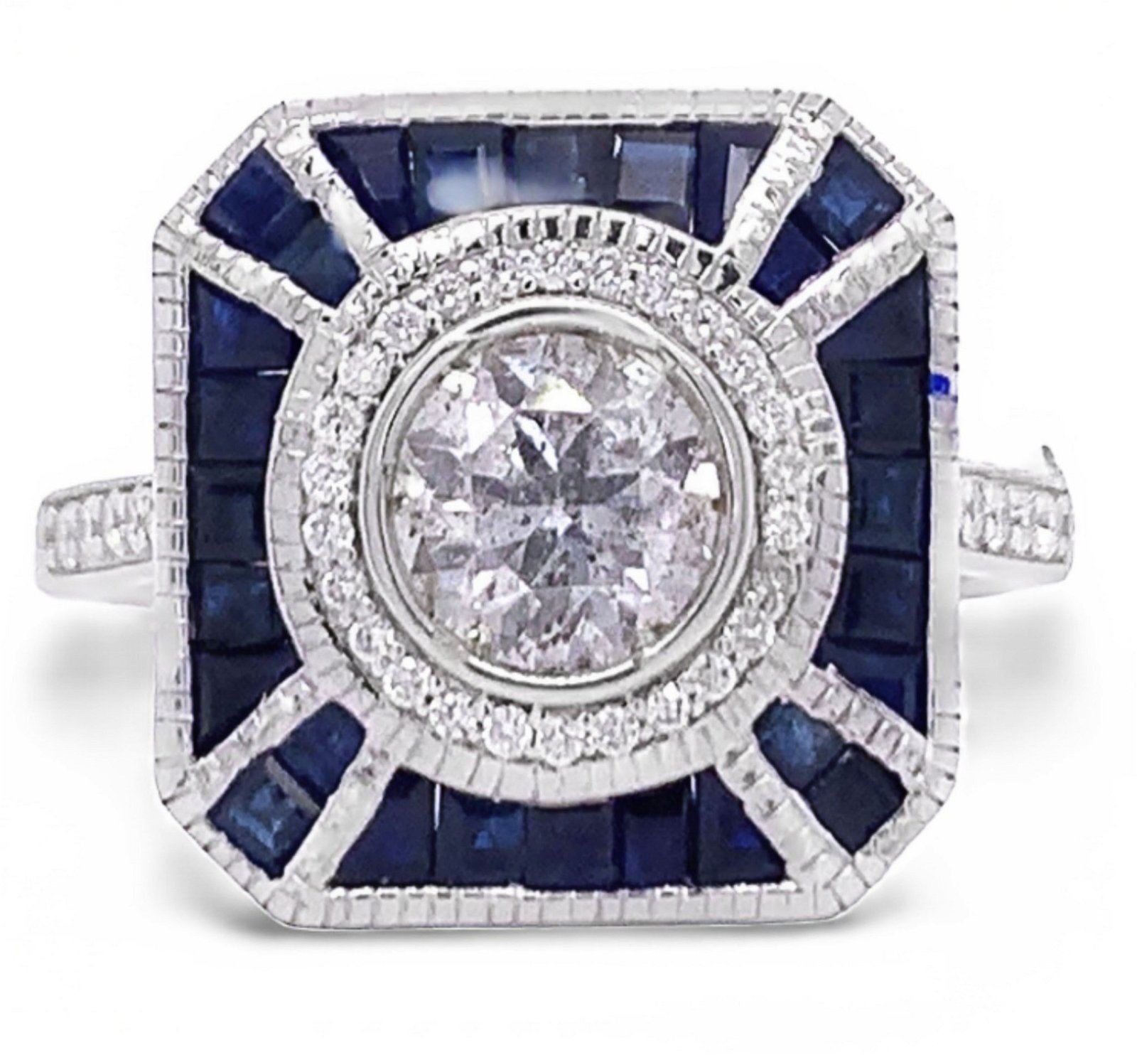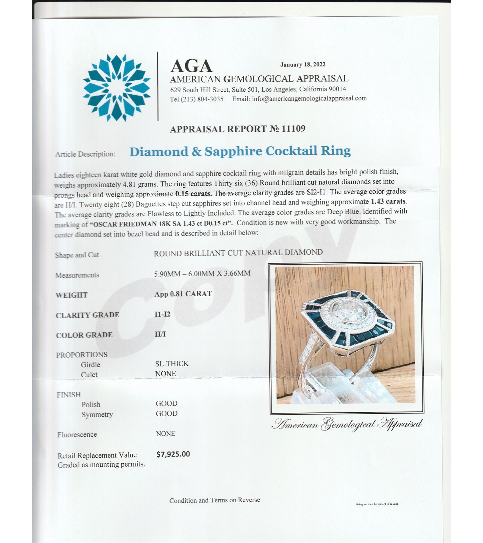 Ladies eighteen karat white gold diamond and sapphire cocktail ring with milgrain details has bright polish finish, weighs approximately 4.81 grams. The ring features Thirty six (36) Round brilliant cut naturaldiamonds set into prongs head and weighing approximate 0.15 carats. The average clarity grades are SI2-I1. The average color grades H/I. Twenty eight (28) Baguettes step cut sapphires set into channel head and weighingapproximate 1.43 carats. The average clarity grades are Flawless to Lightly Included. The average color grades are Deep Blue. Identified with marking of "OSCAR FRIEDMAN 18K SA 1.43 ct D0.15 ct". Condition is newwith very good workmanship. The diamond set into bezel head and is described in detail below Shape and Cut: ROUND BRILLIANT CUT NATURAL DIAMOND Measurements: 5.90mm - 6.00mm x 3.66mm WEIGHT: App 0.81 carat CLARITYGRADE: I1-I2 COLOR GRADE: H/I #PROPORTIONS# Girdle: SL THICK Cutlet: NONE #FINISH# Polish: GOOD Symmetry: GOOD Fluorescence: NONE