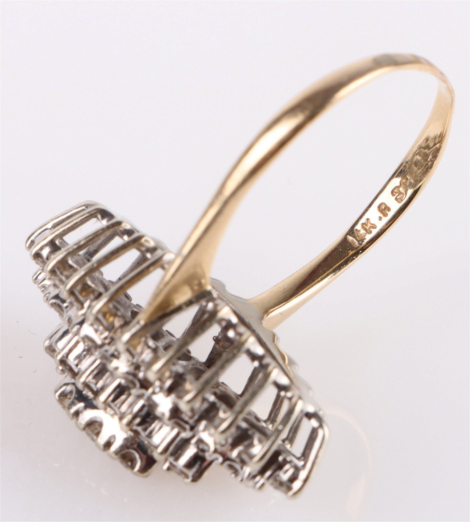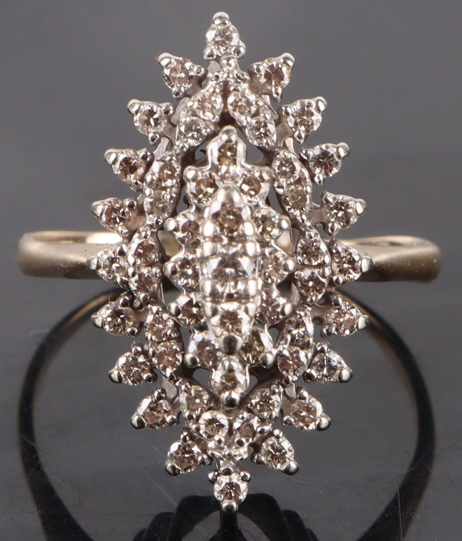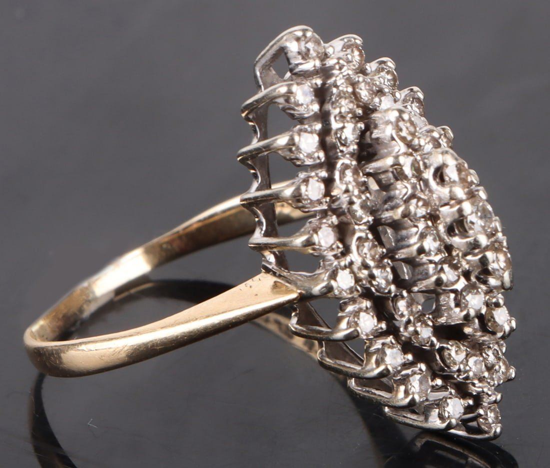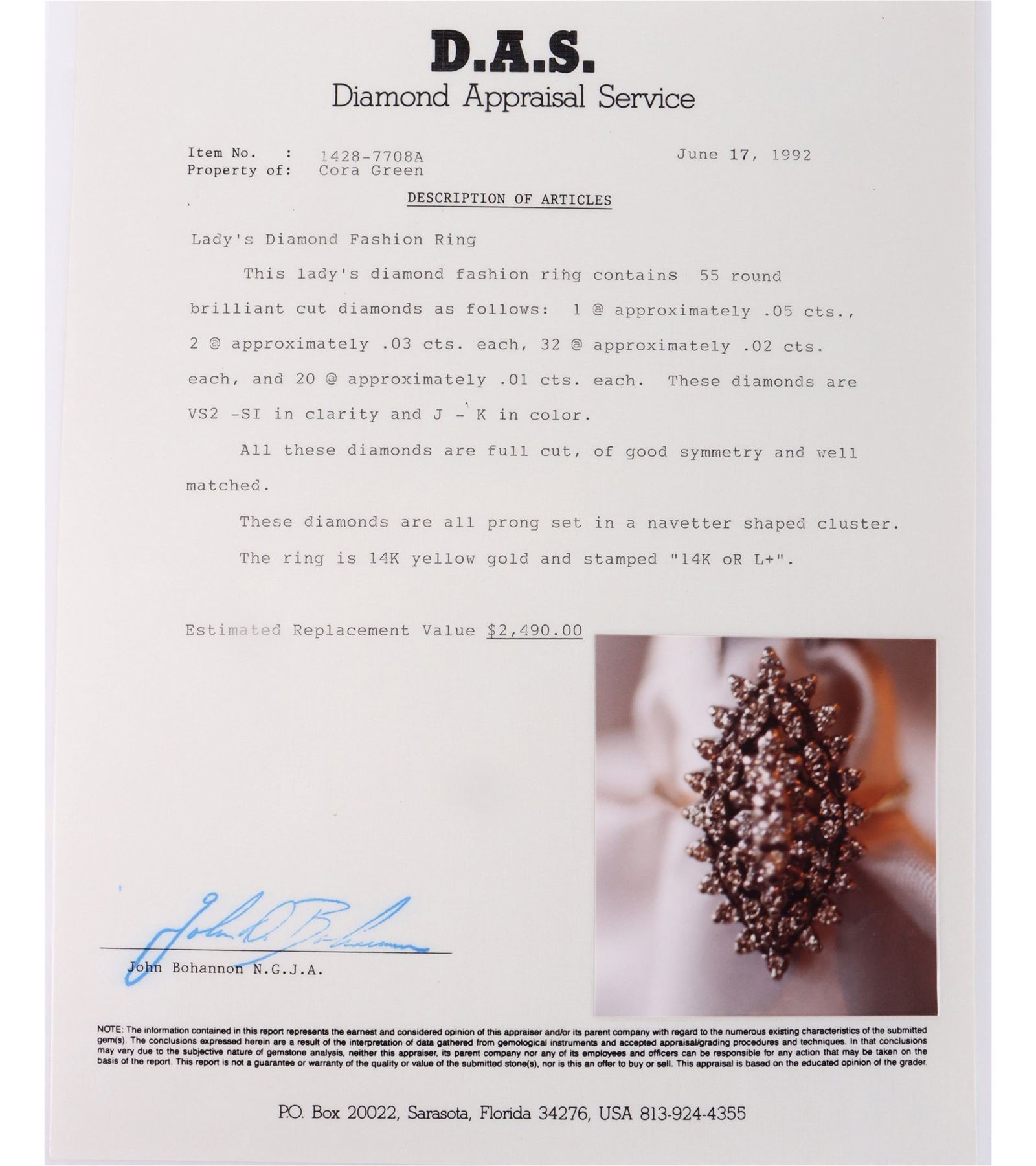 0.95ctw Diamond 14k gold Ladies Fashion Ring w/ Appraissal from 1992. This lady's diamond fashion ring contains: 55 round brilliant cut diamonds as follows: 1 @ approximately .05 cts.,2 @ approximately .03 cts. each, 32 @ approximately .02 cts. each, and 20 @ approximately .01 cts. each. These diamonds are VS2 -SI in clarity and J -'K in color. All these diamonds are full cut, of good symmetry and well matched.These diamonds are all prong set in a navette shaped cluster. The ring is 14K yellow gold and stamped "14Kor L+". Includes appraisal from DAS.