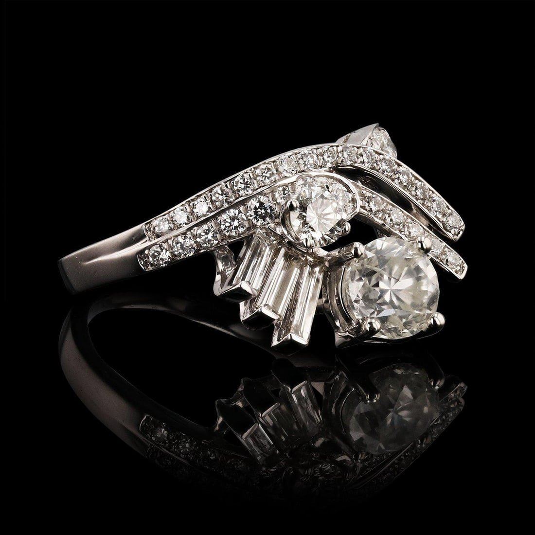 Platinum Diamond Ring One polished, stamped, and tested platinum ring with a bright finish. The ring is mounted with 1 genuine diamond center stone weighing approximately 1.01 carat, and 43 genuinefaceted diamonds weighing approximately 0.84 carats. This item weighs 7.3 grams, condition is new, excellent workmanship. MAIN GEMSTONE Identity: Natural Diamond Shape: Round Cutting Style: Brilliant Cut AverageDiameter: 5.9 mm Depth: 4.2 mm Weight: 1.01 carat Color Grade: F Clarity Grade: I1 Cut Grade: Very Good Refractive Index: 2.417 Hardness: 10 ADJACENT GEMSTONES ON RING Identity: Natural Diamond Cut: Baguette /Round Brilliant Quantity: 43 Diamonds Measurements: 4.0 - 5.0 mm (3 baguette) 1.0 - 2.7 mm (40 round) Total Weight: 0.84 carats Color Grade: E - F Clarity Grade: VS2 to S12 Refractive Index: 2.418 Hardness: 10 CENTERDIAMOND WEIGHT: 1.01ct TOTAL DIAMOND WEIGHT: 1.85ctw WEIGHT OF ITEM: 7.3 grams METAL: Platinum