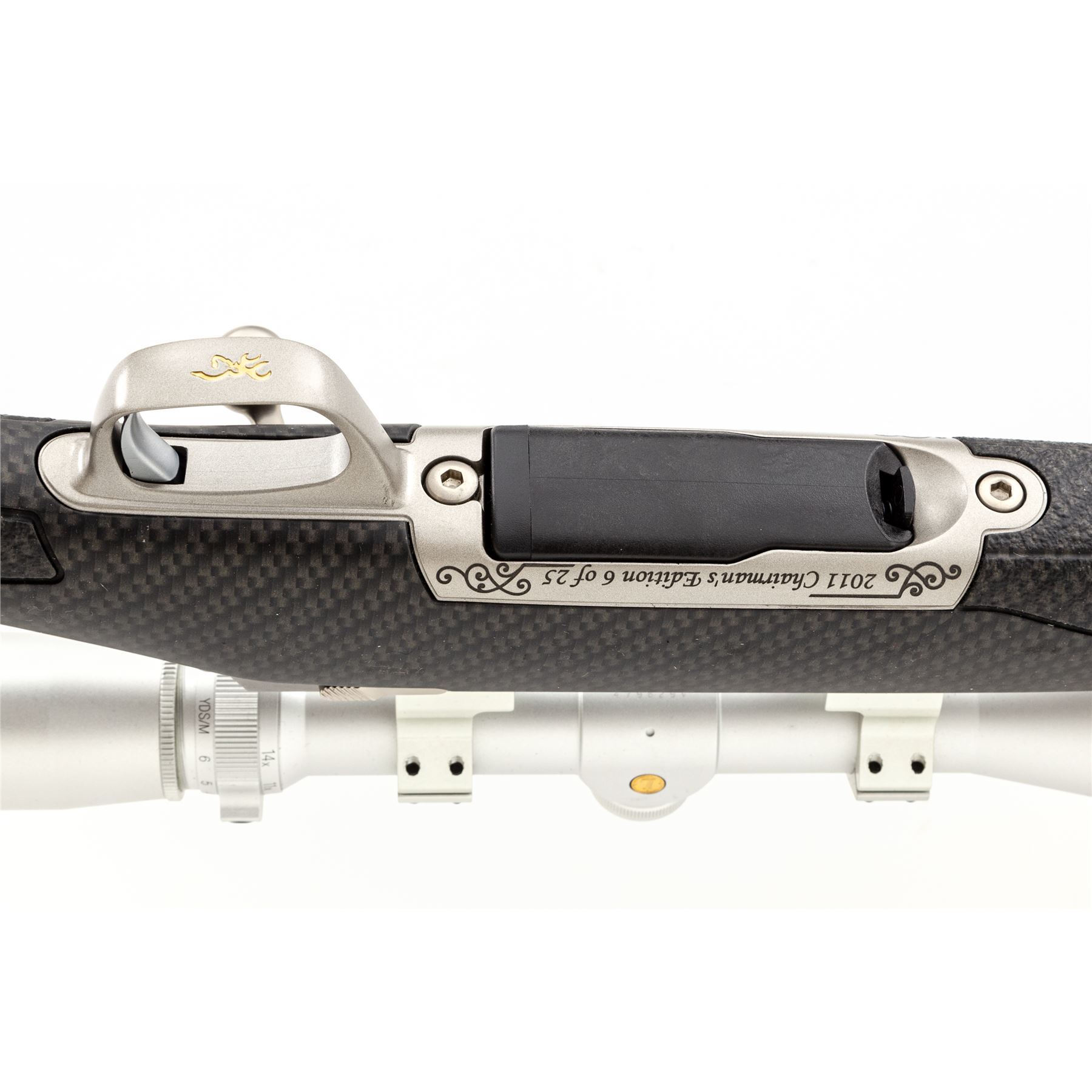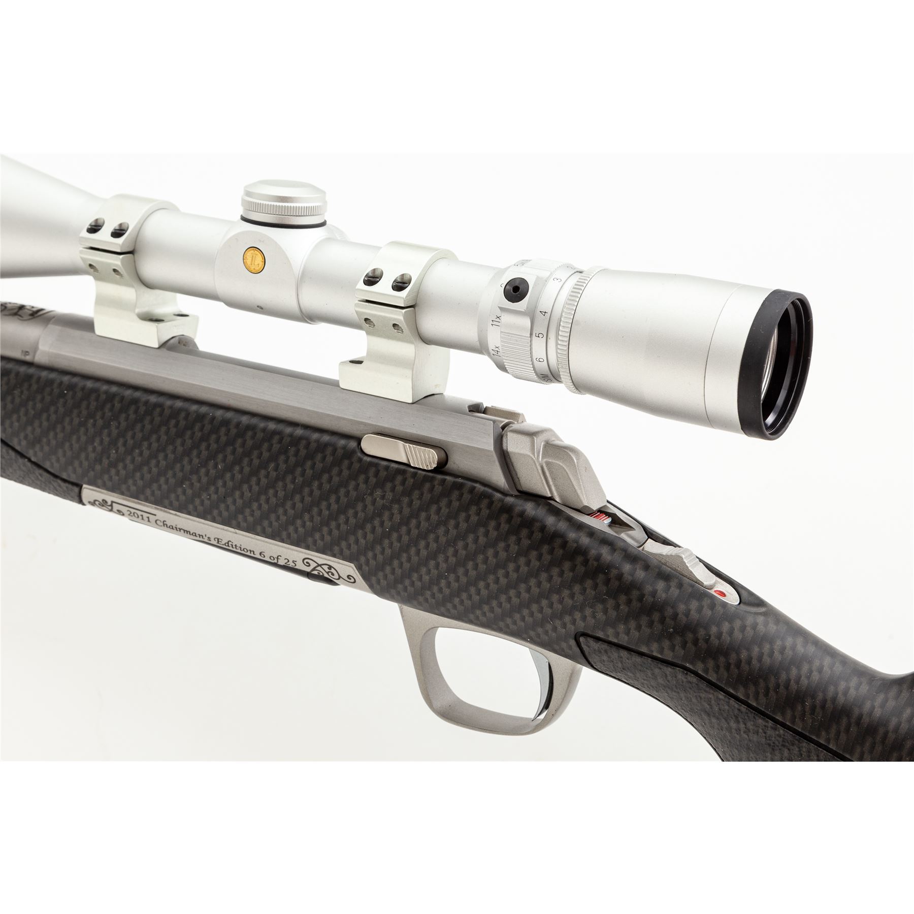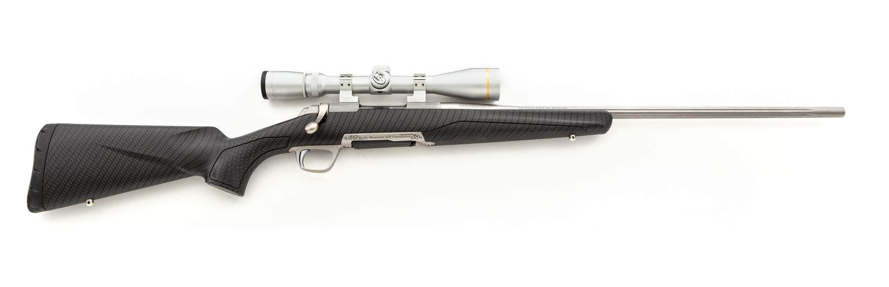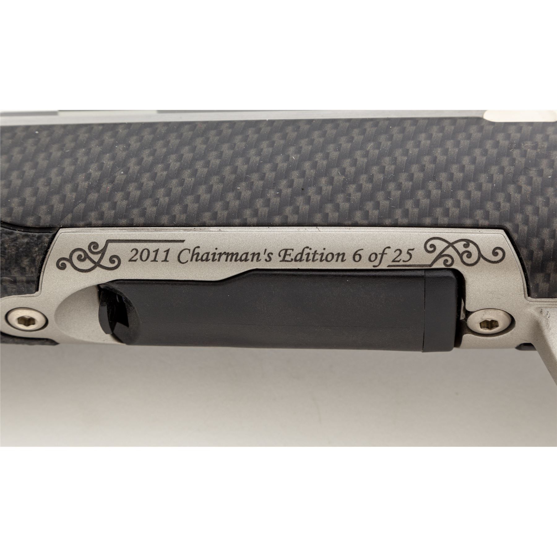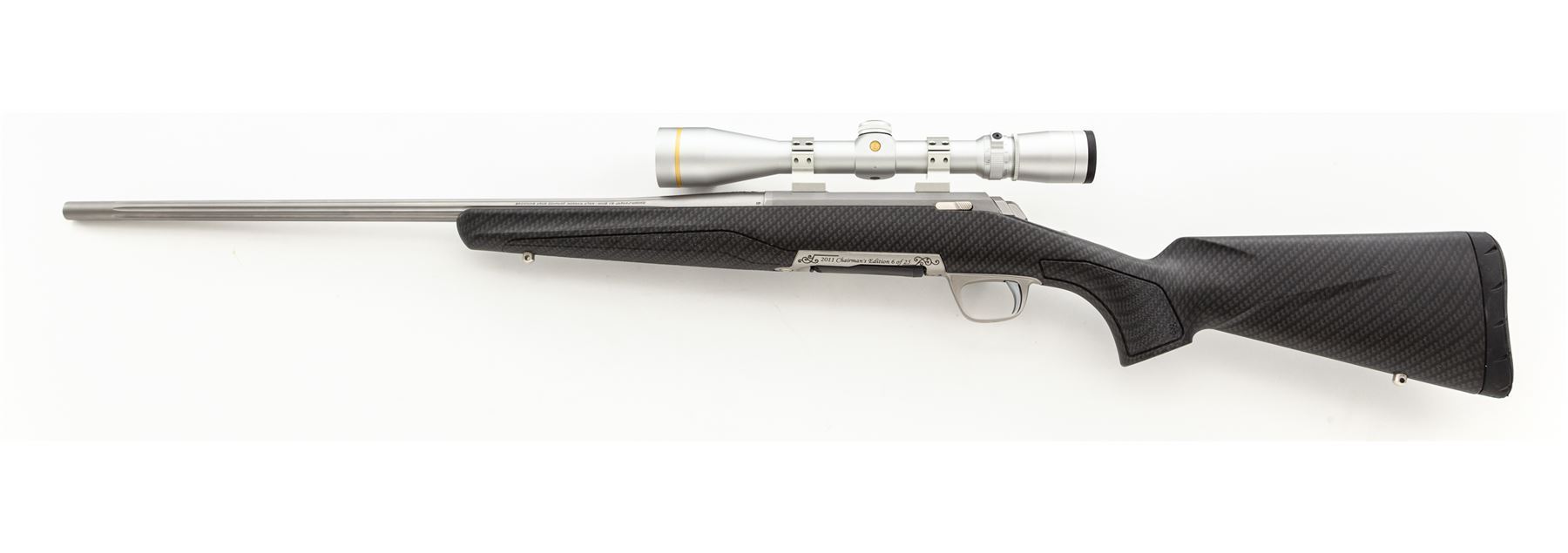 1 of only 25 Chairman Jeff Cade Edition Browning X-Bolt Stainless Stalker Rocky Mountain Elk Foundation Commemorative Bolt Action Rifles, with Leupold Scope, #61563ZM354, .300 WSM cal., 23'' fluted free-floating barrel, matte stainless finish. The black and gray composite pistol-grip stock is textured at the grip and forend with a black rubber Inflex recoil pad, and stainless sling swivel studs, with a detachable rotary magazine and tang mounted safety that also locks the bolt; mfg'd without sights. Top of barrel near the receiver with simple scroll engraving and RMEF logo; edges of the magazine well with simple scrollwork and one side reads ''Rocky Mountain Elk Foundation'', other side ''2011 Chairman's Edition 6 of 25''. Bolt body with a facsimile of Chairman Jeff Cade's signature. Topped with a Leupold VX-3 4.5-14x40mm scope with duplex reticle, 1'' tube, matte silver finish, and soft Leupold cover. These Limited Edition commemorative rifles were often auctioned off at RMEF events in order to raise money for the RMEF. Included is the original box and paperwork for the scope; owner's manual, gun lock, and end of the cardboard box with the end label for the rifle. Rifle is in excellent overall condition, metal surfaces appear as new. Stock is also excellent with a few light scuffs and shallow impressions to the left side. Action is smooth, bore is mirror bright. Scope is as new with crystal clear optics. Est.: $1,200-$1,800. (Modern)