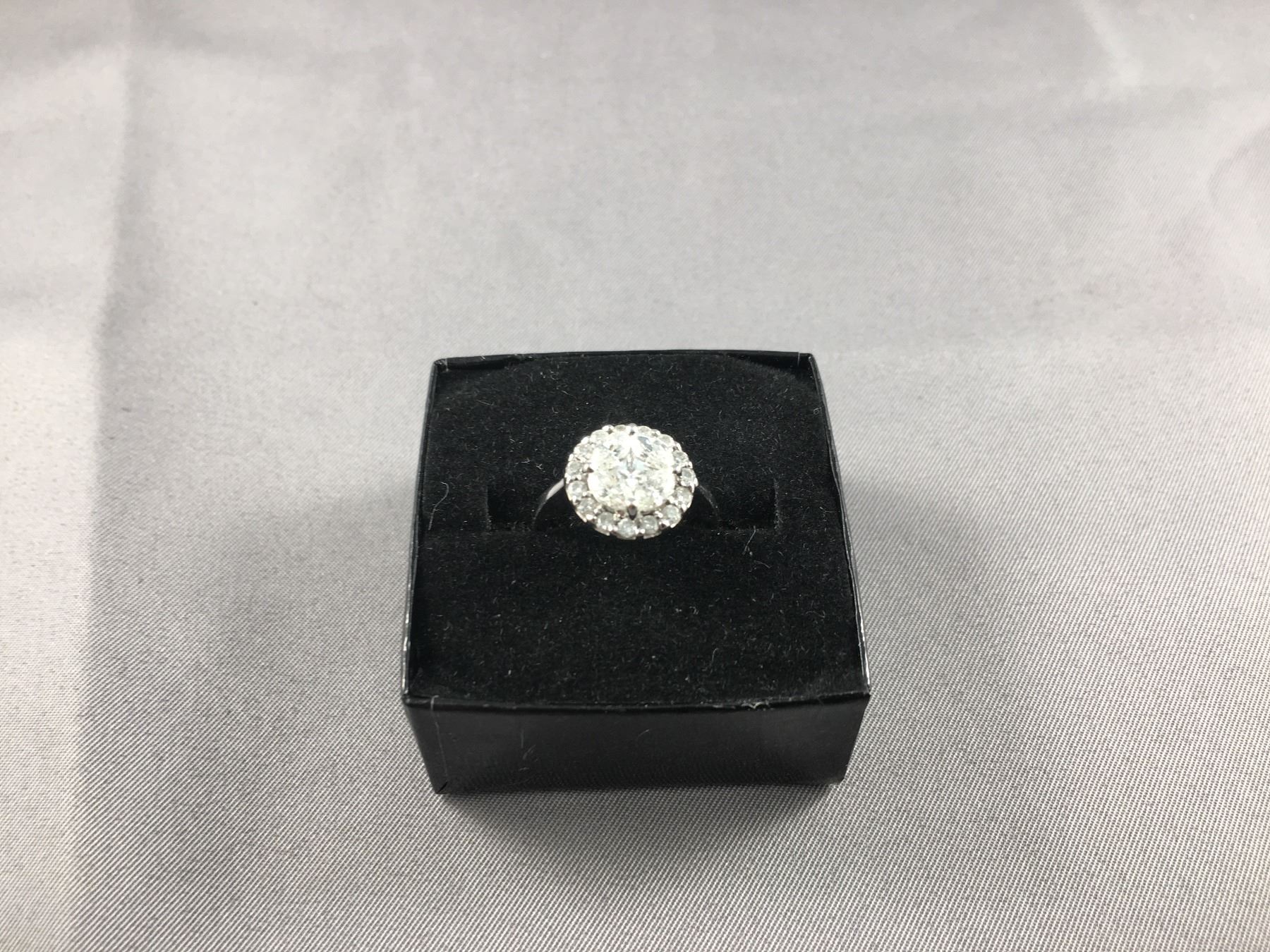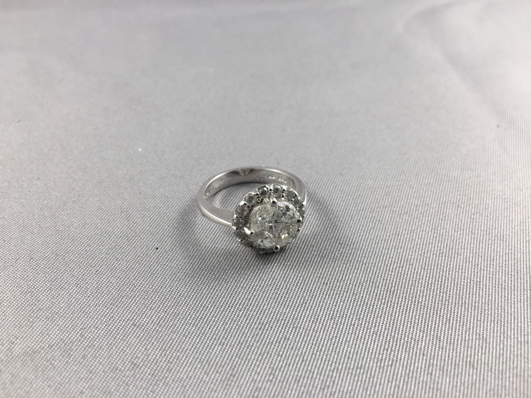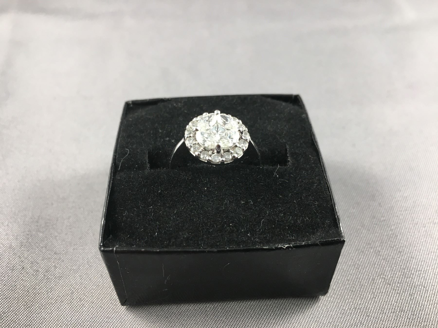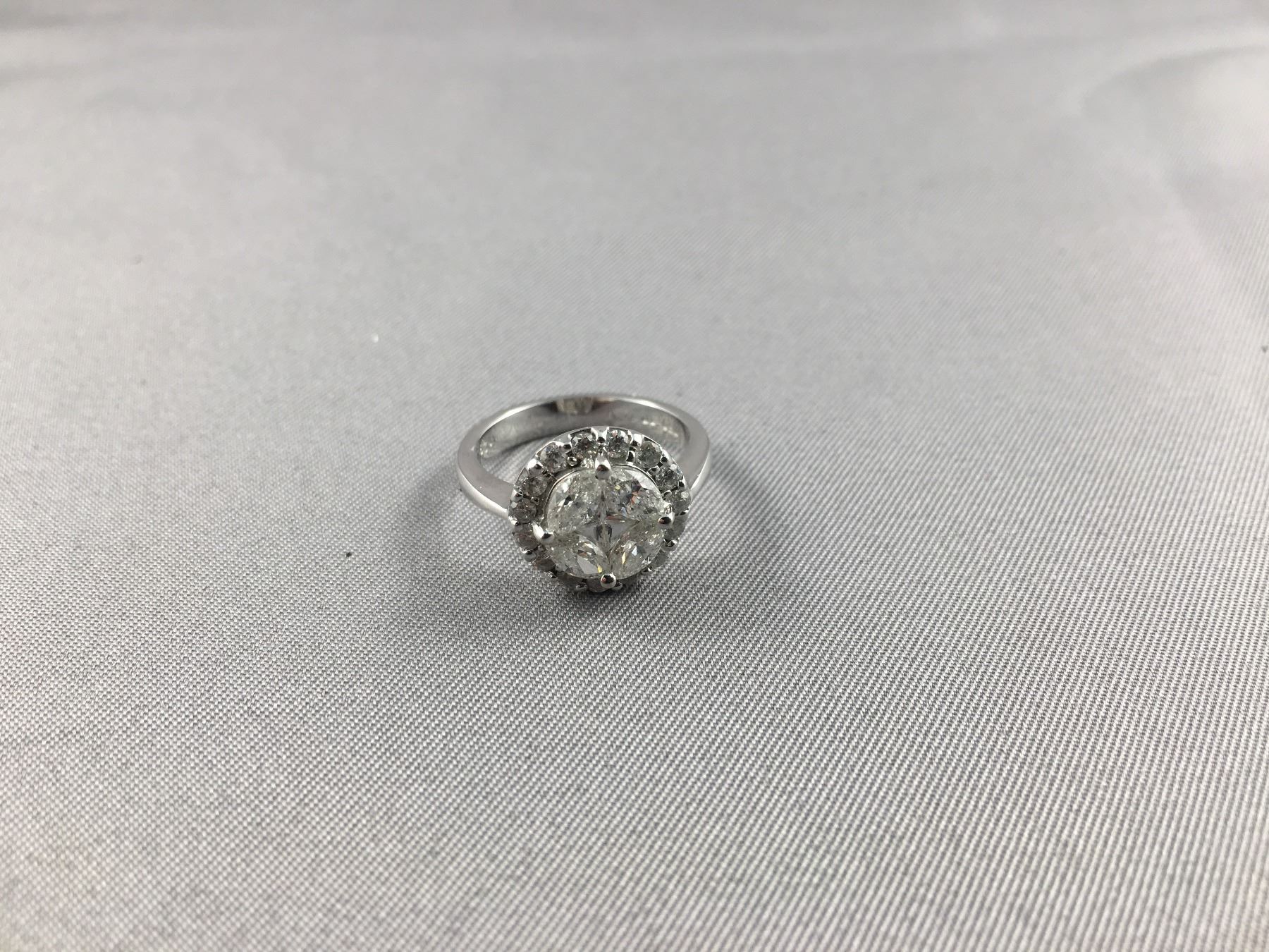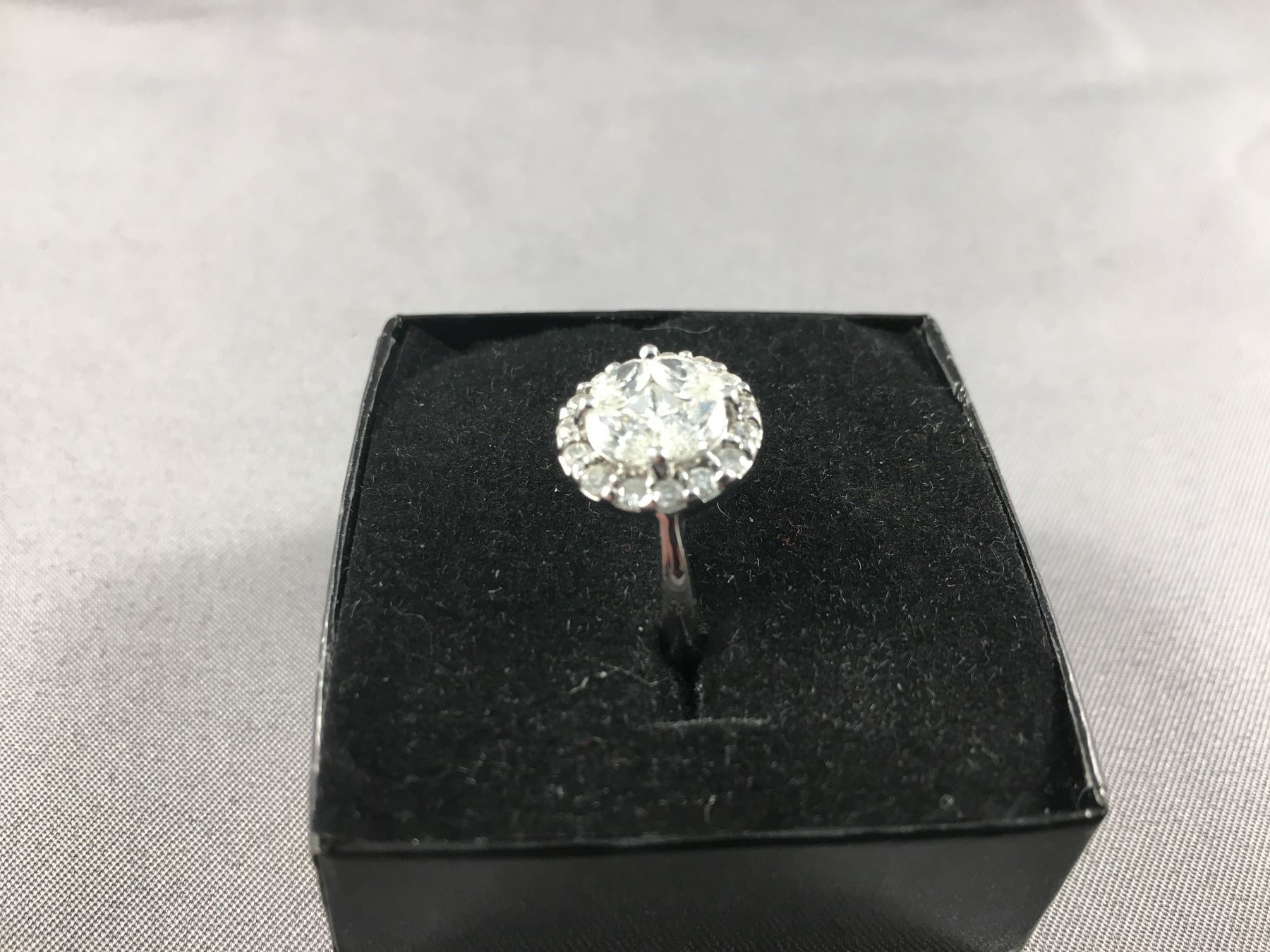 1 PIECE TTL. 1 - LADIES 18KT WHITE GOLD DIAMOND SET ENGAGEMENT OR DRESS RING, HALO CLUSTER, 15 BRILLIANT DIA. 0.33CARAT, CLARITY II 1, COLOUR I, CUT MEDIUM, 4 MARQUISE BRILLIANT DIAMONDS, 0.83CARAT, CLARITY SI 2 & SI 3, COLOUR J, CUT GOOD, 1 PRINCESS DIAMOND APPROX 0.13CARAT, SI 2, COLOUR I, CUT GOOD, DIA WEIGHT APPROX 1.29 CARAT, APPROX RING WEIGHT 4.40 GRAMS, REPL VALUE $3,200.00