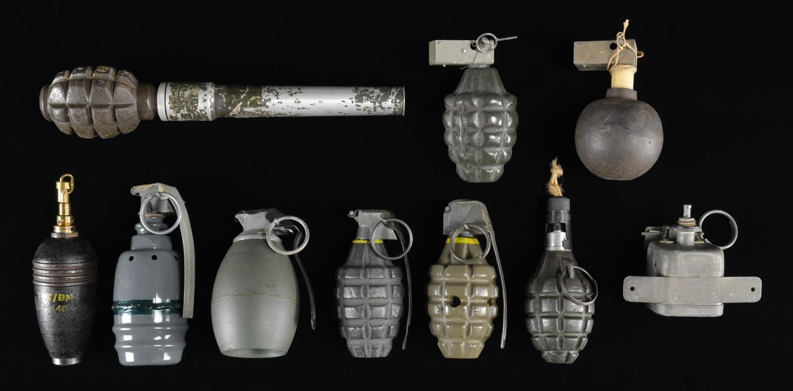 These 10 grenades have various body shapes of iron, sheet metal & plastic. More are unmarked & unidentified, however; lot includes: