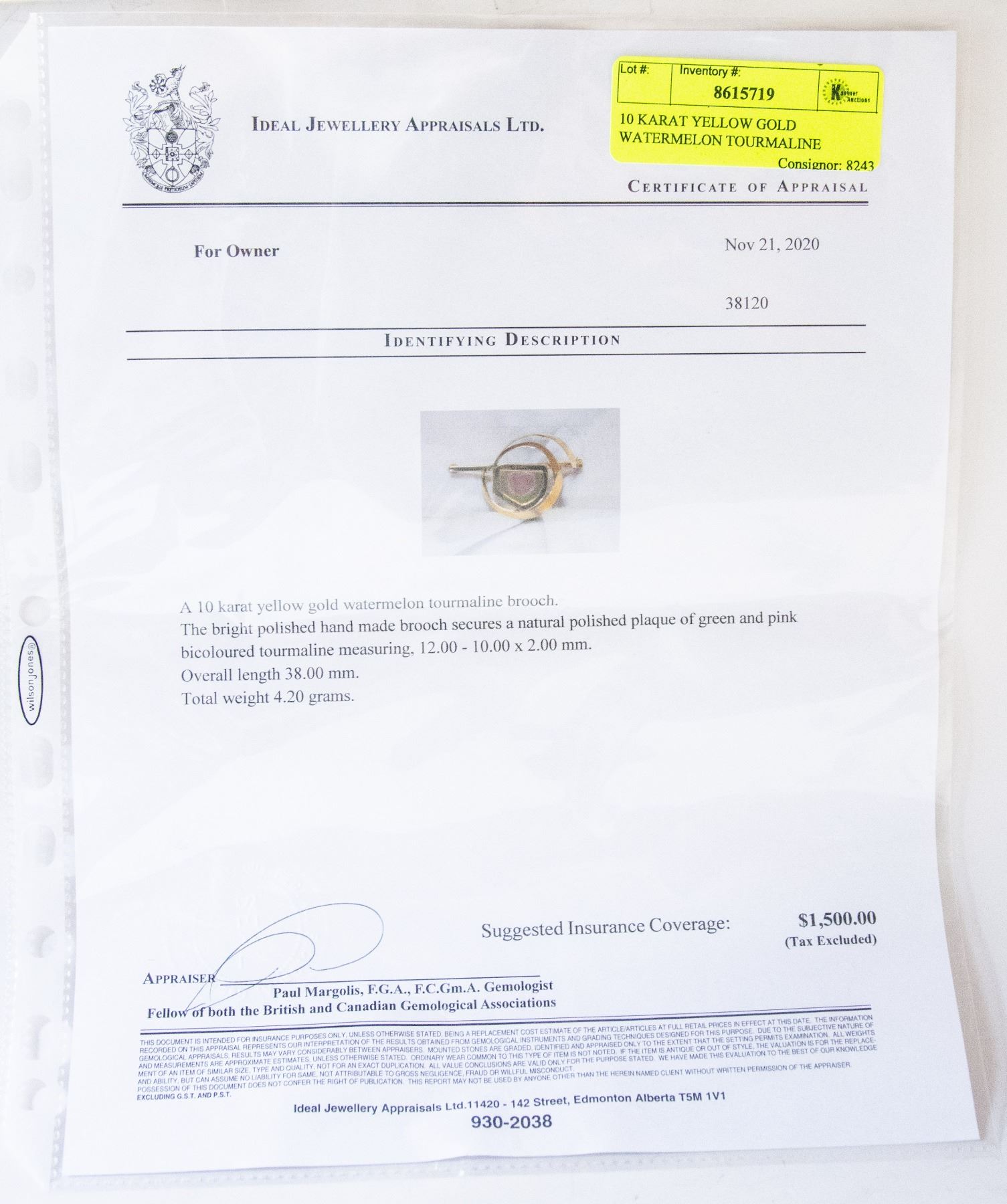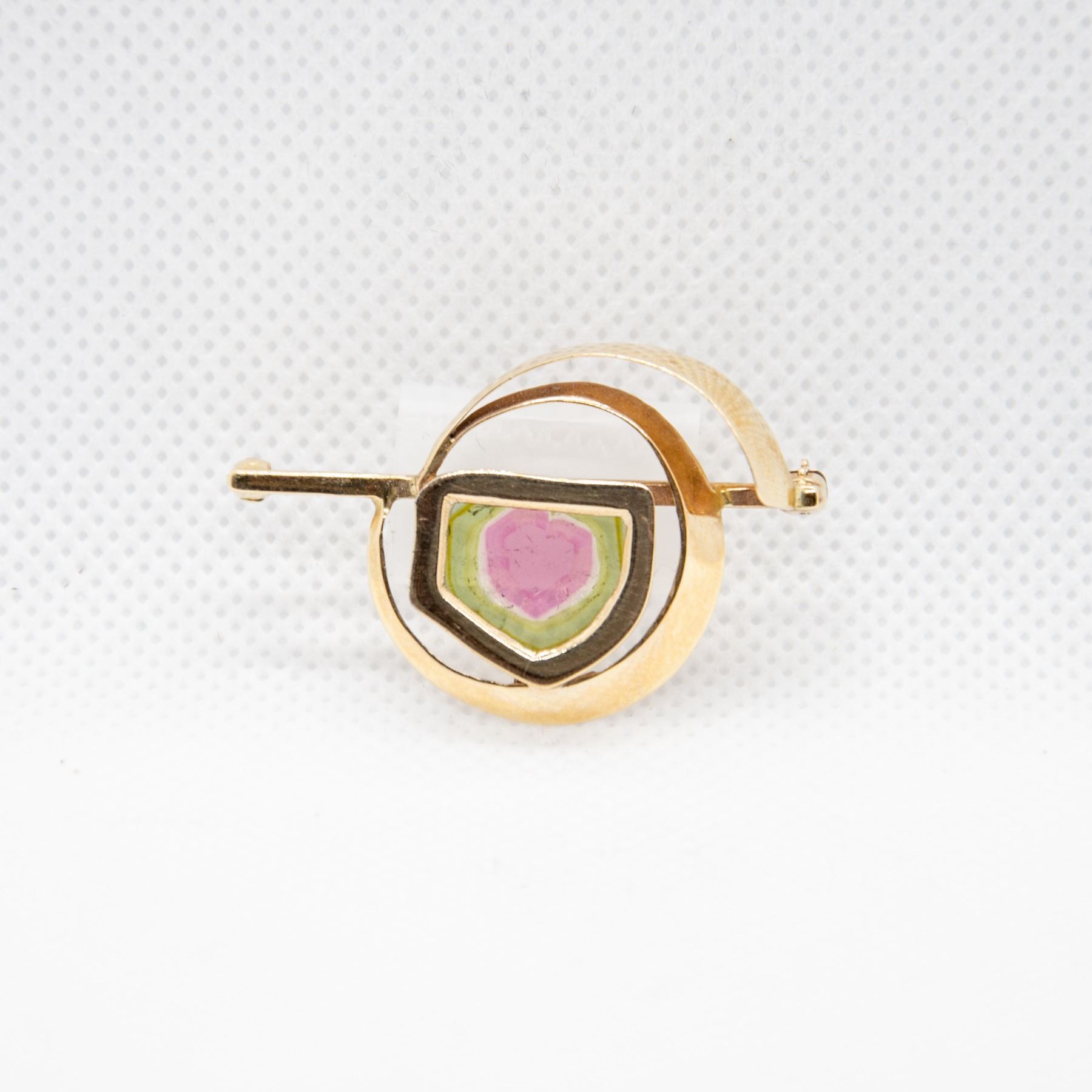10 KARAT YELLOW GOLD WATERMELON TOURMALINE BROACH