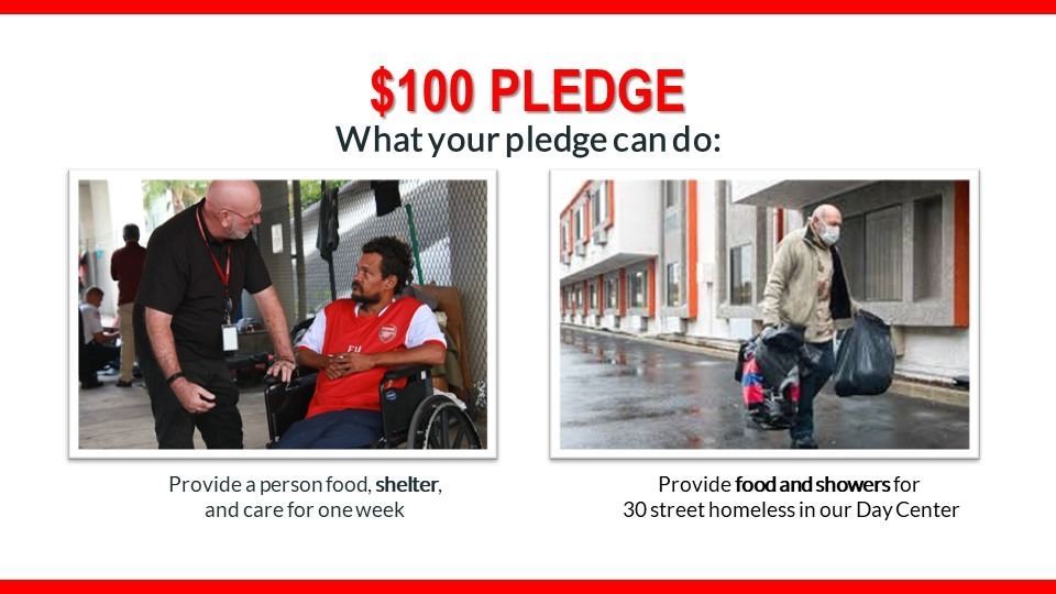 Your $100 pledge can help provide a person food, shelter, and care for one week