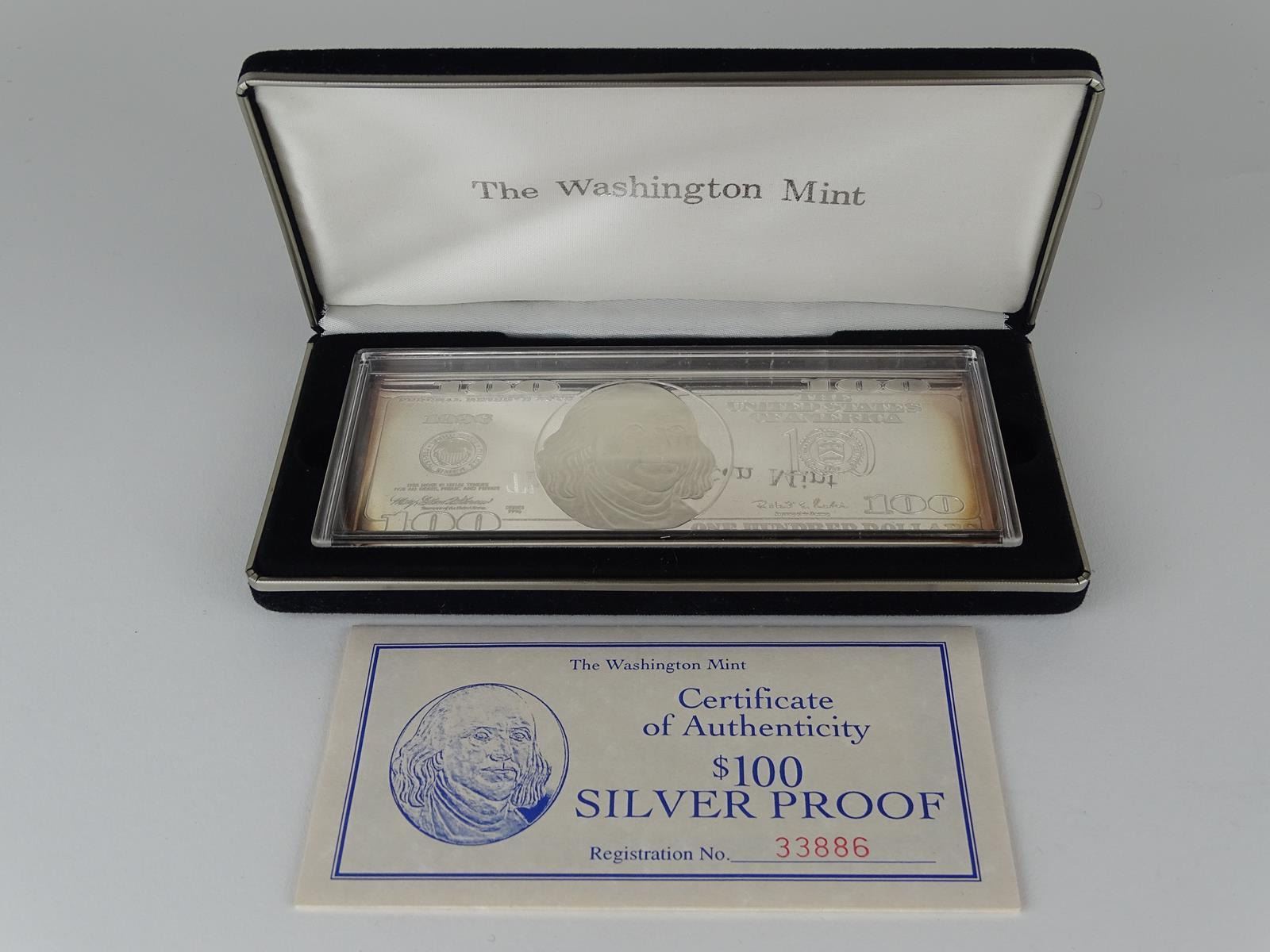 WASHINGTON MINT, .999 FINE SILVER WITH CERTIFICATE IN FELT BOX.