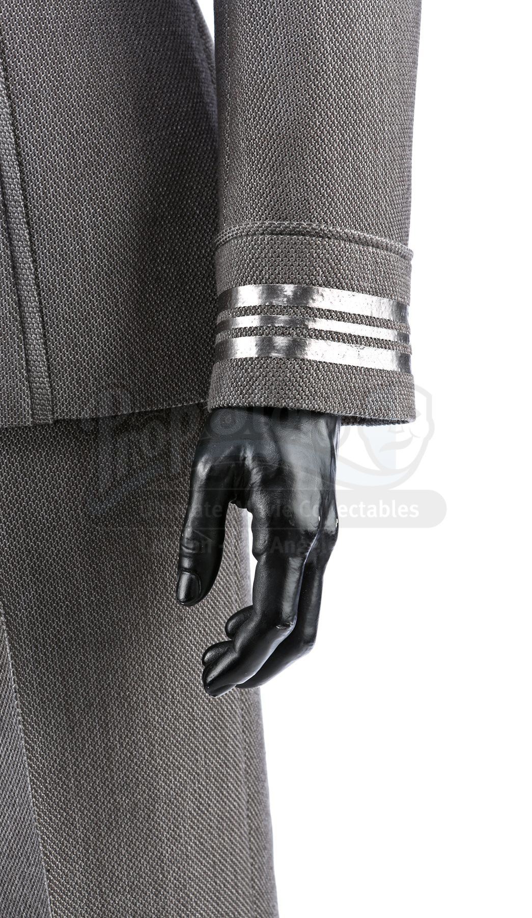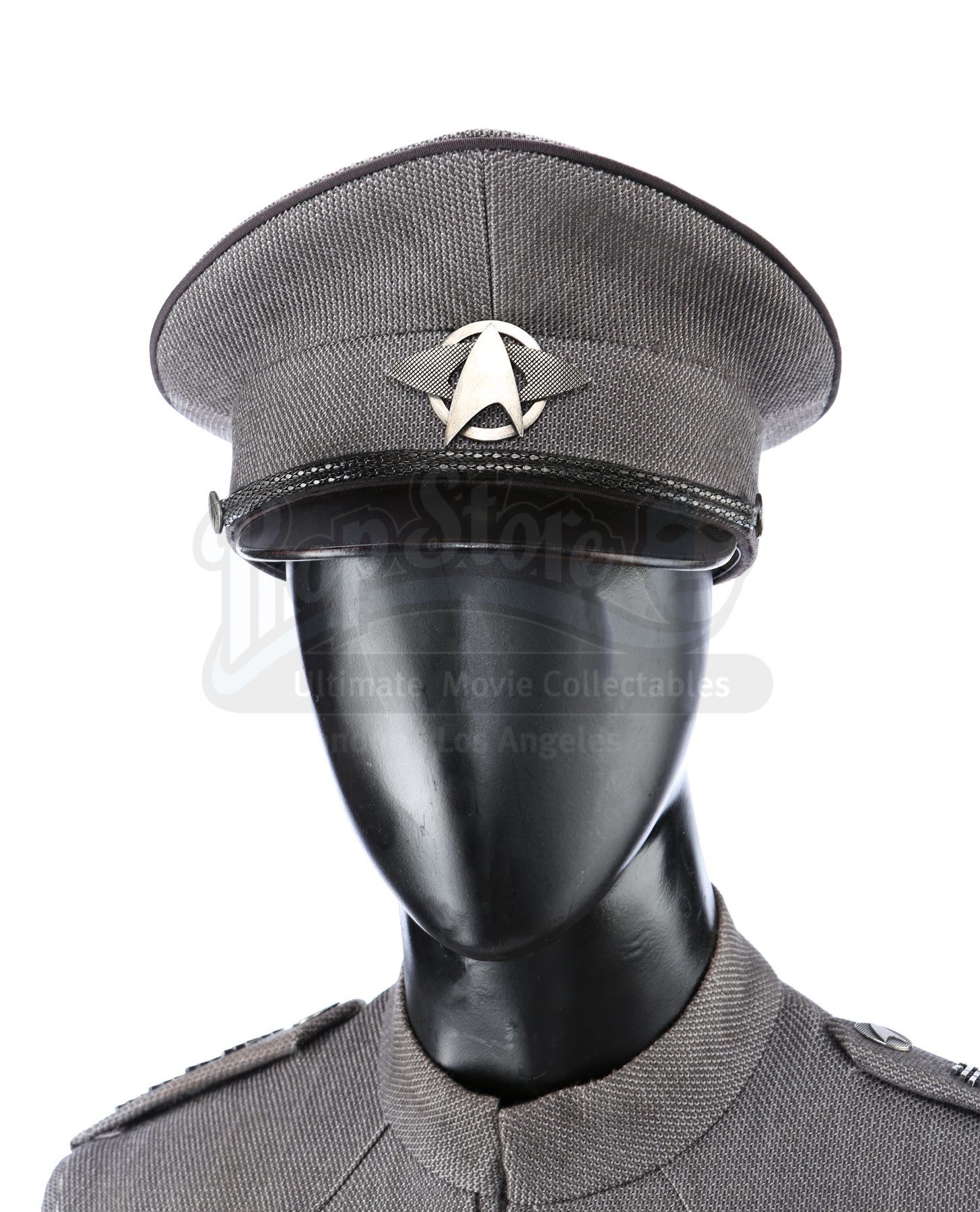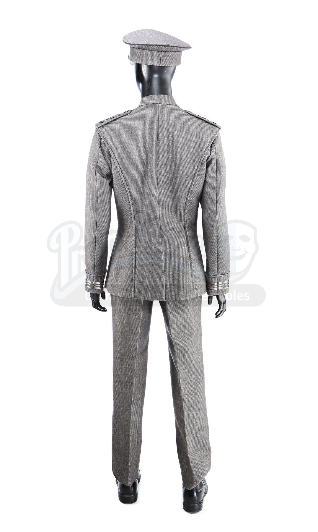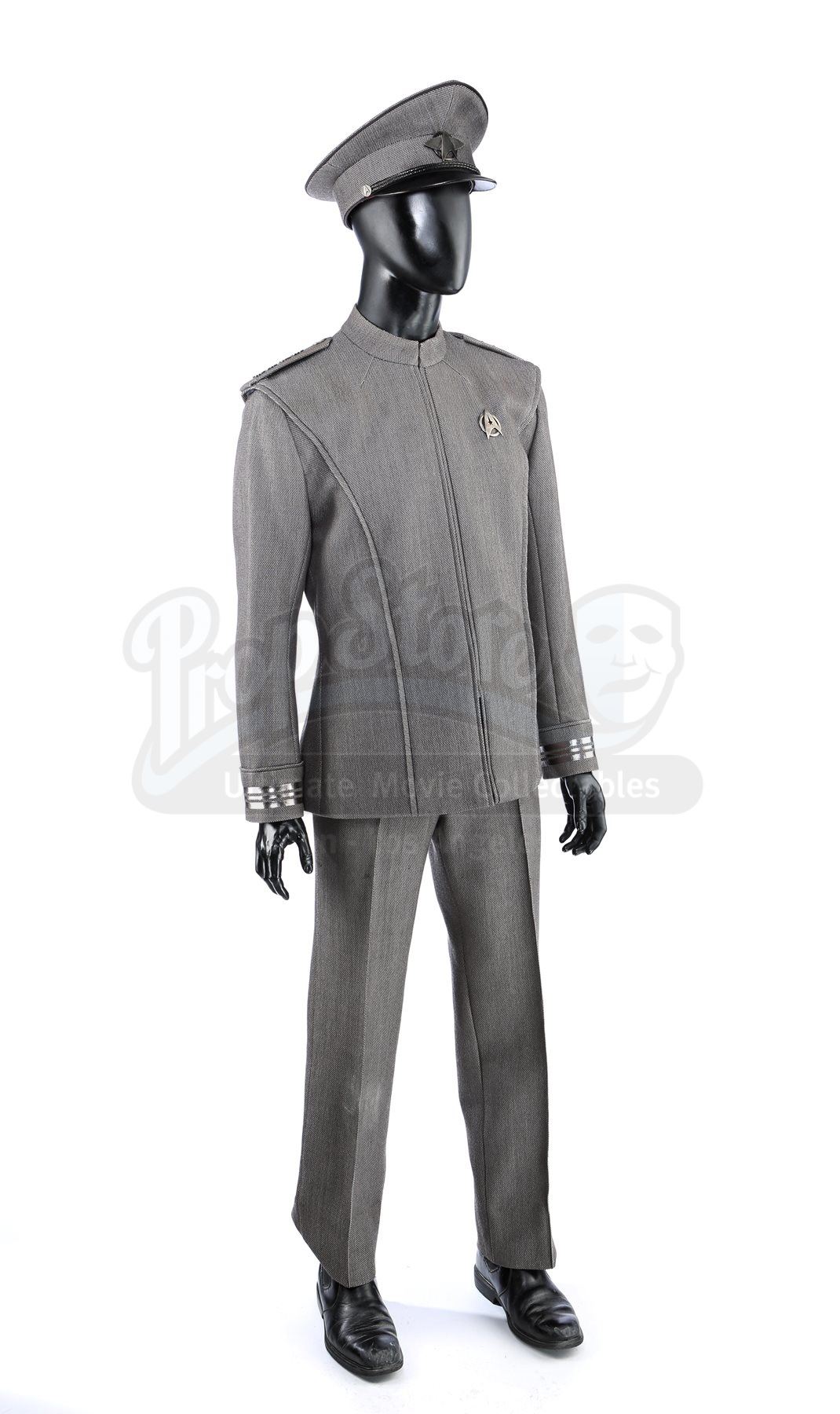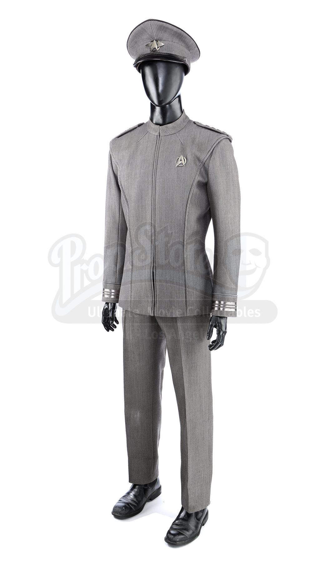 Captain Kirk's double Starfleet dress uniform from Star Trek Into Darkness. Kirk wore his dress uniform in the conference room when Starfleet headquarters was attacked. The costume consists of a jacket (marked size 42), pants (marked size 34) with suspenders, a cap, and a pair of boots (marked U.S. size 10M). The grey jacket and pants are made of bird's eye-patterned linen, with the jacket featuring epaulets on each shoulder and a Starfleet command pin on the left breast. The jacket features three silver bands on the wrists. The peaked-style cap is made of the same material and features metal Starfleet pins attached to the front. Also included is a pair of black leather boots with rubber soles.The costume includes hand-written wardrobe labels in the jacket, pants and boots all marked "KIRK DBL". Also included are wardrobe tags with hand-written notes about the costume. Estimate: $3000 - 5000*Estimated sale price; sold without reserve.