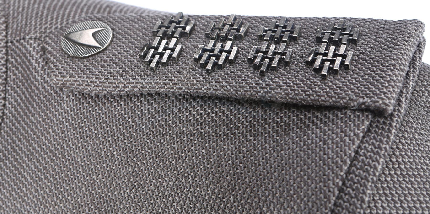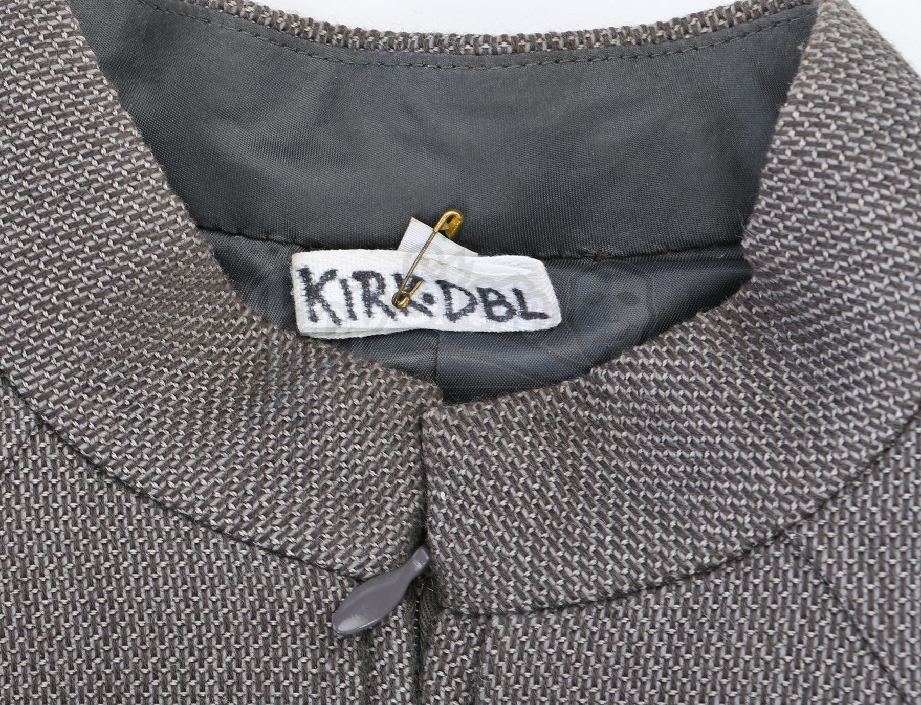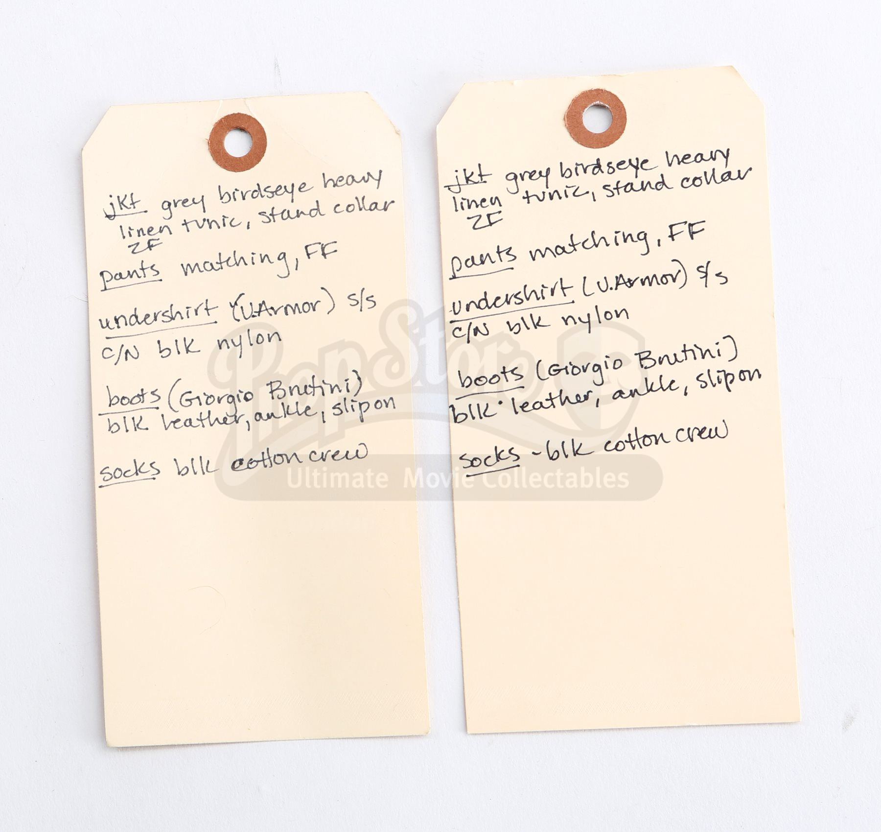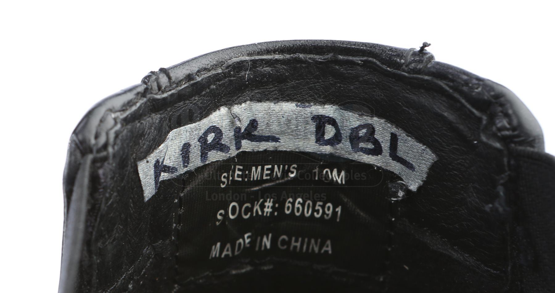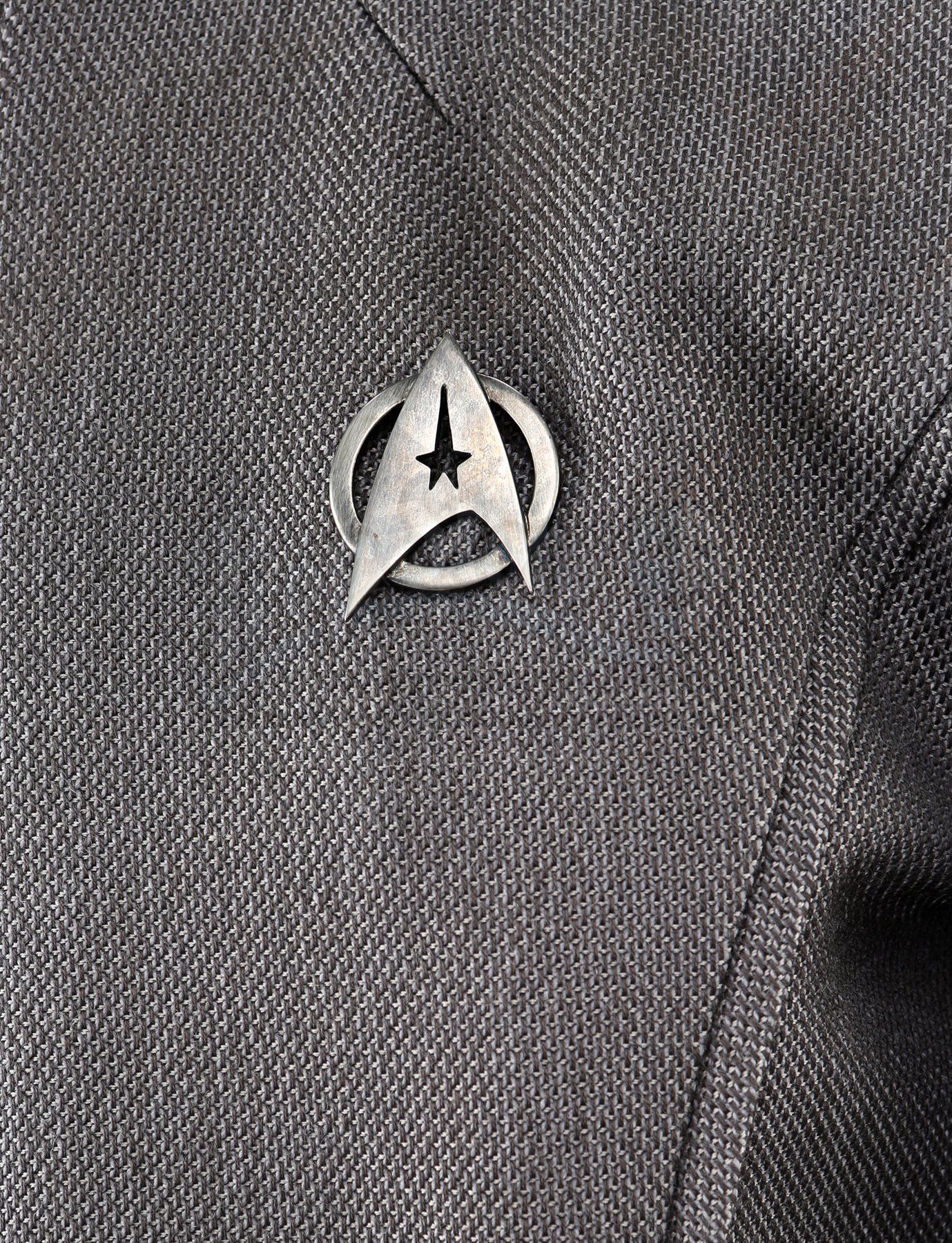 Captain Kirk's double Starfleet dress uniform from Star Trek Into Darkness. Kirk wore his dress uniform in the conference room when Starfleet headquarters was attacked. The costume consists of a jacket (marked size 42), pants (marked size 34) with suspenders, a cap, and a pair of boots (marked U.S. size 10M). The grey jacket and pants are made of bird's eye-patterned linen, with the jacket featuring epaulets on each shoulder and a Starfleet command pin on the left breast. The jacket features three silver bands on the wrists. The peaked-style cap is made of the same material and features metal Starfleet pins attached to the front. Also included is a pair of black leather boots with rubber soles.The costume includes hand-written wardrobe labels in the jacket, pants and boots all marked "KIRK DBL". Also included are wardrobe tags with hand-written notes about the costume. Estimate: $3000 - 5000*Estimated sale price; sold without reserve.