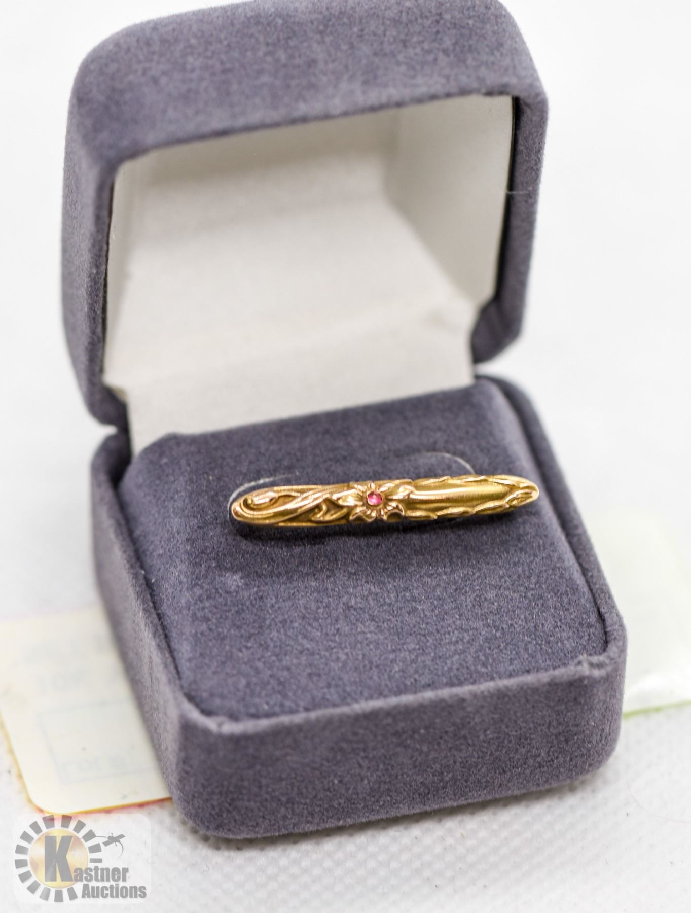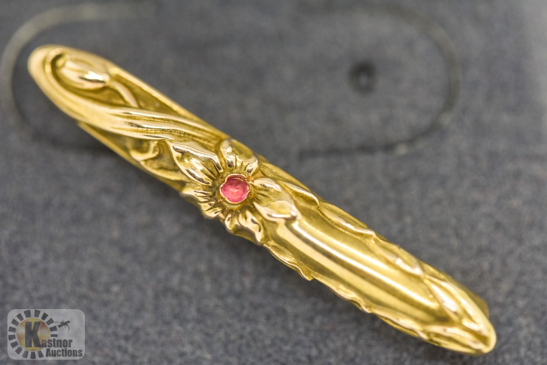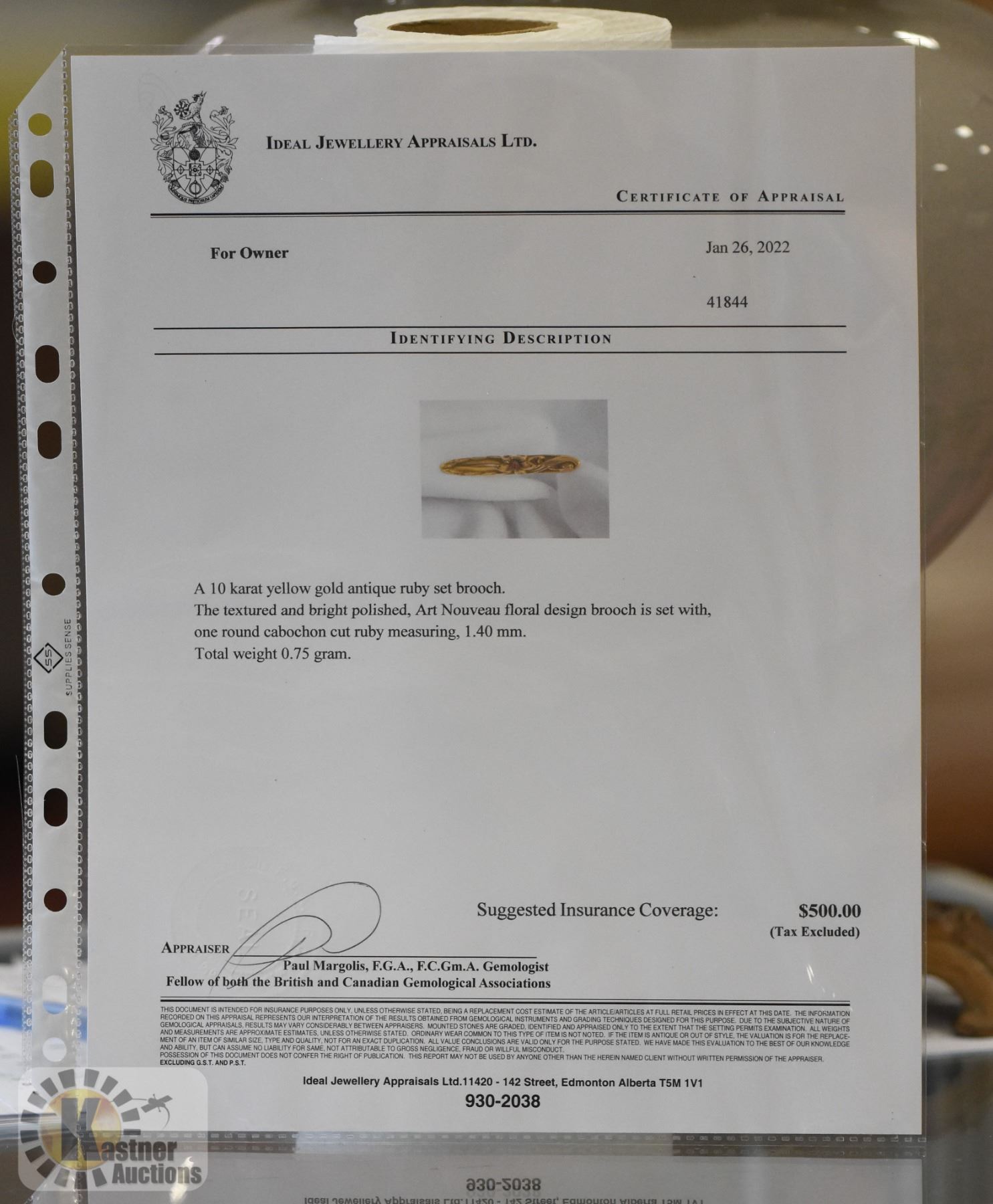 ART NOUVEAU FLORAL DESIGN BROOCH SET WITH ONE ROUND CAOCHON CUT RUBY. COMES WITH CERTIFICATE OF AUTHENTICITY, APPRAISED AT $500.00