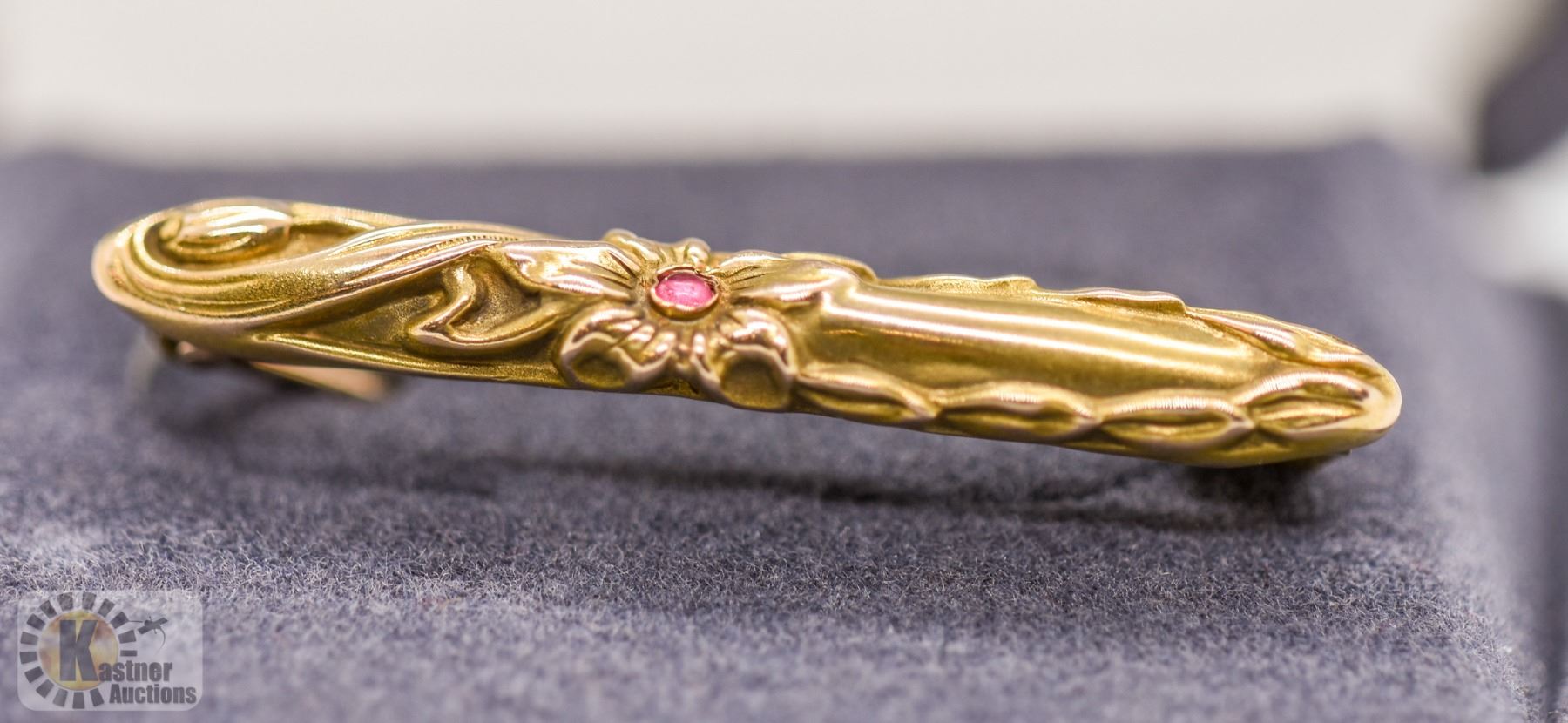 ART NOUVEAU FLORAL DESIGN BROOCH SET WITH ONE ROUND CAOCHON CUT RUBY. COMES WITH CERTIFICATE OF AUTHENTICITY, APPRAISED AT $500.00