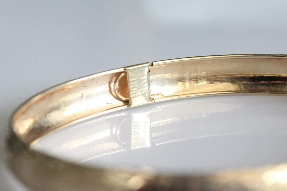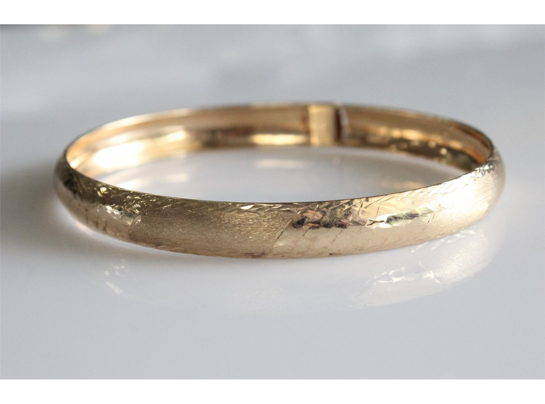 Stamped 10K yellow gold bangle bracelet with alternating engraved/brushed finish pattern. Box clasp with safety. Weighs approximately 2.8 grams. 7.5 mm width. 2.6" wrist diameter.