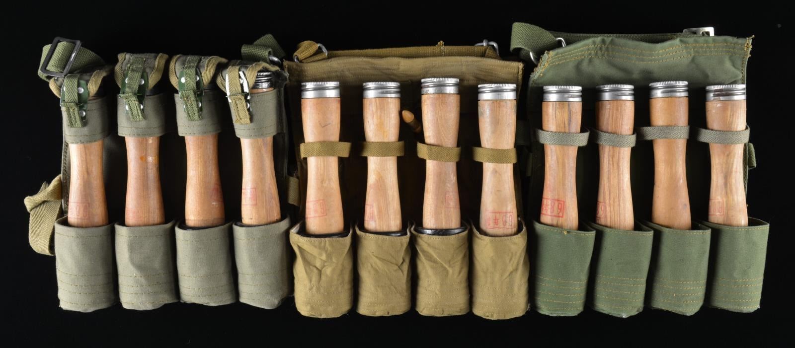 Overall about 8" w/ black or red painted metal heads. Wooden handles w/ red painted markings. Metal screw caps at end of handles. Canvas pouches w/ covers for tops & caps w/ shoulder straps. CONDITION: appears good to very good w/ light wear. (02-16241-1/MD). $200-400.
