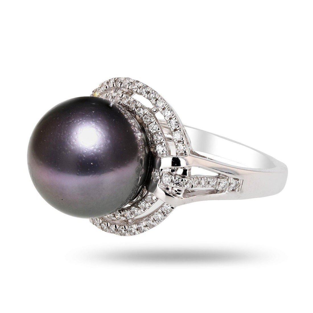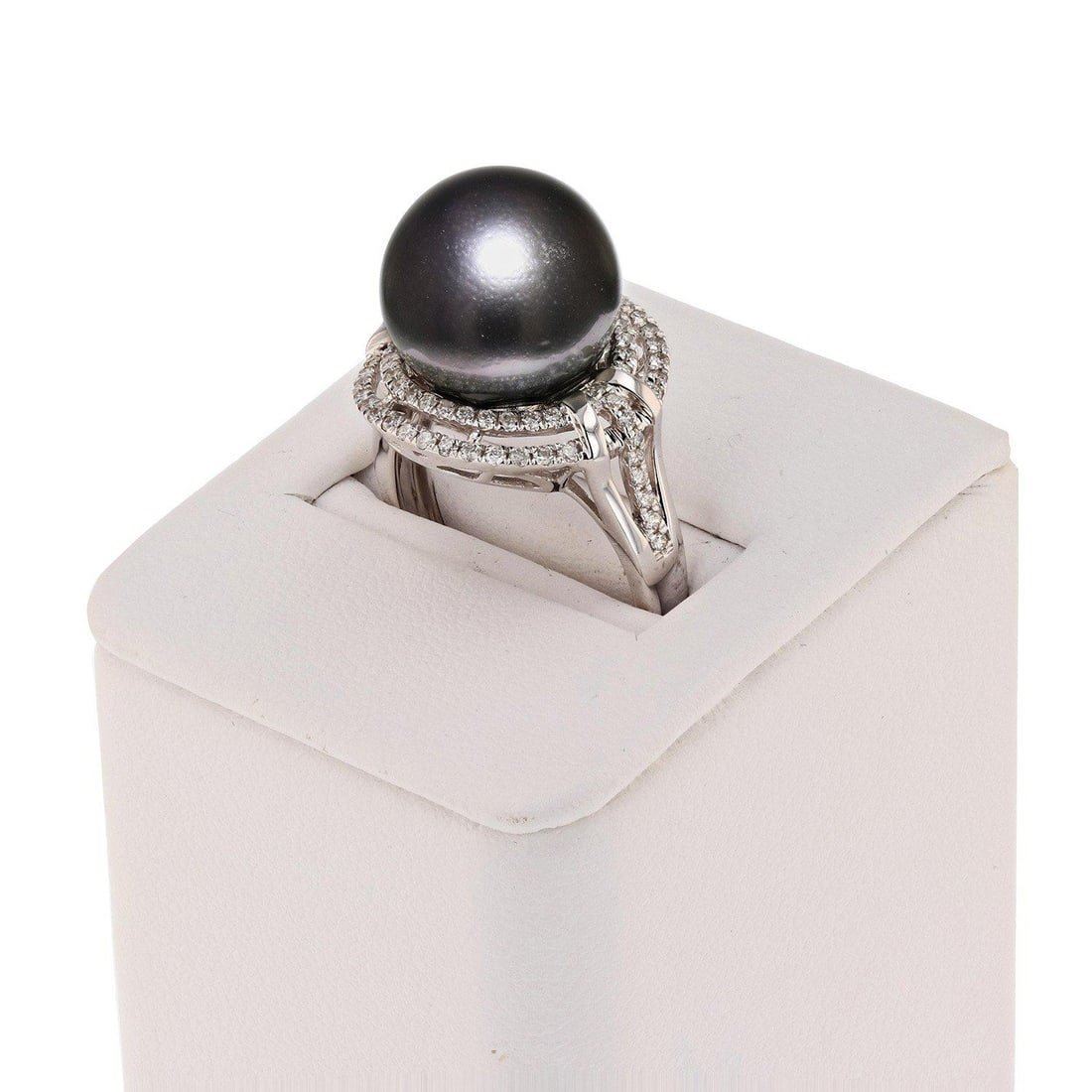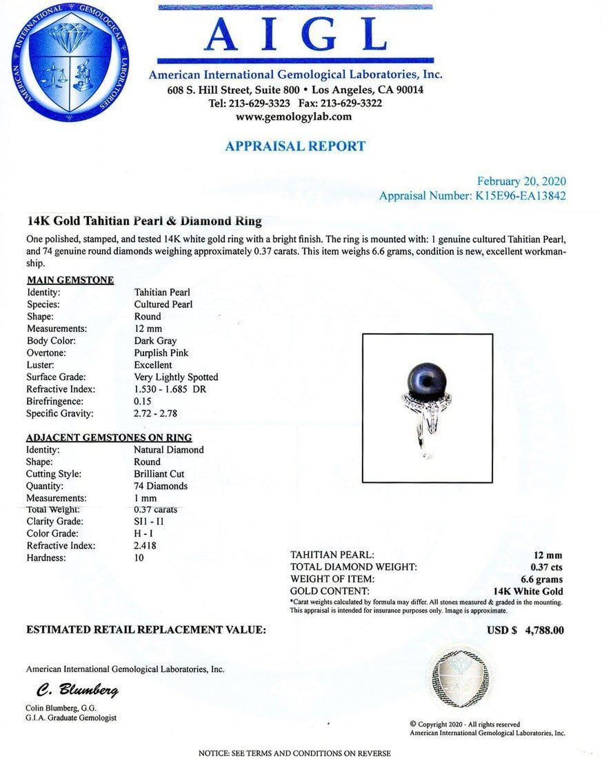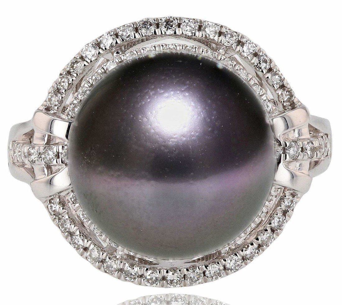 14K Gold Tahitian Pearl & Diamond Ring One polished, stamped, and tested 14K white gold ring with a bright finish. The ring is mounted with: 1 genuine cultured Tahitian Pearl, and 74 genuine round diamonds weighing approximately 0.37 carats. This item weighs 6.6 grams, condition is new, excellent workmanship. MAIN GEMSTONE Identity: Tahitian Pearl Species: Cultured Pearl Shape: Round Measurements: 12mm Body Color: Dark GrayOvertone: Purplish Pink Luster: Excellent Surface Grade: Very Lightly Spotted Refractive Index: 1.530 - 1.685 DR Birefringence: 0.15 Specific Gravity: 2.72 - 2.78 ADJACENT GEMSTONES ON RING Identity:Natural Diamond Shape: Round Cutting Style: Brilliant Cut Quantity: 74 Diamonds Measurements: 1mm Total Weight: 0.37 carats Clarity Grade: SI1 to I1 Color Grade: H - I Refractive Index: 2.418 Hardness: 10 TAHITIAN PEARL: 12mm TOTAL DIAMOND WEIGHT: 0.37ctw WEIGHT OF ITEM: 6.6 grams GOLD CONTENT: 14K White Gold
