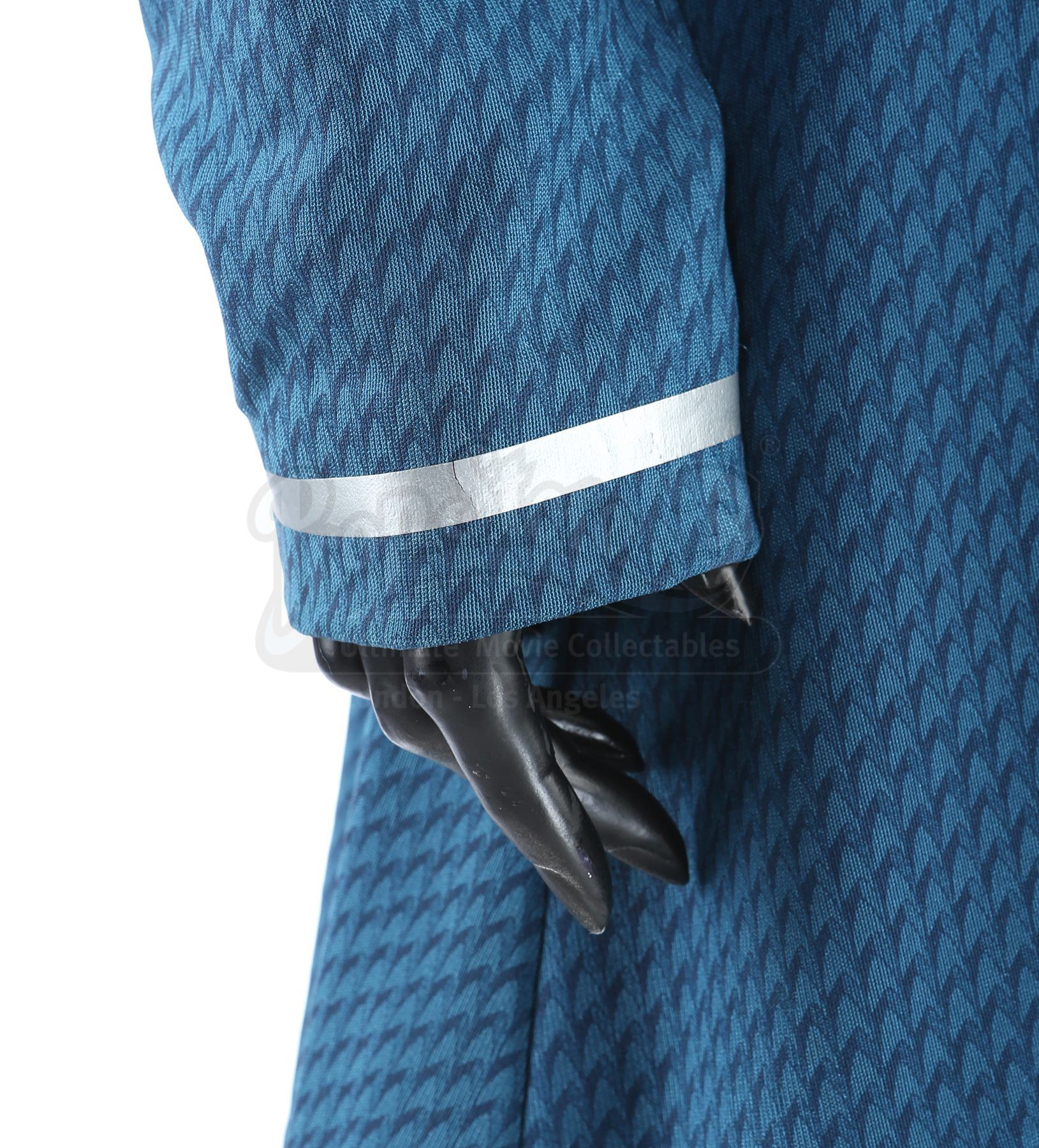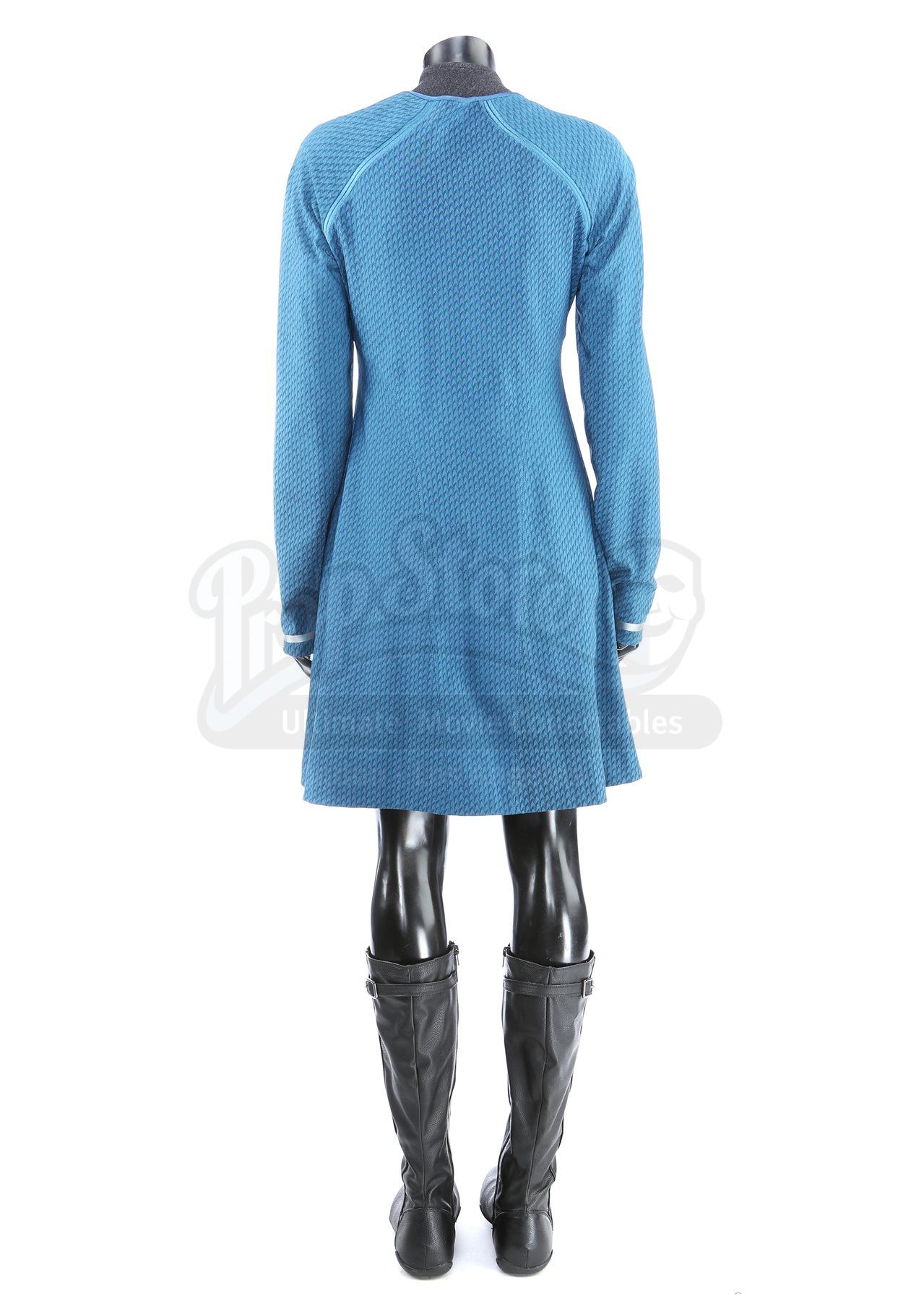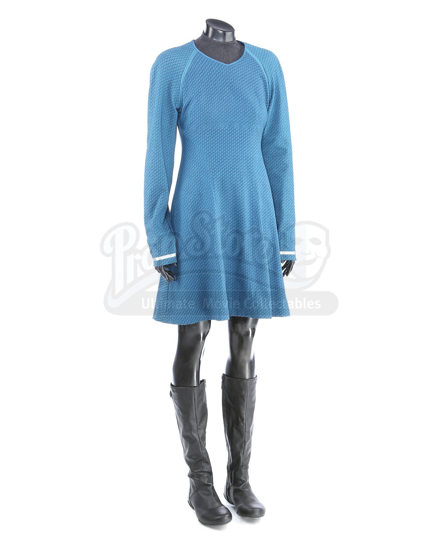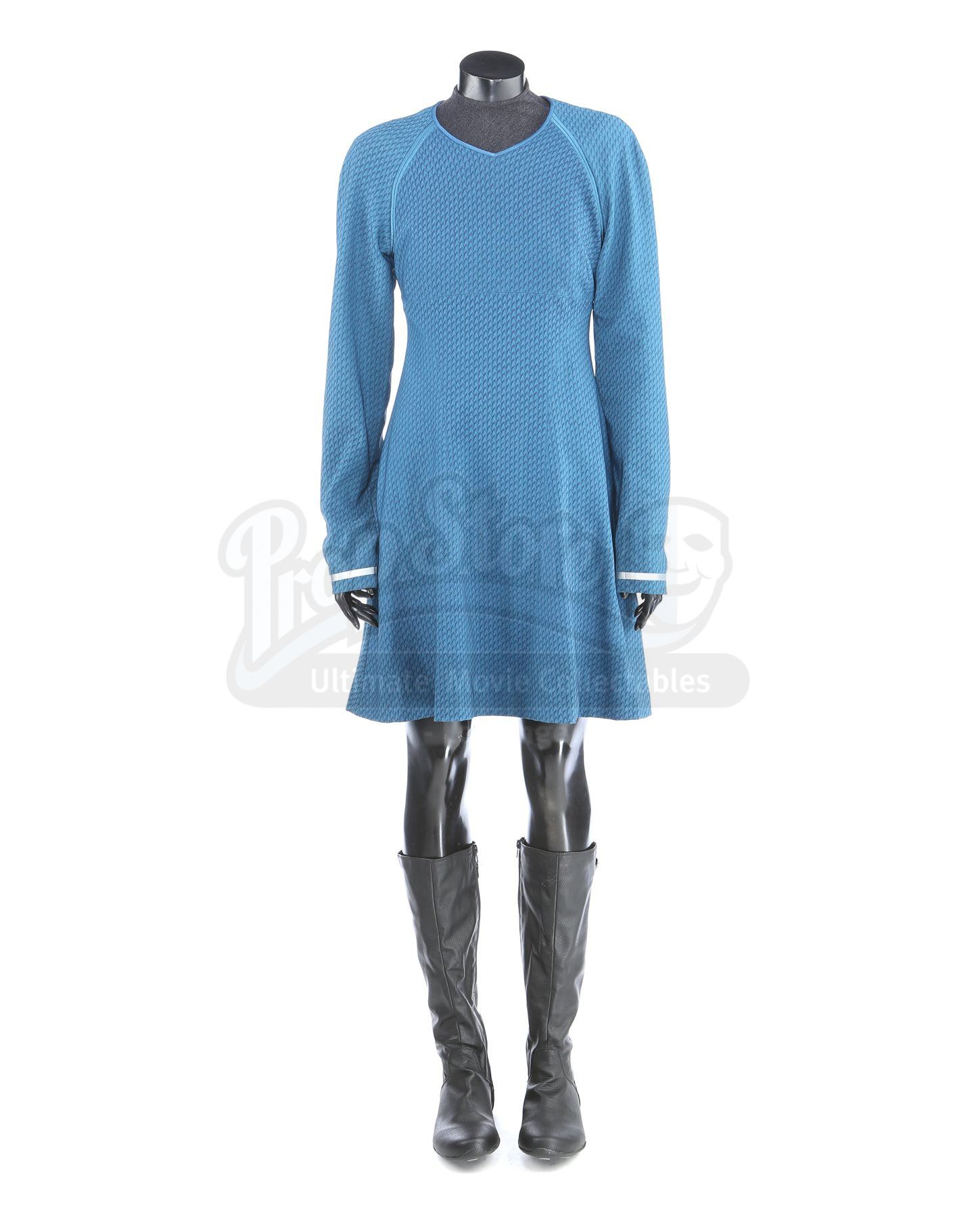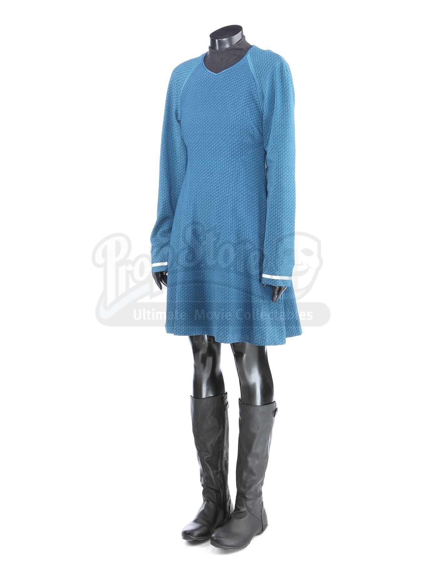 A women's Enterprise sciences uniform from Star Trek and reused in Star Trek Into Darkness. Enterprise staff in the sciences division wore their uniforms while aboard the Enterprise throughout the first two films. The costume includes a dress, an undershirt and a pair of boots (marked U.S. size 8). Made for the first film and reused in the sequel, the blue dress (approximate size small) is made of Spandex, has piping around the collar and features a printed optical repeat Starfleet insignia pattern. The dress has long sleeves and one silver band on the wrists. The undershirt consists of a grey polyester turtleneck leotard (approximate size small). Also included is a pair of black leather boots with rubber soles.The costume features hand-written wardrobe labels in the dress and undershirt marked with the names of background actors.Estimate: $1000 - 1500*Estimated sale price; sold without reserve.