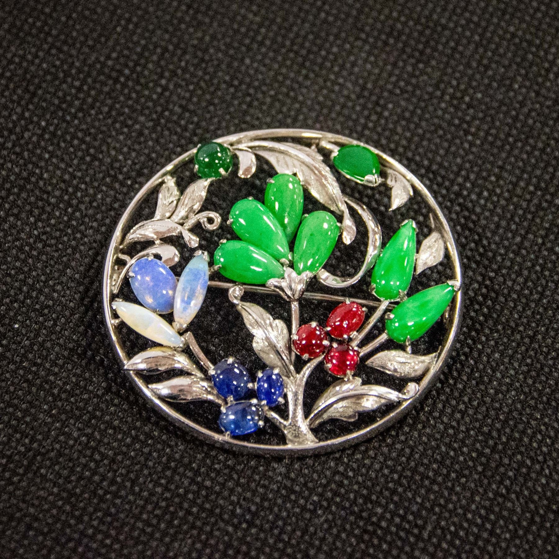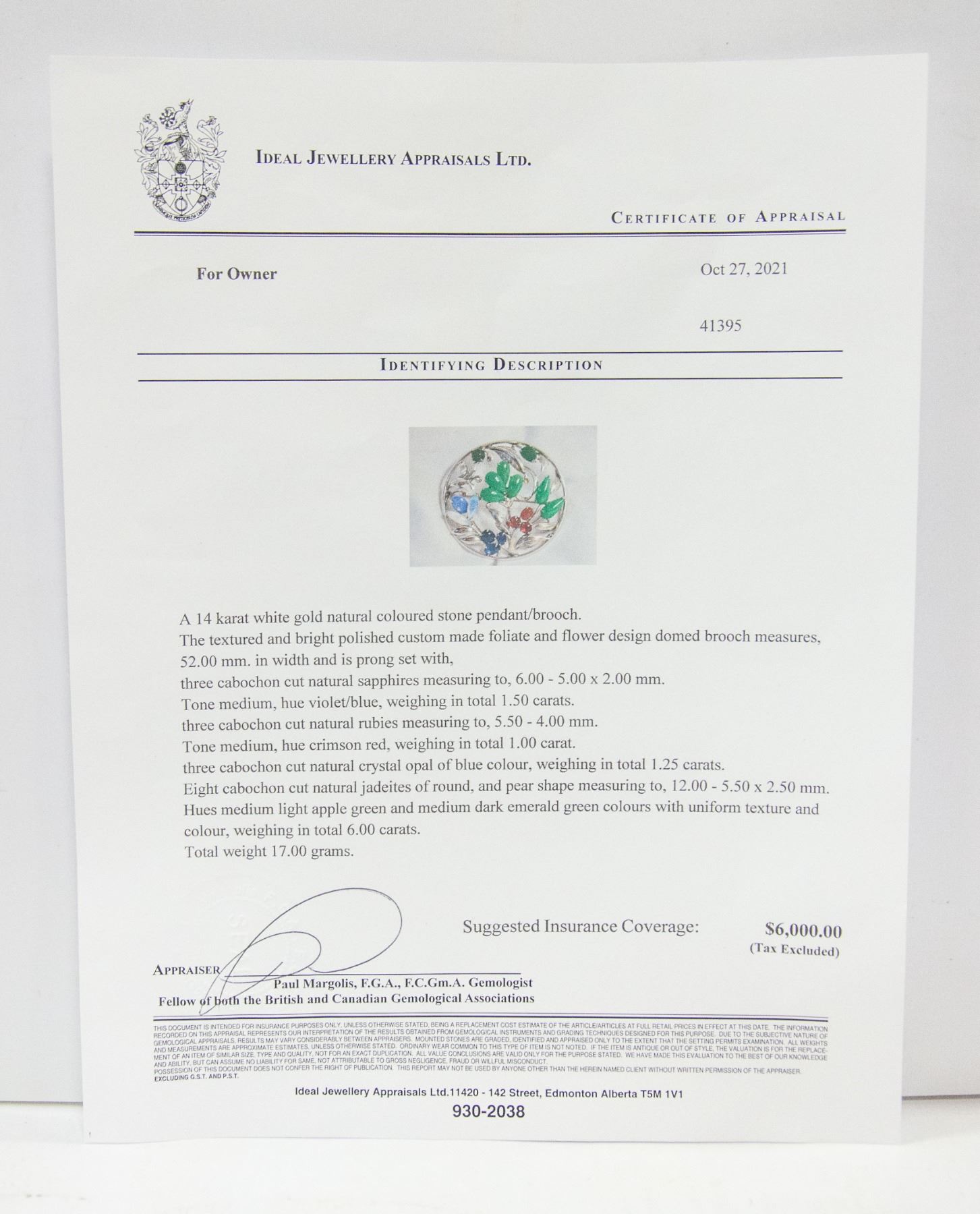 14 KT WHITE GOLD MULTIPLE SAPPHIRES, RUBIES, OPALS, JADEITE WEIGHS 17 GRAMS INCLUDES RECENT APPRAISAL OF $6000.00 LATE JUDGES ESTATE LARGE FLORAL DESIGN PENDANT/ BROOCH CUSTOM MADE