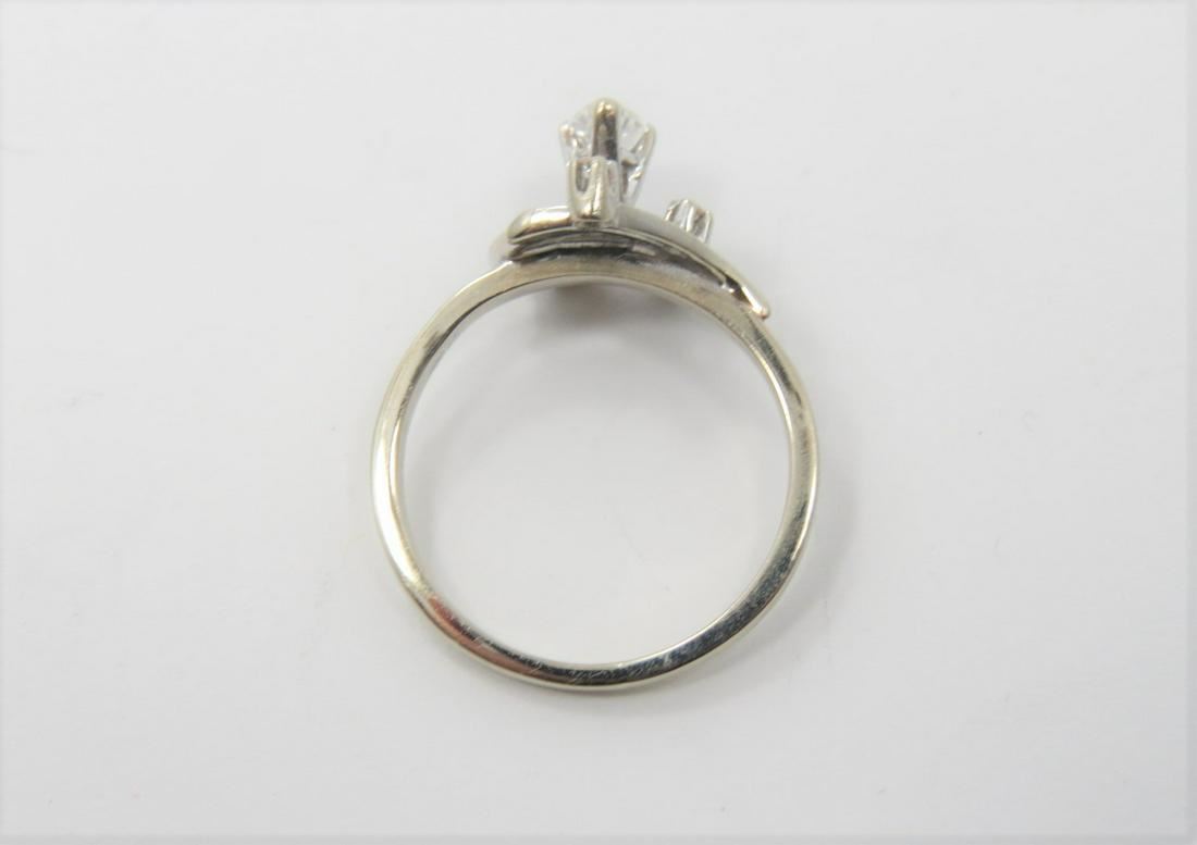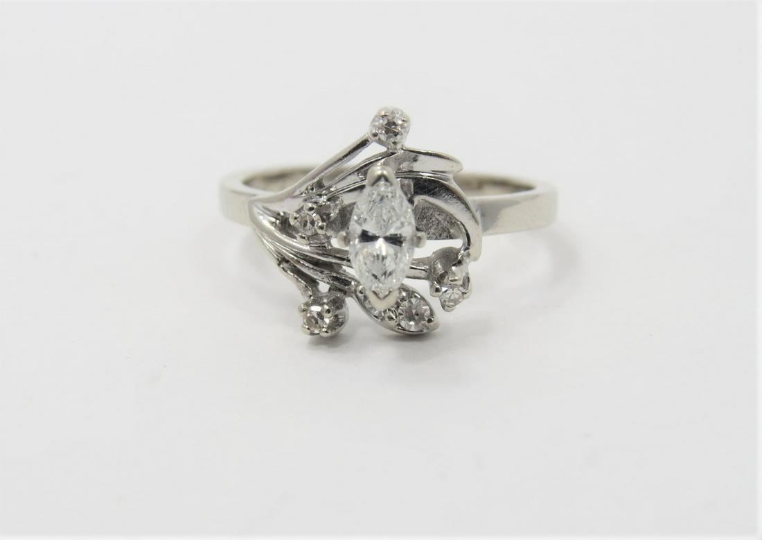 Stamped 14K white gold art-nouveau style diamond ring. Center marquis cut diamond is approximately 0.25 cts. Accented by six single cut round diamonds. SI clarity with I/J color. Total diamond weight of approximately 0.30 cts. 2 mm band width. Size 5.5. Weighs 2.8 grams.