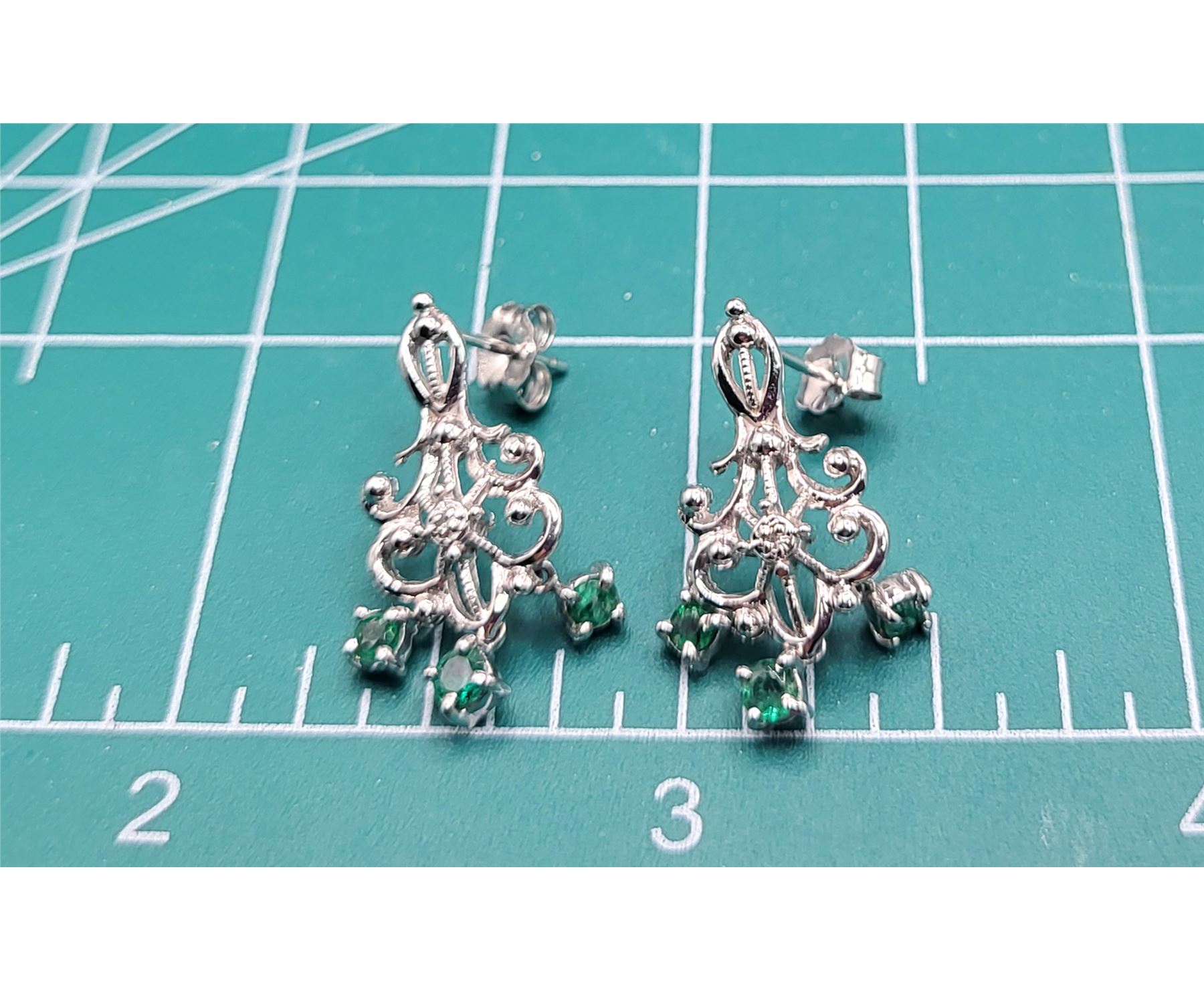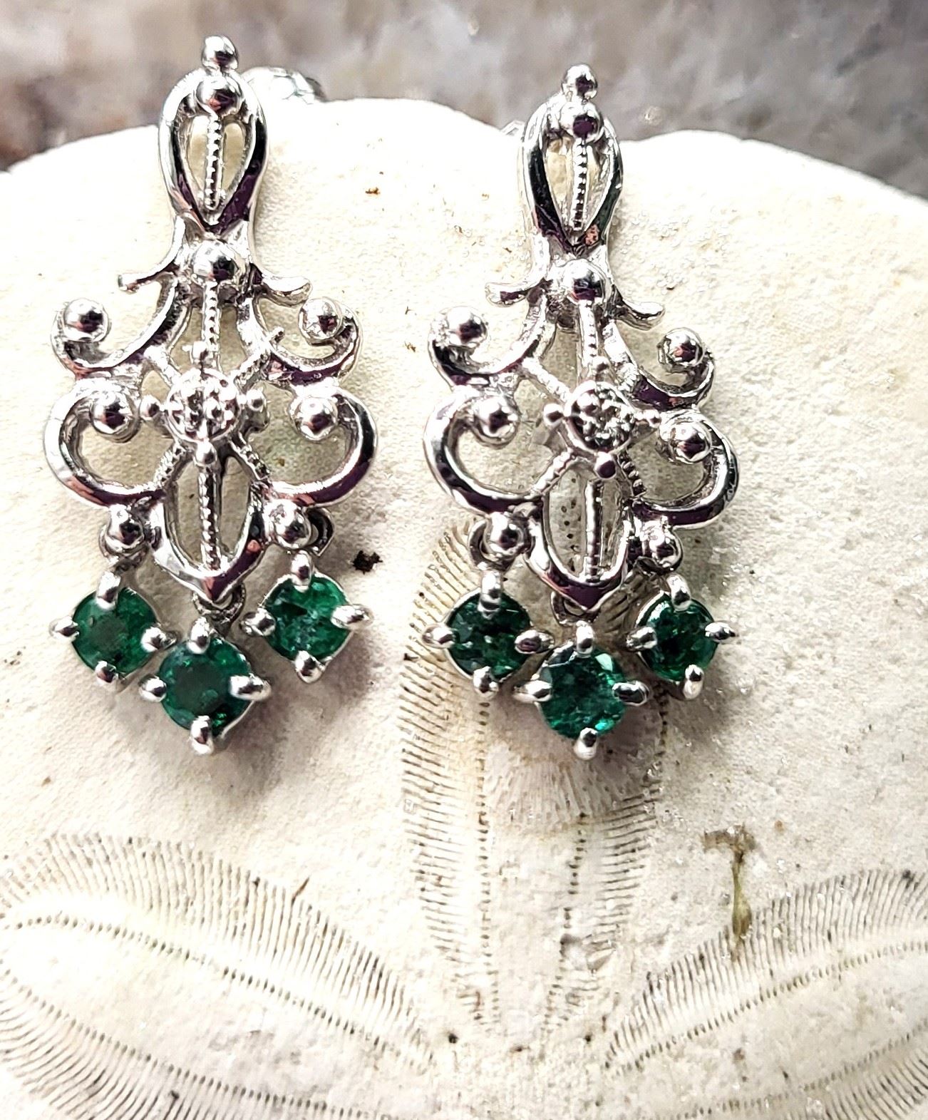 These 14 karat white gold chandelier earrings are perfect for dressy or casual outings. Approximately .58 carats total weight of prong-set, genuine emeralds dangle from the bottom of white gold gentle swirls and graceful curves. The earrings are 7/8& quot; x 3/16& quot; and attach to the earlobe with posts and friction backs. This is a brand new item with manufacturer's approval to sale in a public auction. It is in excellent condition, but may have fine scratches from shipping or storage.& nbsp;