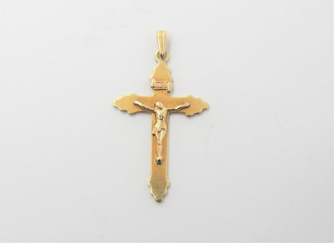 Stamped 14K yellow gold crucifix pendant. 1.3 grams. Measures 1.1" x 13.2 mm.