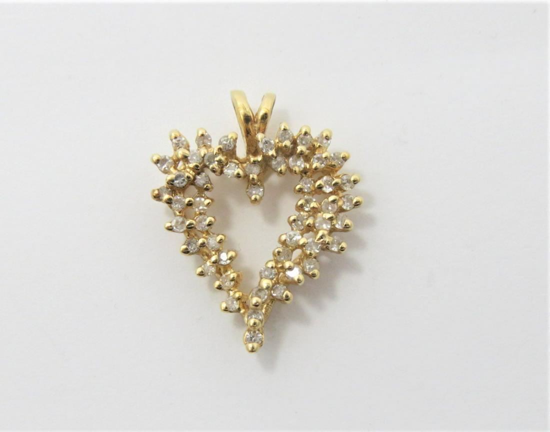 Stamped 14K yellow gold cluster style heart pendant with split fixed bail. Set with approximately 0.25 cts in diamonds. 2.8 grams. 23 mm x 18.3 mm.