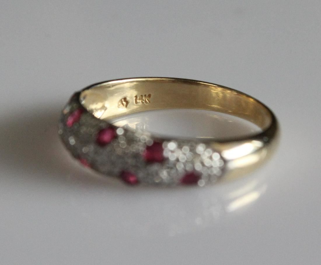 Stamped 14K yellow gold ruby and diamond band. Pave set. Approximately 1.8 cts in round rubies. 0.07 cts total diamond weight. Size 6.5. Weighs 2.5 grams.