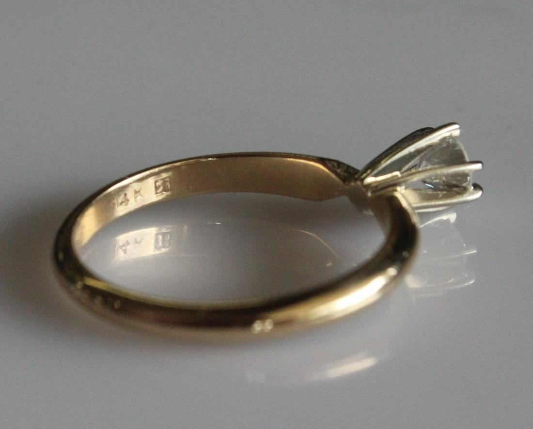 Stamped 14K yellow gold solitaire diamond engagement ring. Round brilliant cut diamond. SI clarity, H/I color. Approximately 0.35 cts center stone. 2mm band width. Size 6.25. Weighs 2.2 grams.