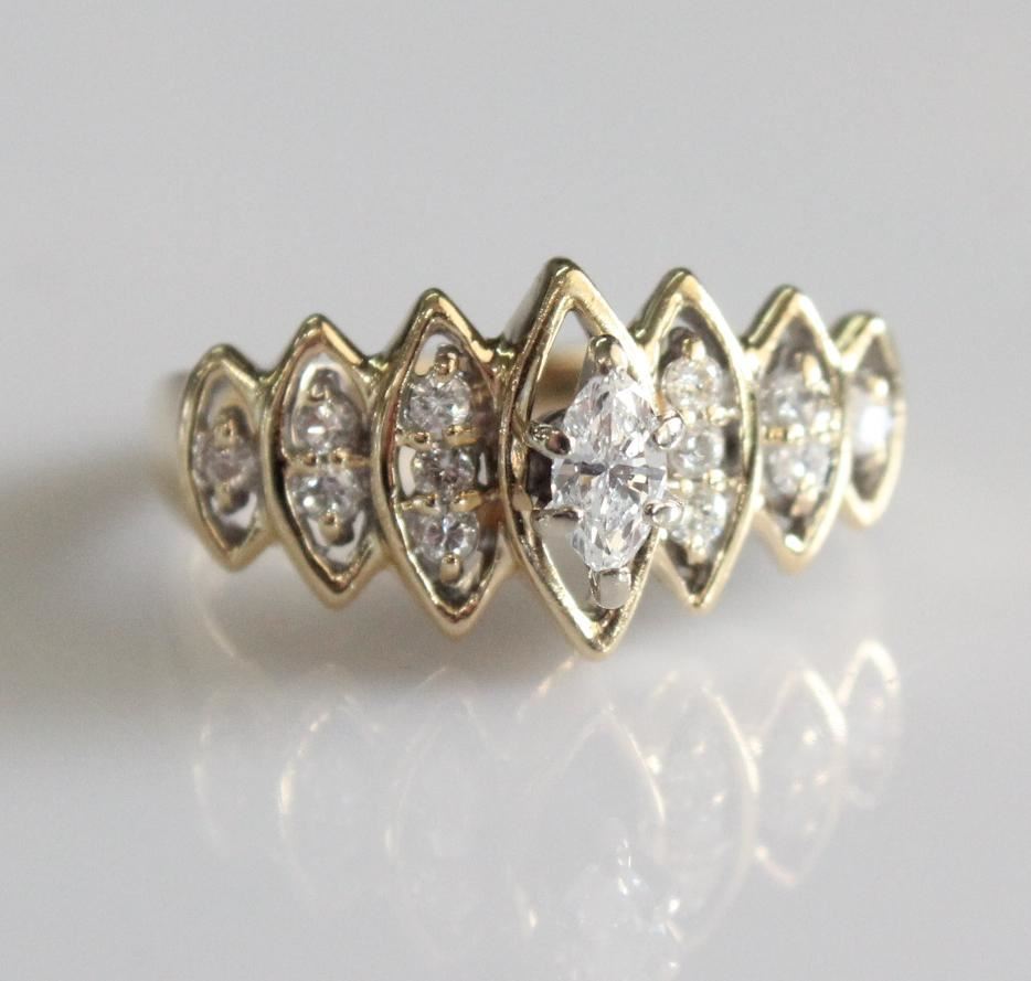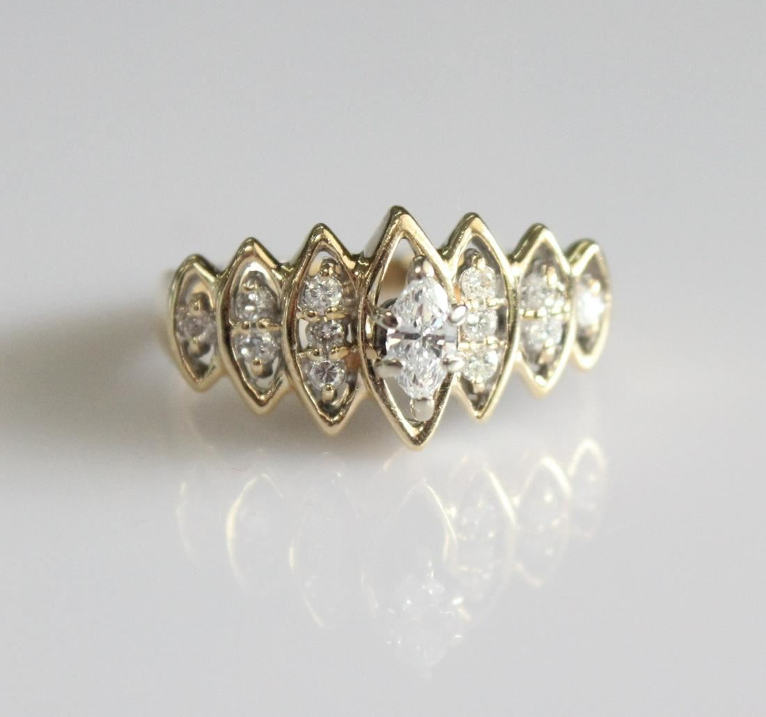 Stamped 14K yellow gold marquis diamond engagement ring. Center diamond is approximately 0.15 cts. SI2 clarity, H color. With round cut diamonds accented on each side. Approximately 0.35 cts total diamond weight. Tapered band. Size 7.5. Weighs approximately 3.9 grams.