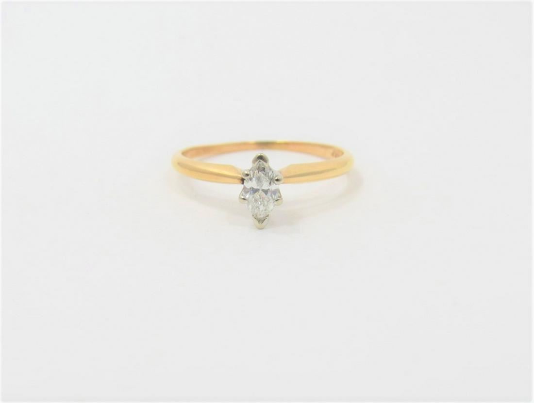 Stamped 14K yellow gold solitaire marquis cut diamond engagement ring. SI2 clarity with G/H color. Approximately 0.37 ct total diamond weight. Size 6. Weighs 1.4 grams.