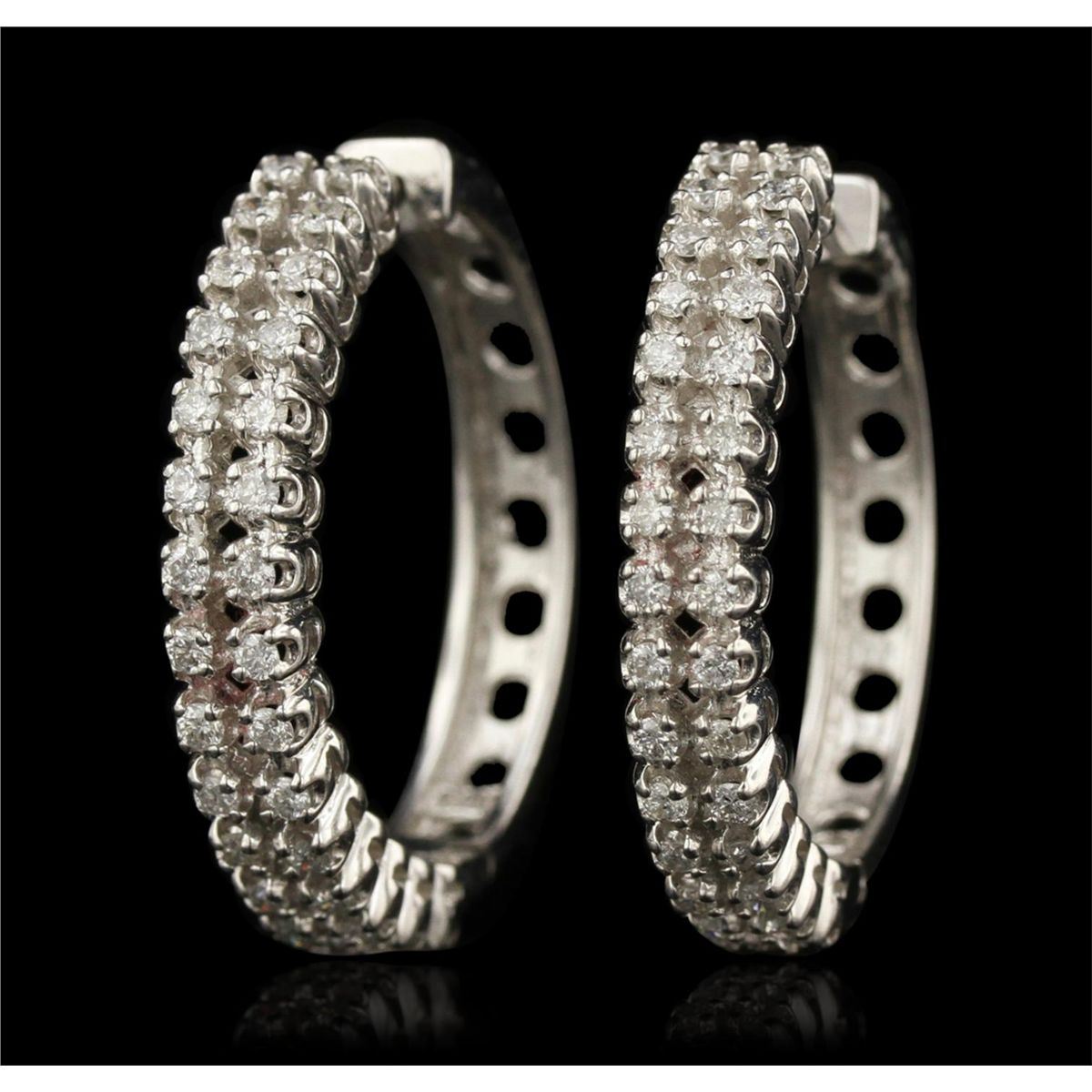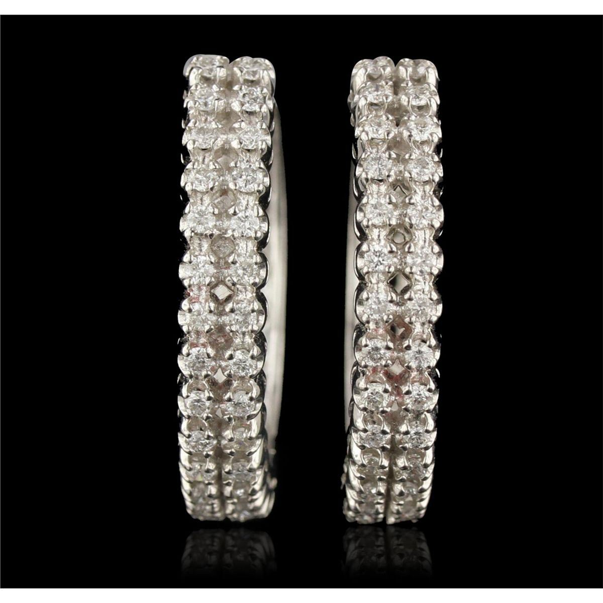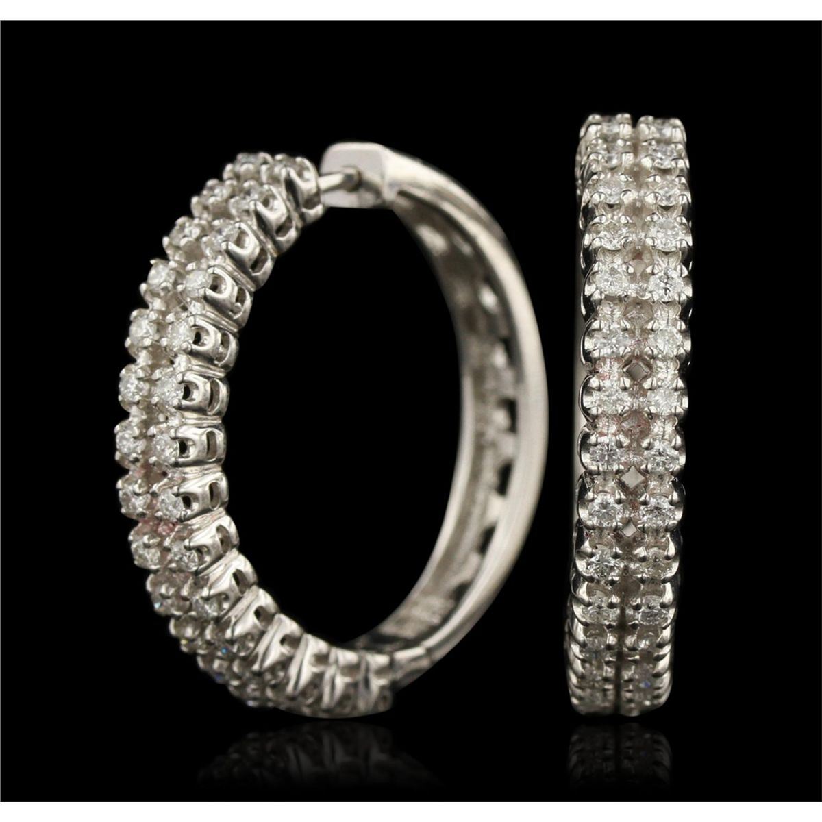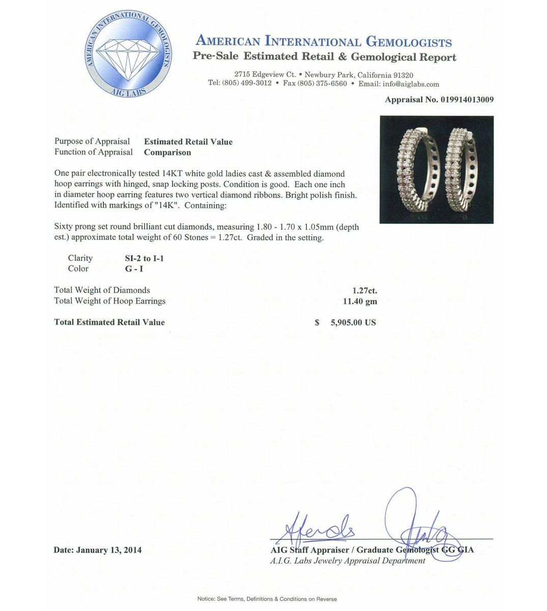 14KT White Gold 1.27ctw Diamond Earrings A7264. Good Condition! XC659YE. One pair electronically tested 14KT white gold ladies cast & assembled diamond hoop earrings with hinged, snap locking posts. Condition is good. Each one inch in diameter hoop earring features two vertical diamond ribbons. Bright polish finish. Identified with markings of "14K". Containing: Sixty prong set round brilliant cut diamonds, measuring 1.80 - 1.70 x 1.05mm (depth est.) approximate total weight of 60 Stones = 1.27ct. Graded in the setting. Clarity: SI-2 to I-1 . Color: G - I. Total Weight of Diamonds 1.27ct. Total Weight of Hoop Earrings 11.40 gm. AIG Appraised at $5,905.00.