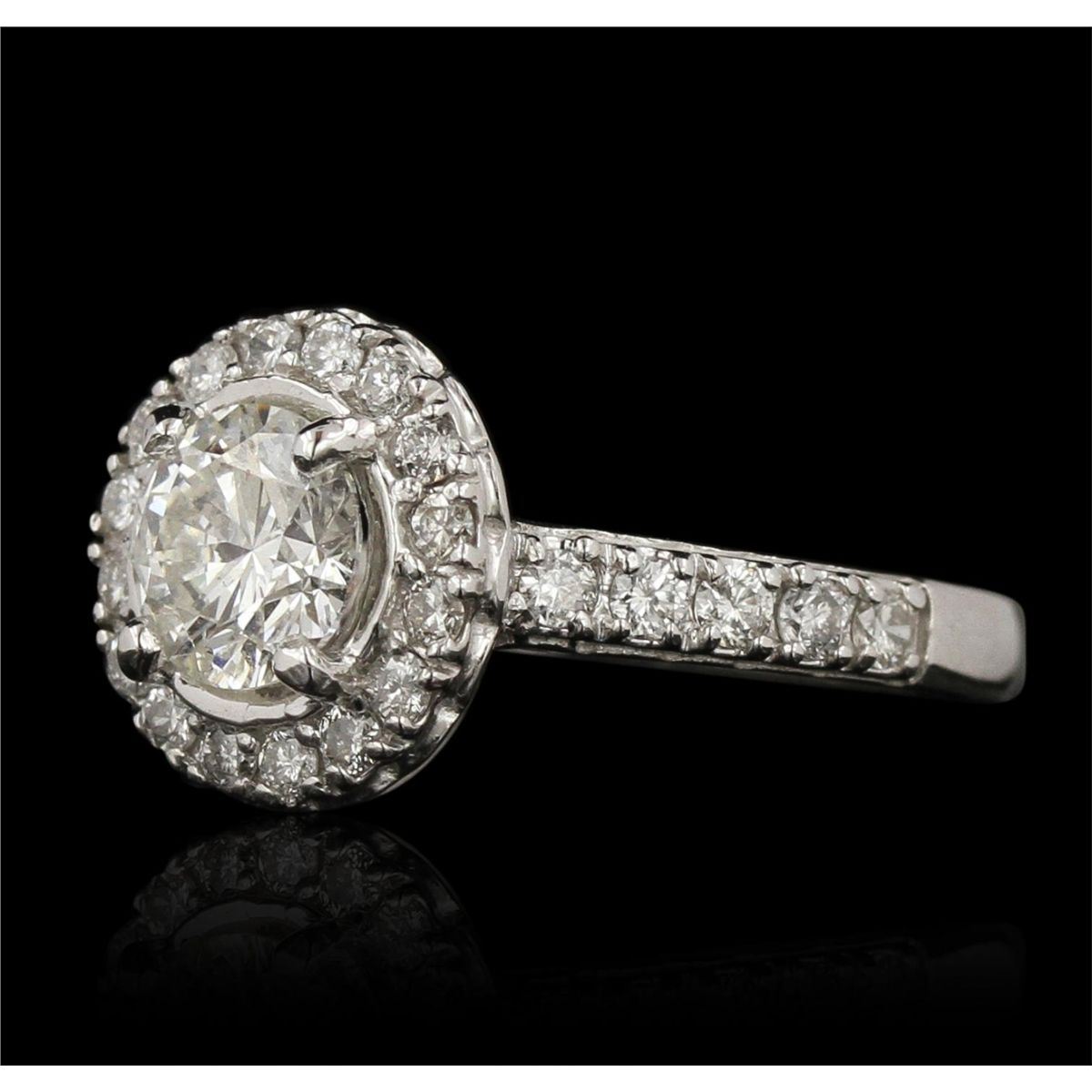 14KT White Gold 1.57ctw Diamond Ring JRM377. Excellent Condition! MD5052BU. One electronically tested 14KT white gold lady's combination cast & assembled engagement ring with a bright polish finish. Identified with markings of "14K". Condition is excellent. Containing: One prong set round brilliant cut diamond, measuring 6.50 - 6.40 x 3.80mm (depth est.) approximate weight of 1.00ct. Clarity of I-1, Color of K, Cut is Good. Twenty-Six prong set round brilliant cut diamonds, measuring 1.90 - 1.50 x 1.02mm (depth est.) approximate total weight of 26 Stones = 0.57ct. Clarity of I-1 to I-2, Color of H - I, Cut is Good. Total Weight of Diamonds 1.57ct. Total Weight of Ring 3.70gm. GGL Appraised at $13,860.00.