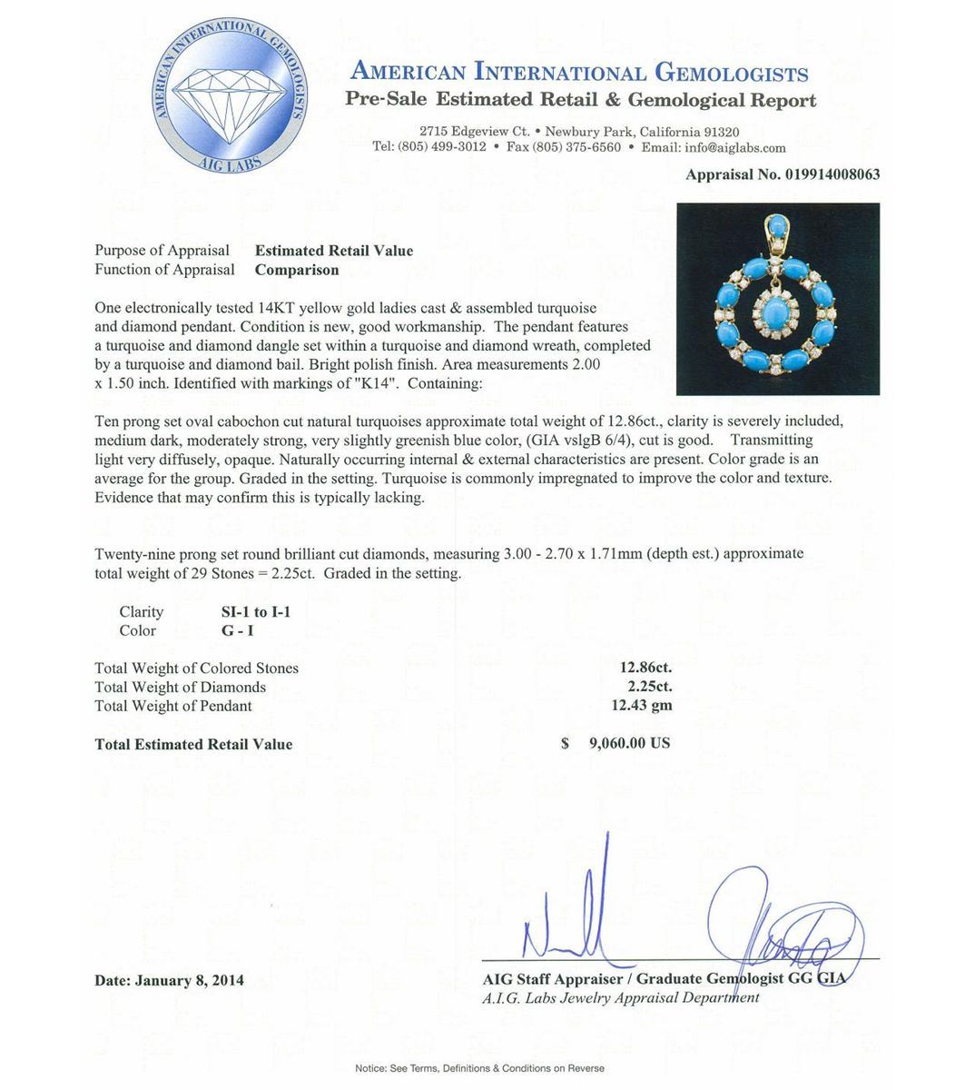 14KT Yellow Gold 12.86ct Turquoise and Diamond Pendant A7098. Great Condition! RX6071AV. One electronically tested 14KT yellow gold ladies cast & assembled turquoise and diamond pendant. The pendant features a turquoise and diamond dangle set within a turquoise and diamond wreath, completed by a turquoise and diamond bail. Bright polish finish. Area measurements 2.00 x 1.50 inch. Identified with markings of "K14". Condition is new, good workmanship. Containing: Ten prong set oval cabochon cut natural turquoises approximate. Total Weight of 12.86ct., clarity is severely included, medium dark, moderately strong, very slightly greenish blue color, (GIA vslgB 6/4), cut is good. Transmitting light very diffusely, opaque. Naturally occurring internal & external characteristics are present. Color grade is an average for the group. Graded in the setting. Turquoise is commonly impregnated to improve the color and texture. Evidence that may confirm this is typically lacking. Twenty-Nine prong set round brilliant cut diamonds, measuring 3.00 - 2.70 x 1.71mm (depth est.) approximate. Total Weight of 29 Stones = 2.25ct. Graded in the setting. Clarity: SI-1 to I-1 . Color: G - I. Total Weight of Colored Stones 12.86ct. Total Weight of Diamonds 2.25ct. AIG Appraised at $9,060.00.