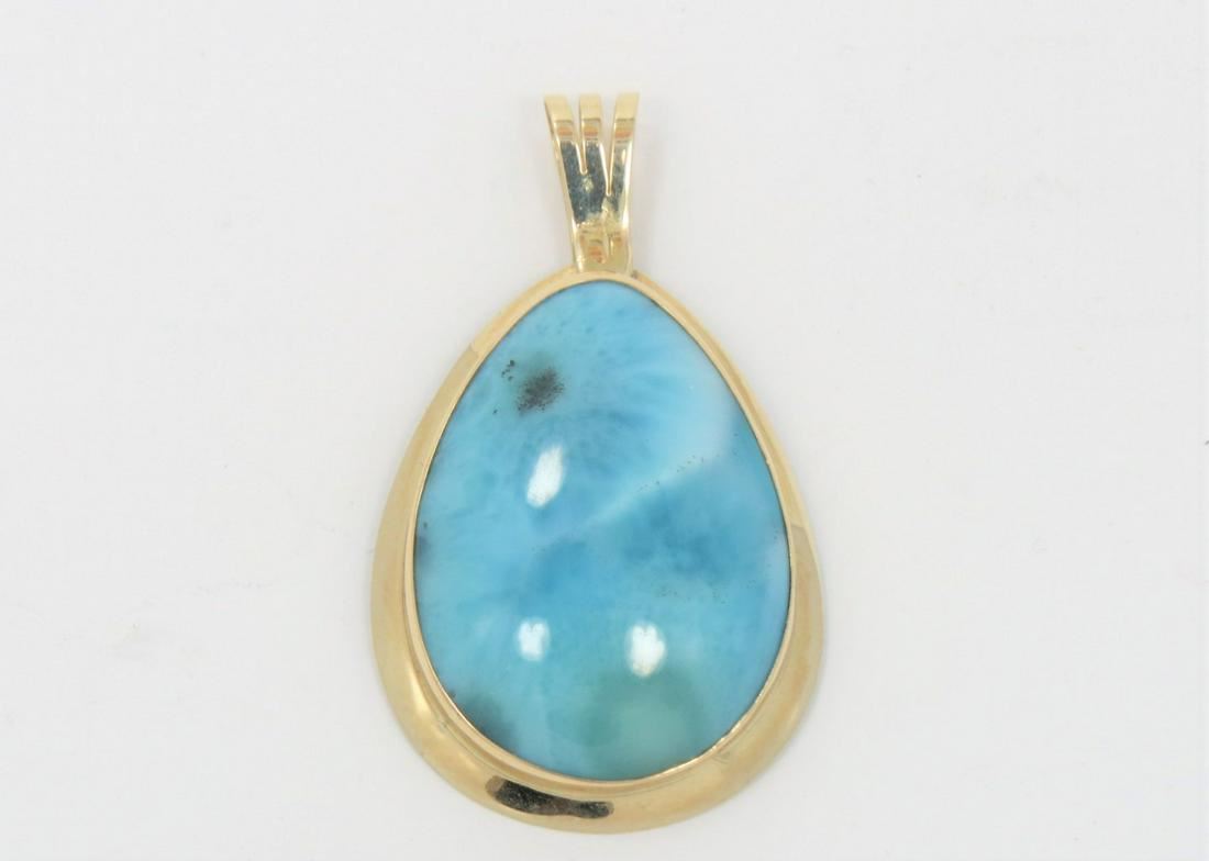 14k yellow gold ladies pear-shape larimar pendant. Features a flanged, bezel-set design and a tri-split bail. This piece measures 35mm x 25.6mm, and weighs 7.6g