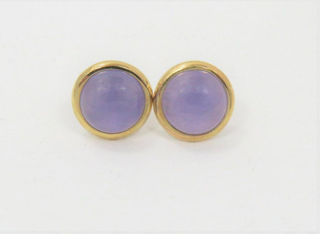 14k Yellow gold ladies studs bezel-set with lavender jade cabochons. The earrings weigh 1.6g, the cabochons measure 8mm across.