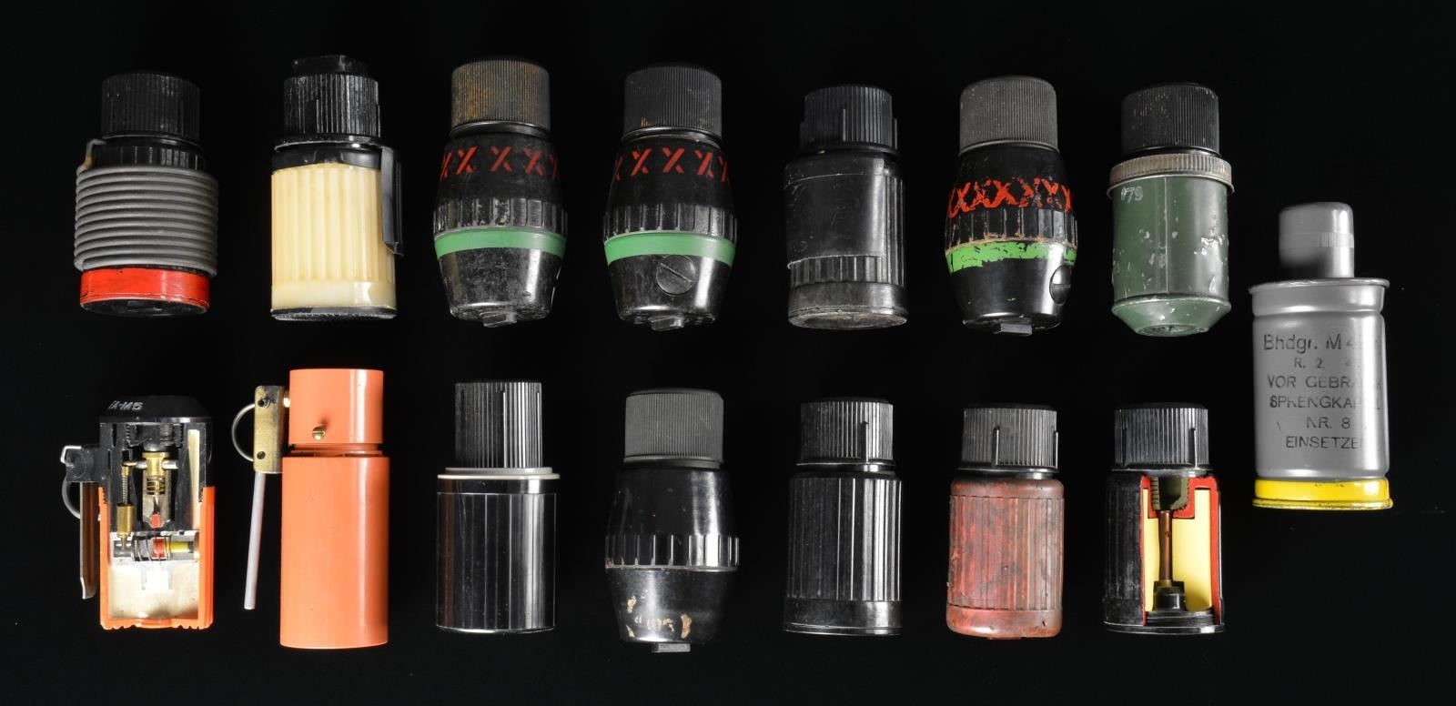 SPAIN: 6 PO plastic training grenades w/ eagle & cross crest on top of caps; 1 cutaway. / 1 EA-M5 cutaway grenade.