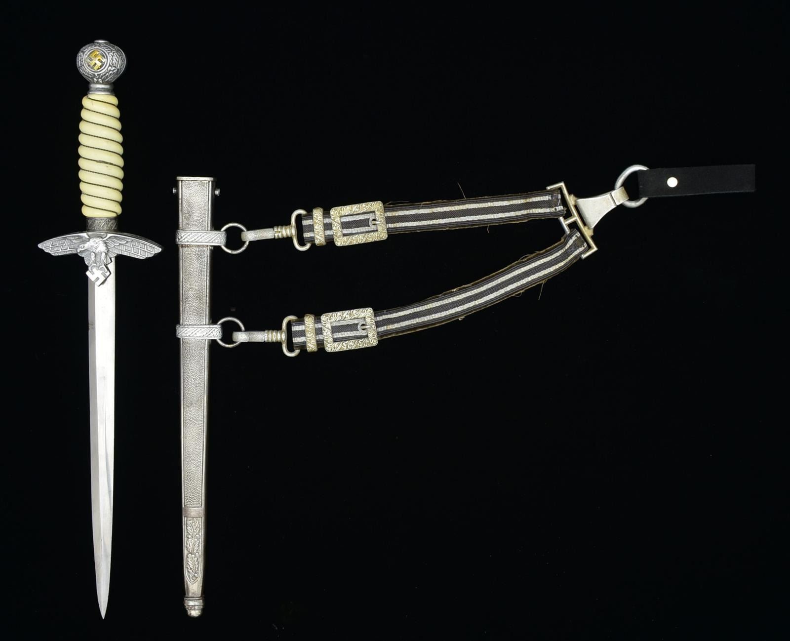 Overall length: 16 1/4". This dagger appears to be late war production or possibly a post war assembled dagger. Plain unmarked blade. Aluminum crossguard & pommel. White composite wire wrapped grip. Plated steel scabbard w/ aluminum scabbard mounts. Original Luftwaffe hanger attached. CONDITION: dagger shows light wear overall w/ minor damage to the top of the grip. (02-15229/BF). $400-550.