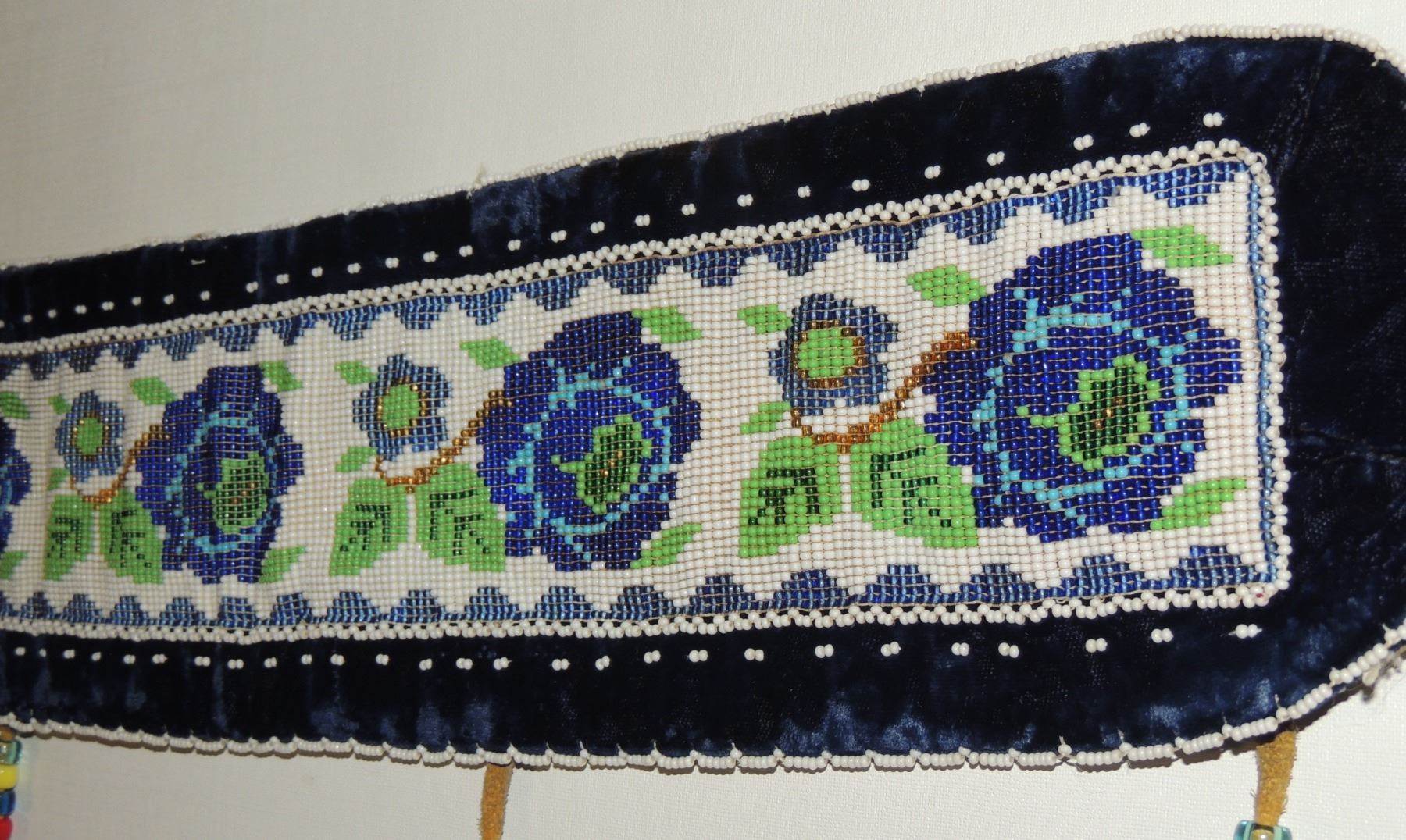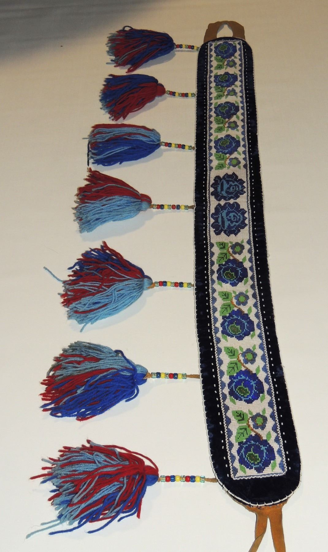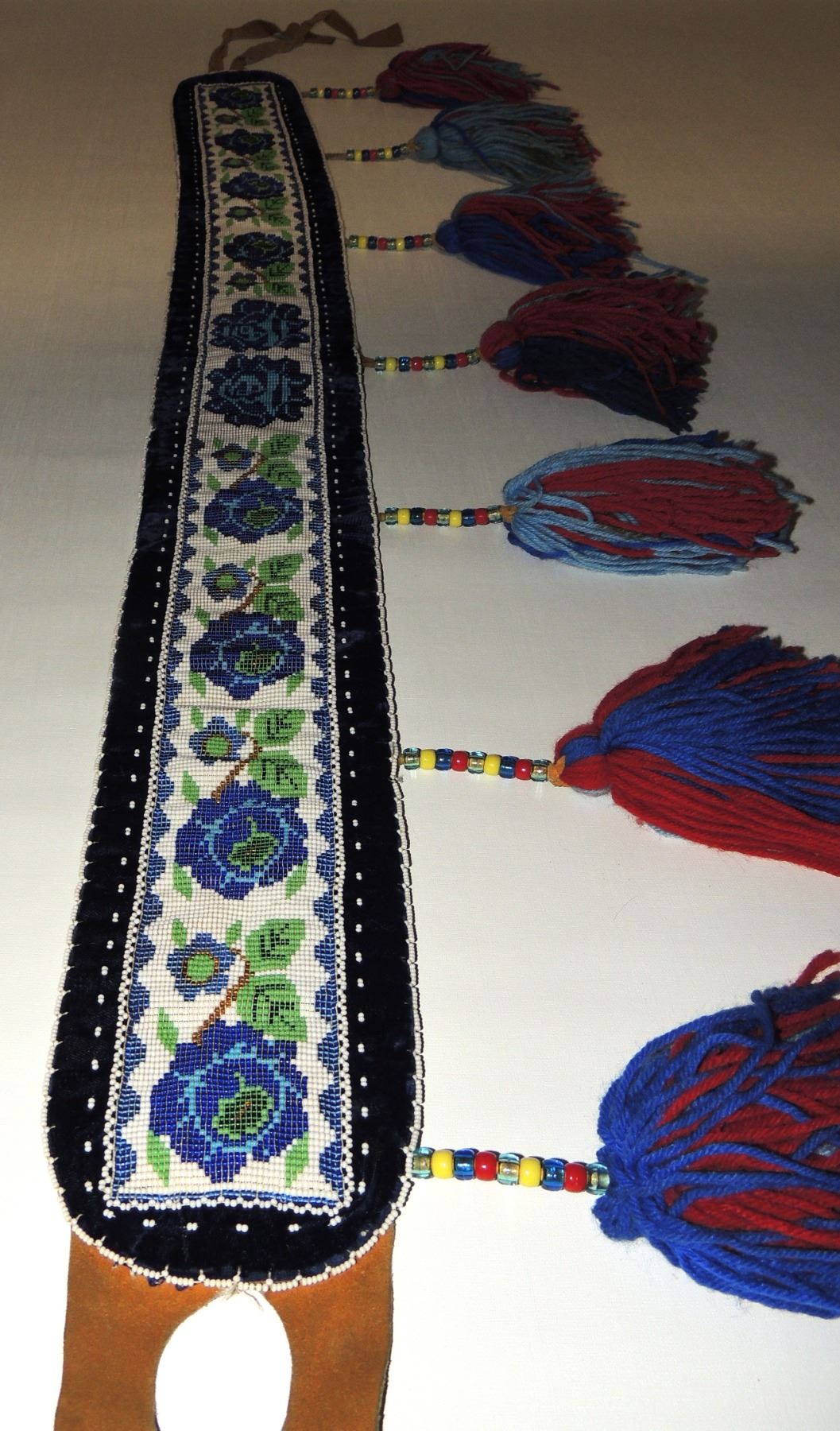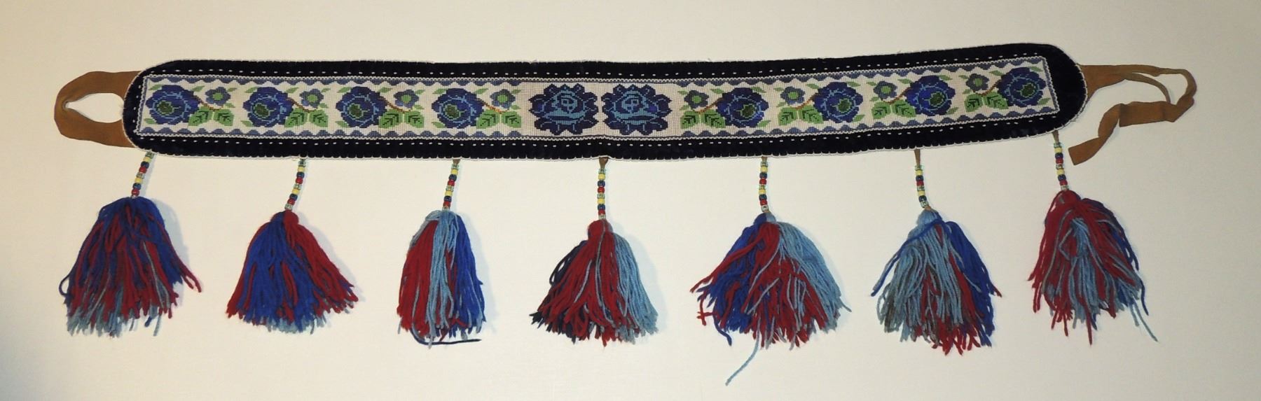Highly Detailed floral beadwork in blue/purple/white on belt, Measuring 46 Inches Long and 5 Inches Wide. Has Leather Belt Straps Measuring 4 Inches and 11 Inch Leather Fasteners. Belt has detailed beaded Floral Pattern with tassles. Appears Métis based on beadwork, Mid/Late 1900's 20th Century. Please see our Other Auctions for additional - First Nations -Aboriginal -Indigenous Peoples - Métis- Metis - Iniut - Native American - Plains Indian - Artefacts