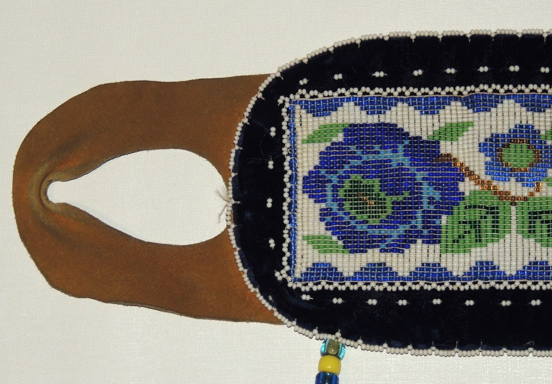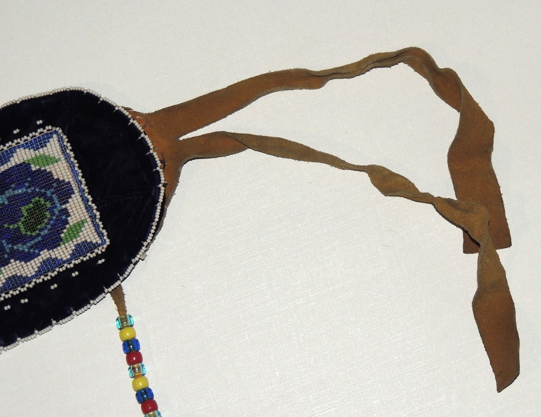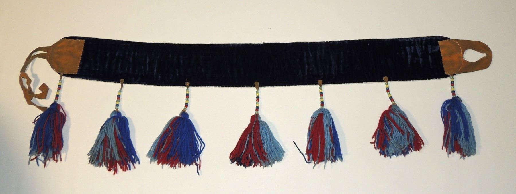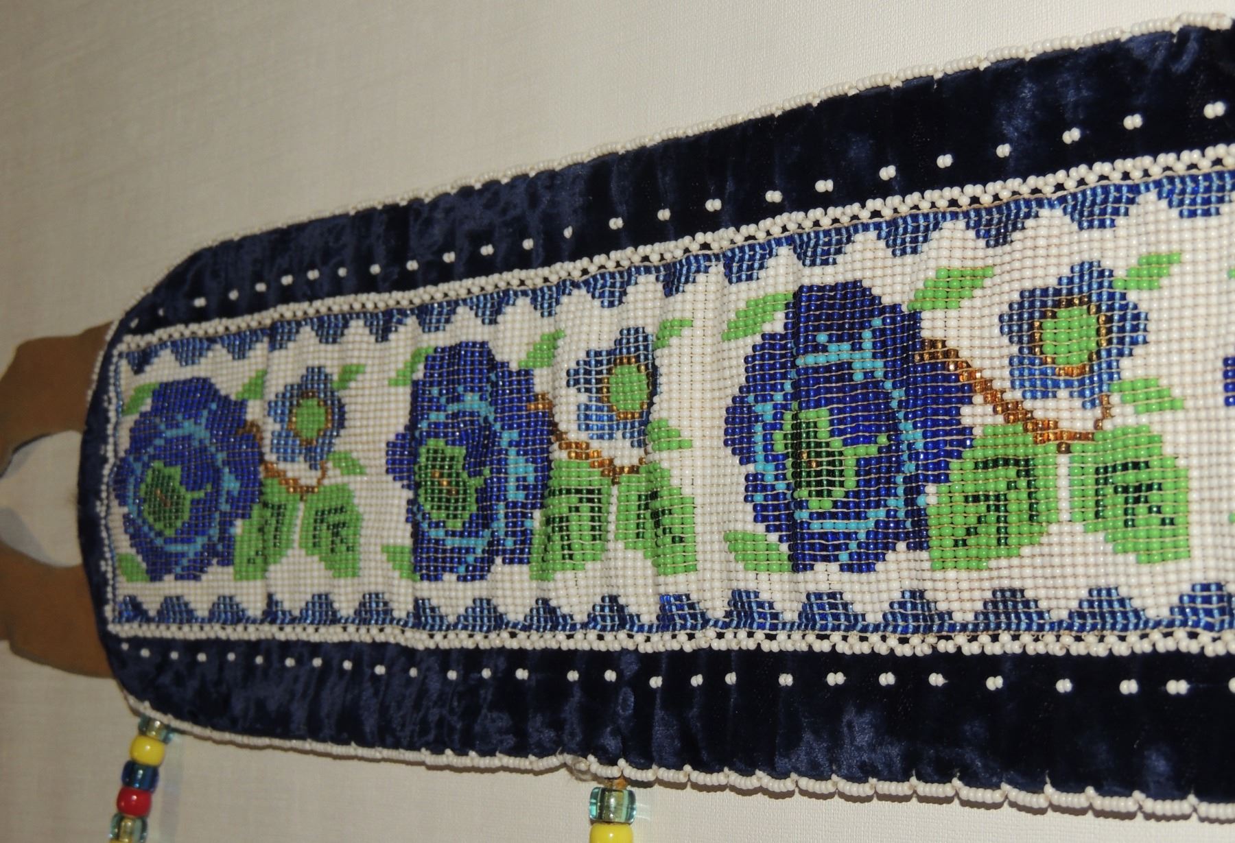 Highly Detailed floral beadwork in blue/purple/white on belt, Measuring 46 Inches Long and 5 Inches Wide. Has Leather Belt Straps Measuring 4 Inches and 11 Inch Leather Fasteners. Belt has detailed beaded Floral Pattern with tassles. Appears Métis based on beadwork, Mid/Late 1900's 20th Century. Please see our Other Auctions for additional - First Nations -Aboriginal -Indigenous Peoples - Métis- Metis - Iniut - Native American - Plains Indian - Artefacts