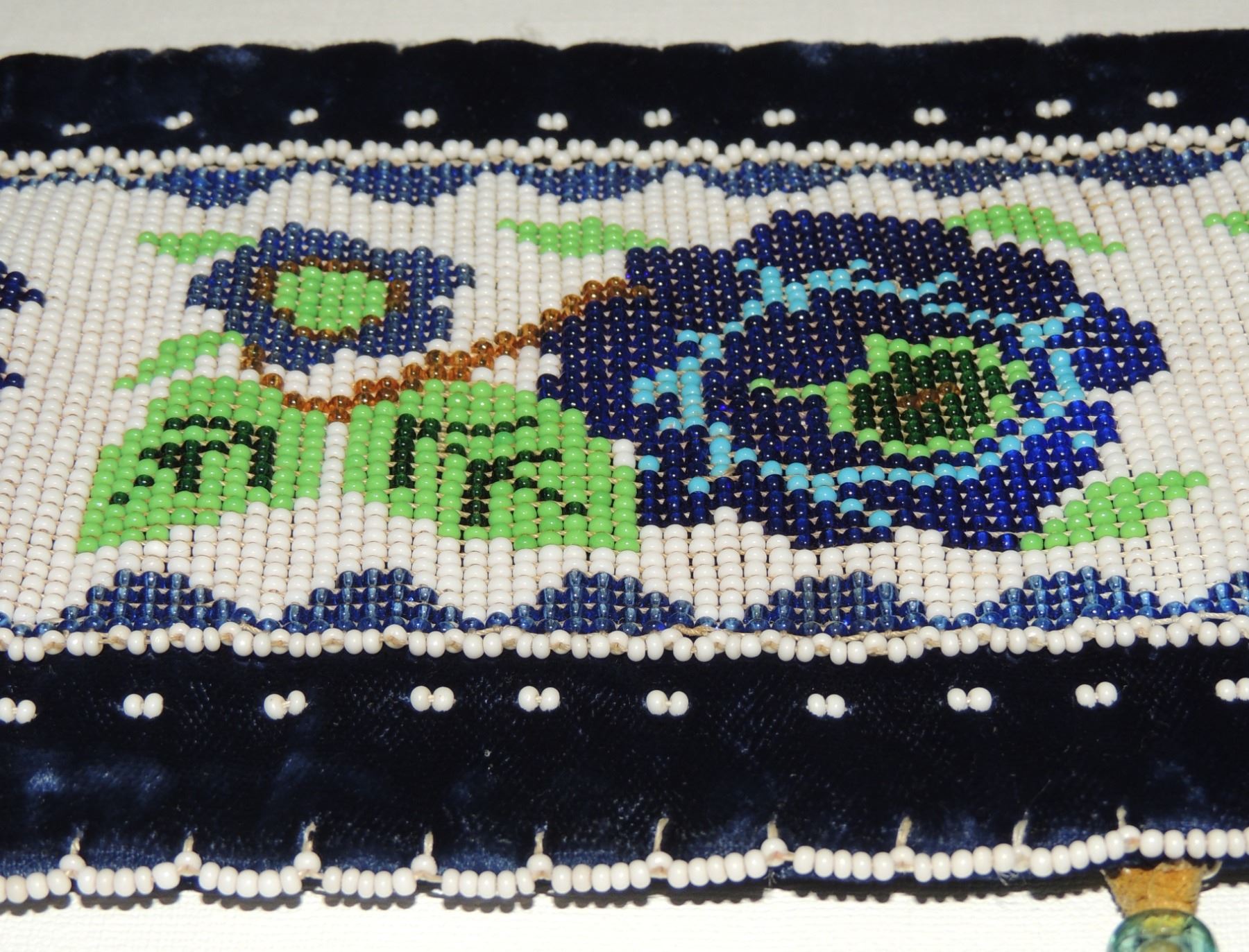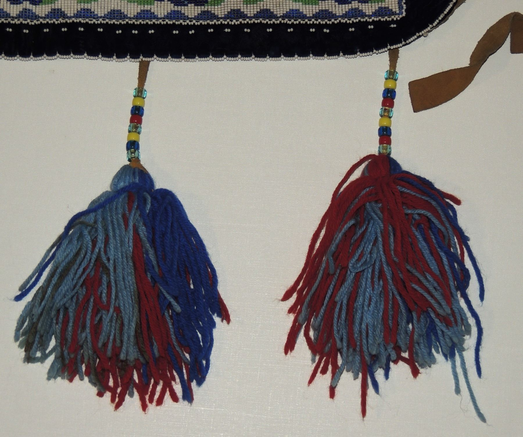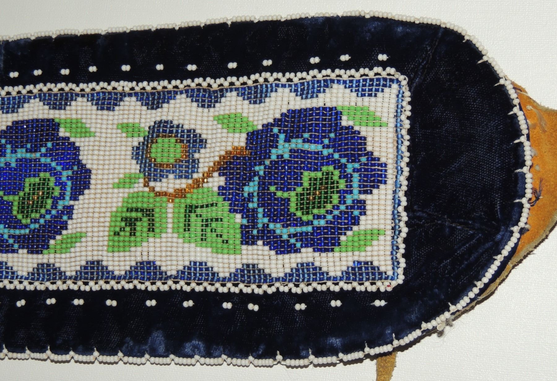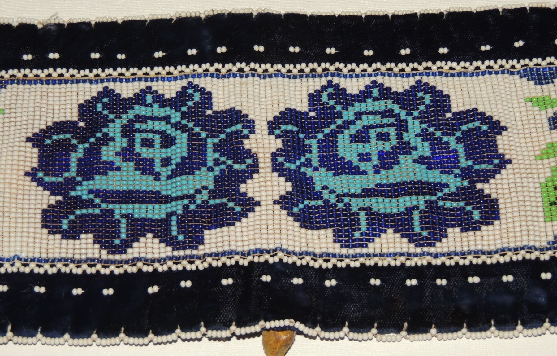 Highly Detailed floral beadwork in blue/purple/white on belt, Measuring 46 Inches Long and 5 Inches Wide. Has Leather Belt Straps Measuring 4 Inches and 11 Inch Leather Fasteners. Belt has detailed beaded Floral Pattern with tassles. Appears Métis based on beadwork, Mid/Late 1900's 20th Century. Please see our Other Auctions for additional - First Nations -Aboriginal -Indigenous Peoples - Métis- Metis - Iniut - Native American - Plains Indian - Artefacts