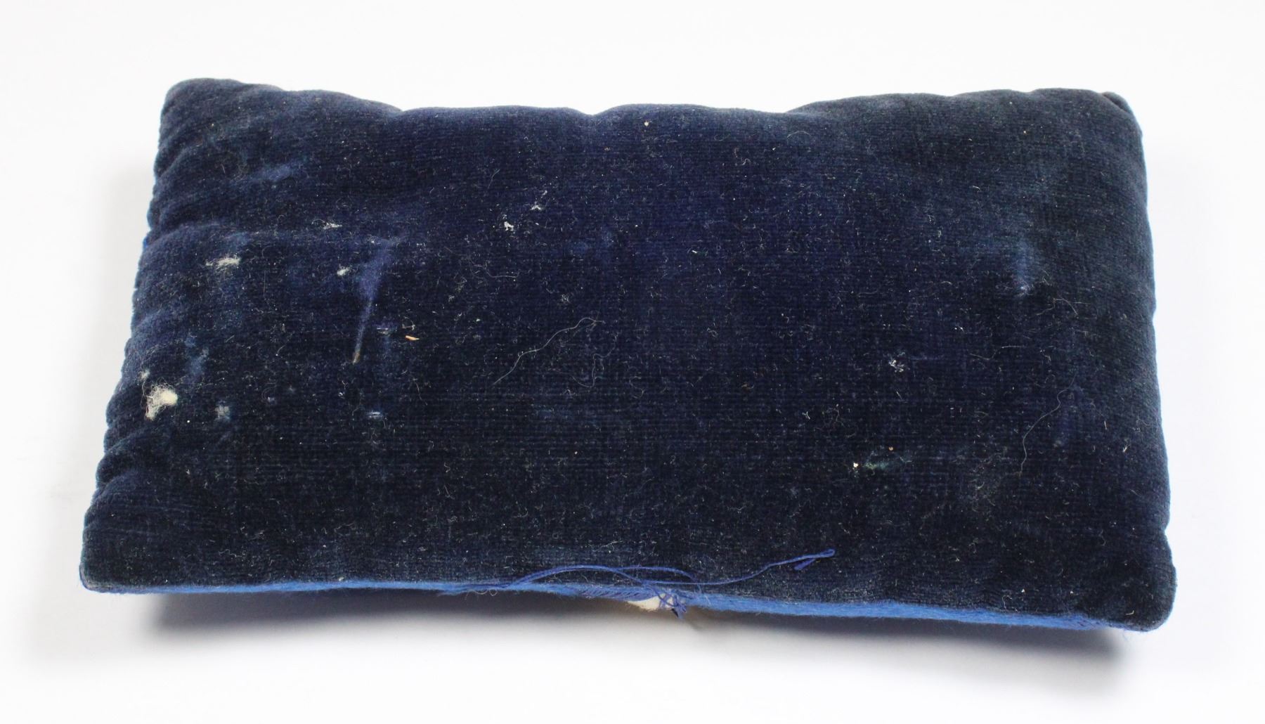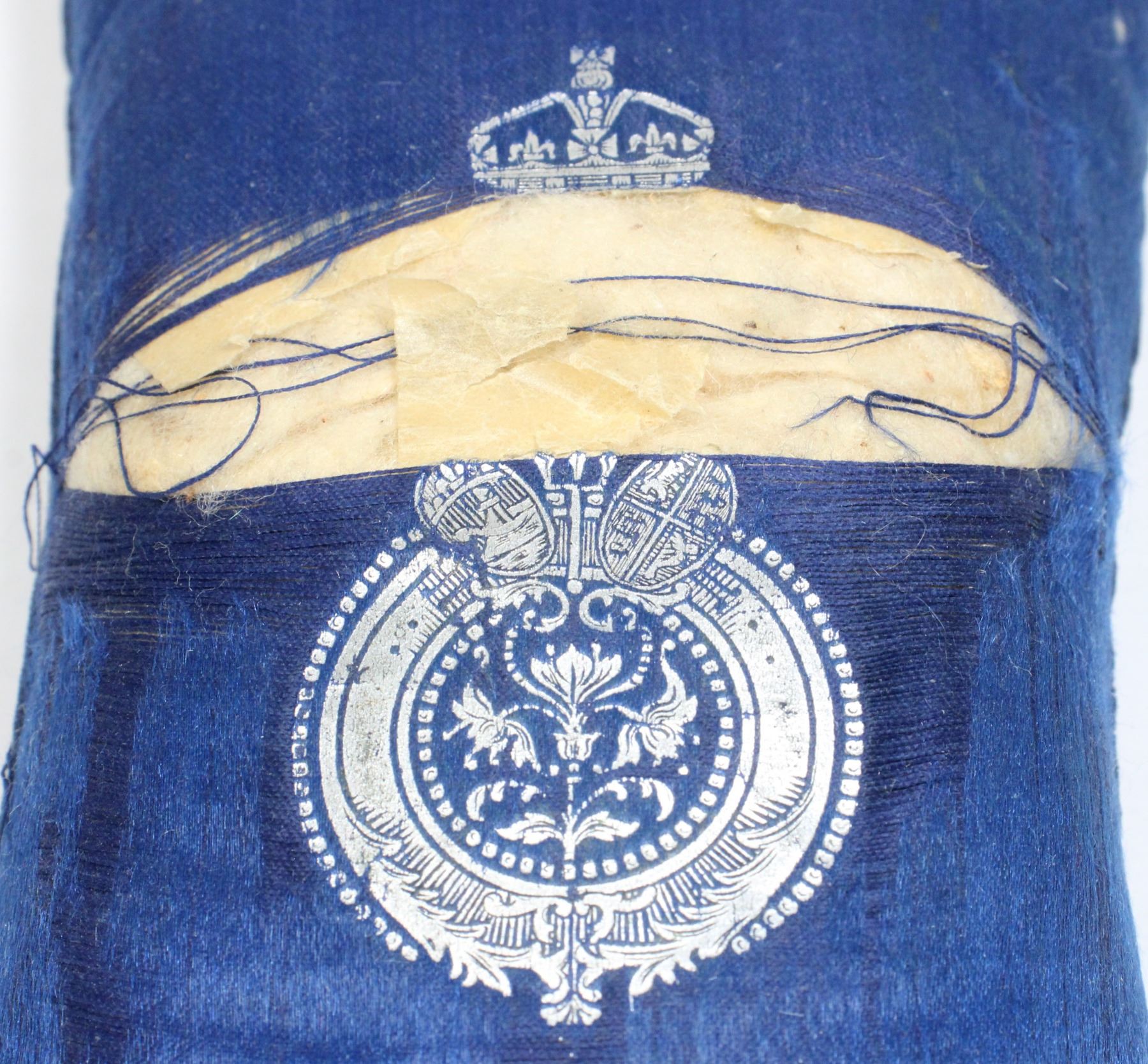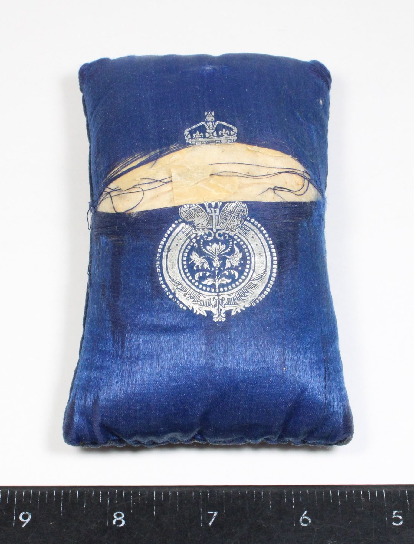 European Presentation pillow, worn condition with insignia crest visible on blue silk- for restoration/repair. European Militaria
