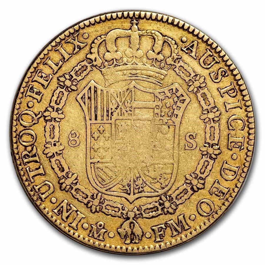 Mexico Mo FM Gold 8 Escudo. Contains .7614 oz of Gold. 34 mm.