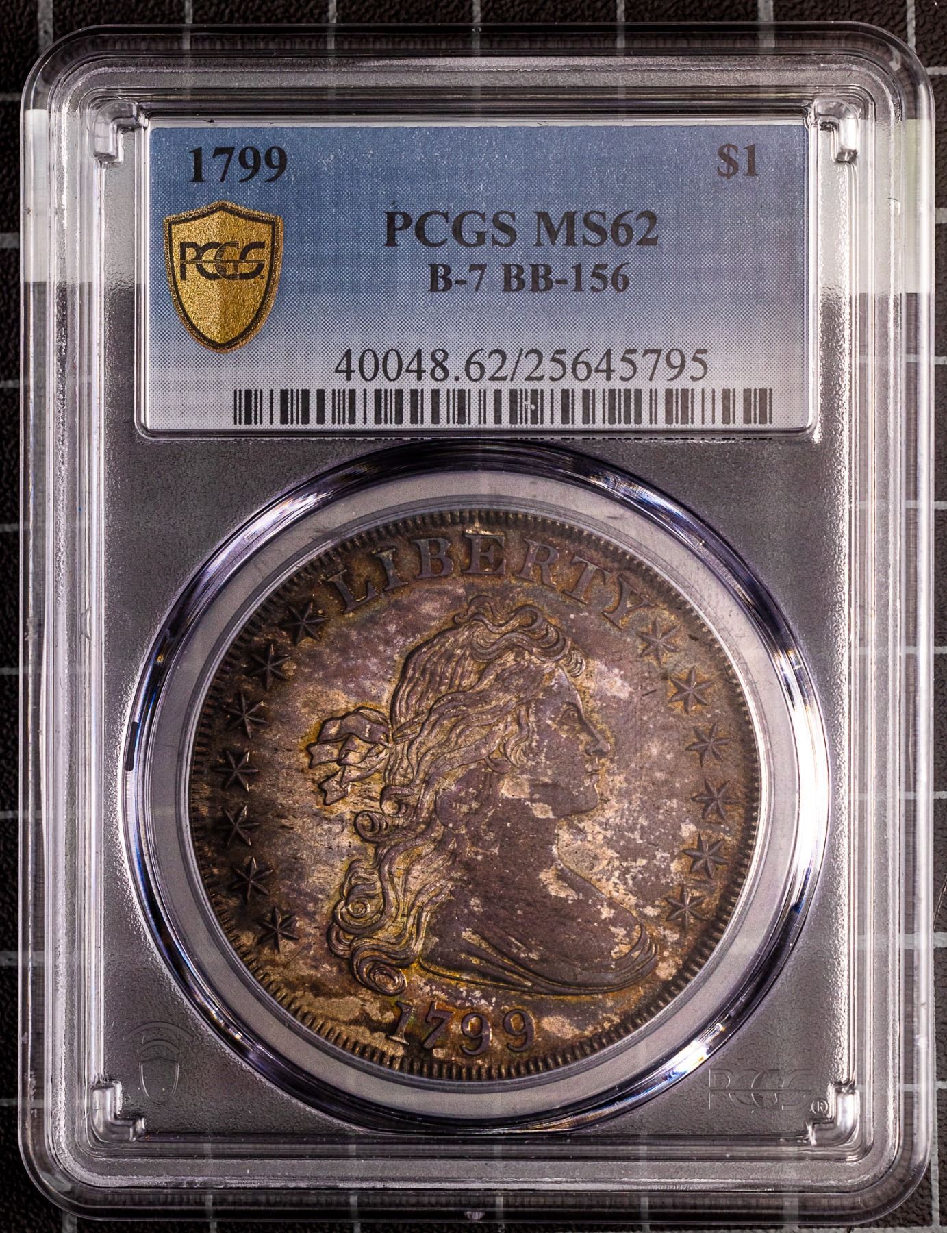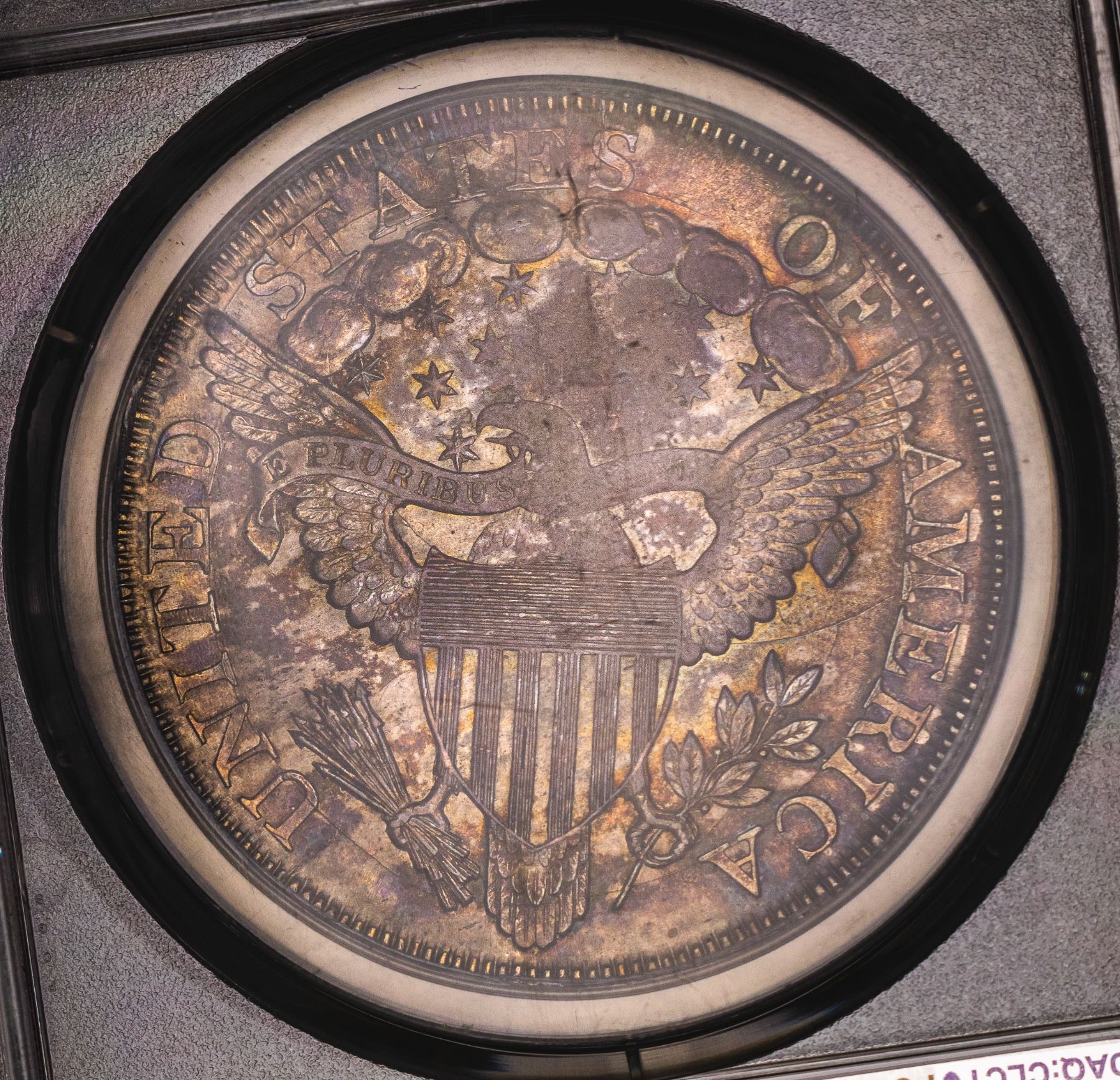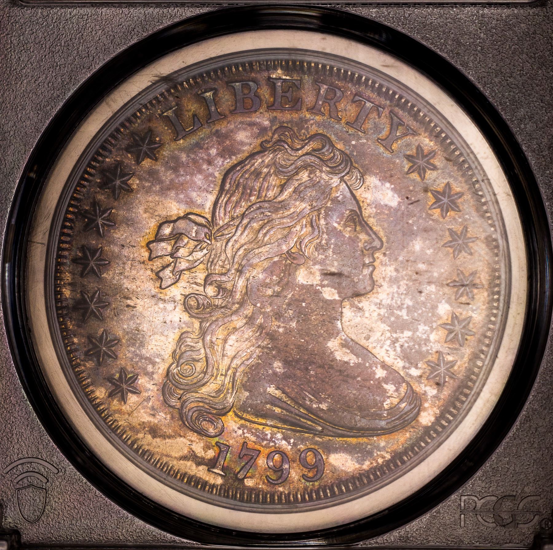 Wow! This 1799 $1 is in exceptional condition, hence it is the sole finest for the variety with the next contender being an AU55 example. This coin is extremely interesting since it is one of the latest die states. There are multiple die cracks throughout the reverse of this coin, starting in America and running throughout the reverse. The obverse is well struck and problem free. The obverse also features prominent orange toning around the date, stars, liberty, and the bust. The reverse features more of the same colors with additions of blues and reds. The reverse is very well struck. The eagle does seem to have worn down over the past 223 years since this coin was minted, but still all these years later, this coin has managed to stay problem free and a sole finest top pop example for the variety.