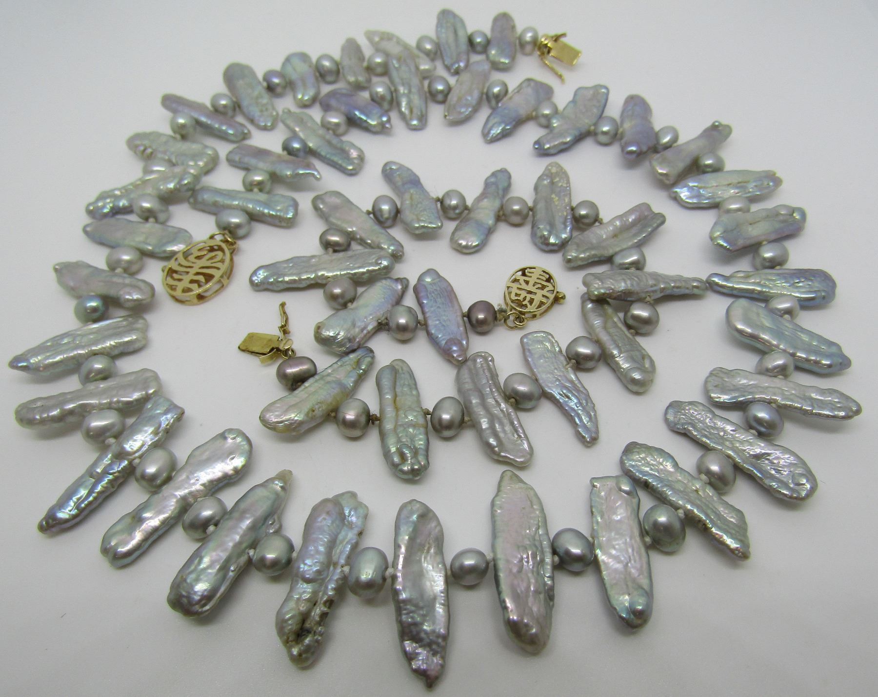 ONE 18 INCH LONG STRAND(32.7 GRAMS) AND ONE 7.5 STRAND(11.8 GRAMS) OF ALTERNATING 20MM AND 5MM PEARLS. 14K YELLOW GOLD CATCH MARKED WITH A SYMBOL FOR HAPPINESS PLUS ANOTHER. USA SHIPPING $8