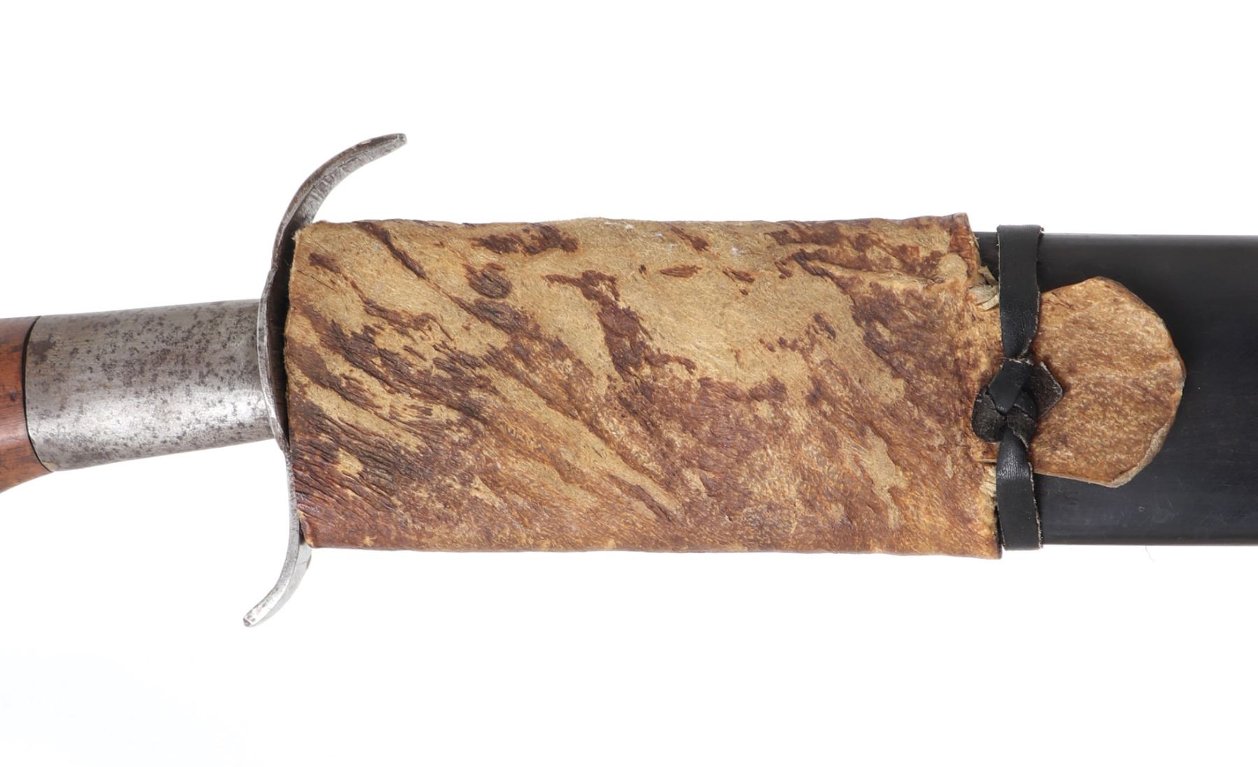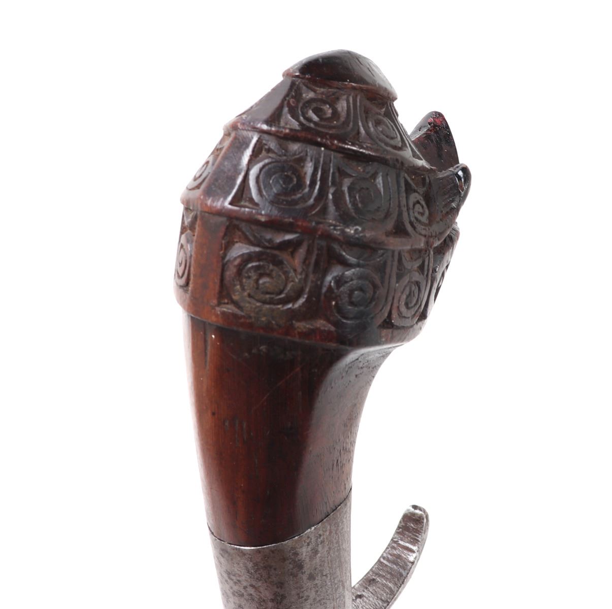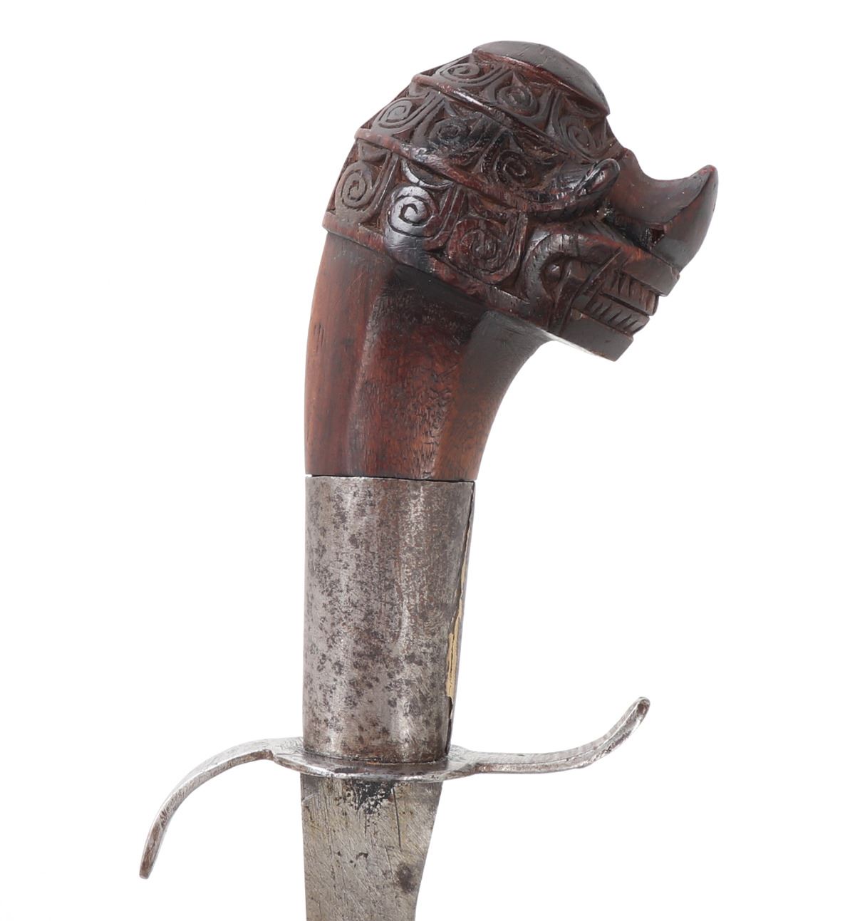 1800-1900's heavy 3lb Filipino Visayan wood and iron Tenegre sword. Single edged blade with 1/4" thick spine terminates into crossguard. Metal collar above carved zoomorphic diety with geometric head, baring teeth and a pointy nose. Thick and heavy black wood scabbard with leather wrapped base. Size 26 3/4" L, blade 19 1/2" L