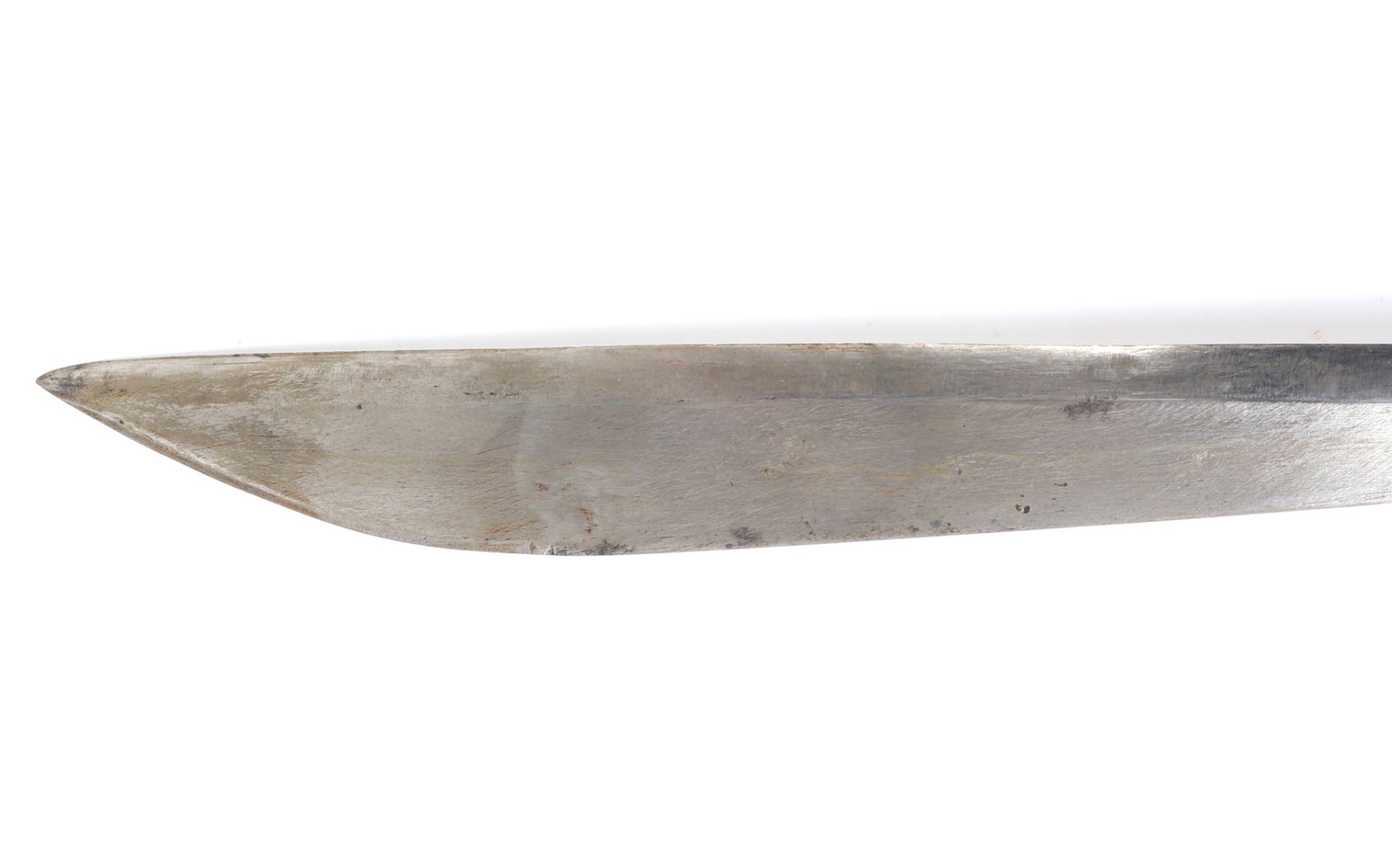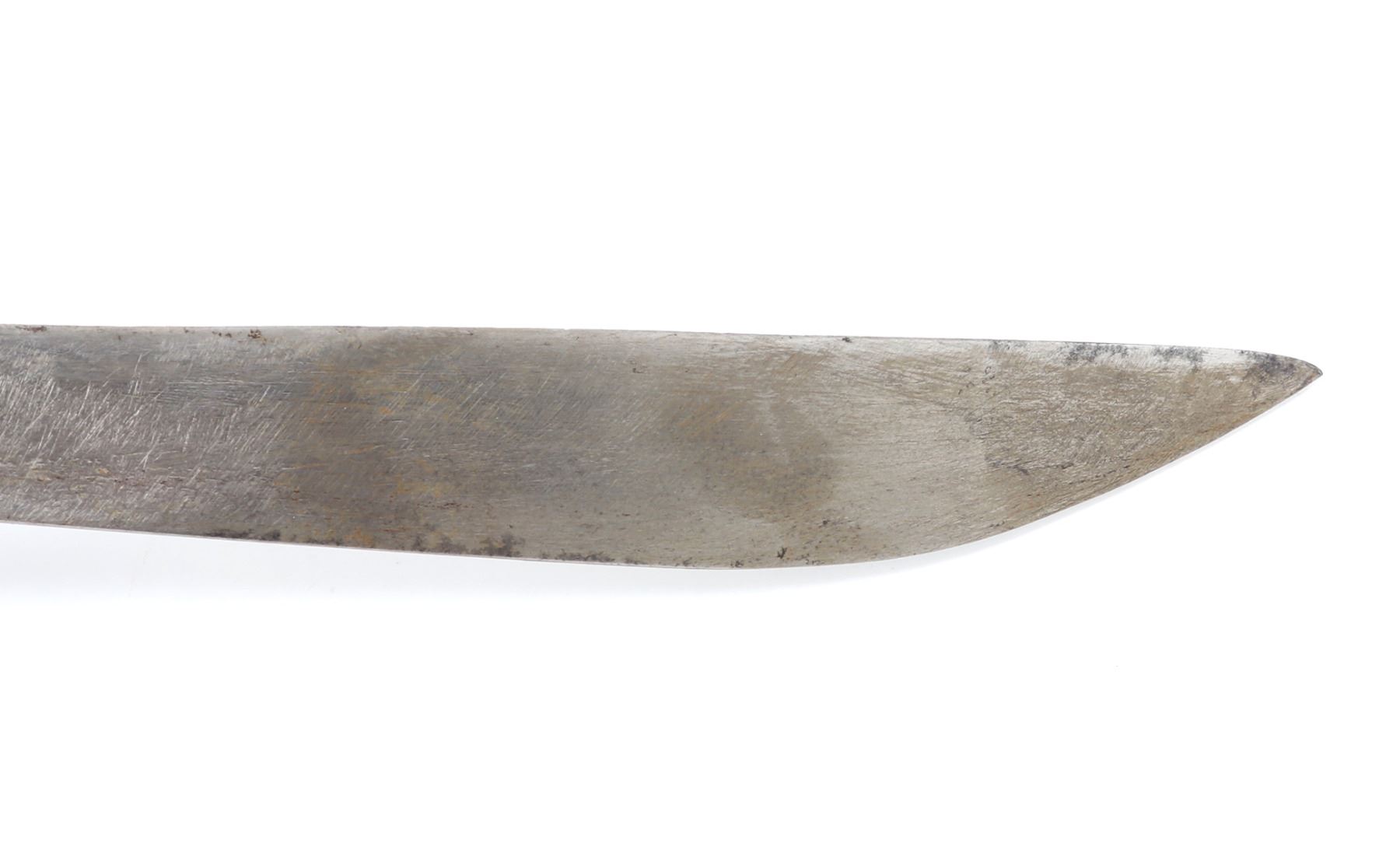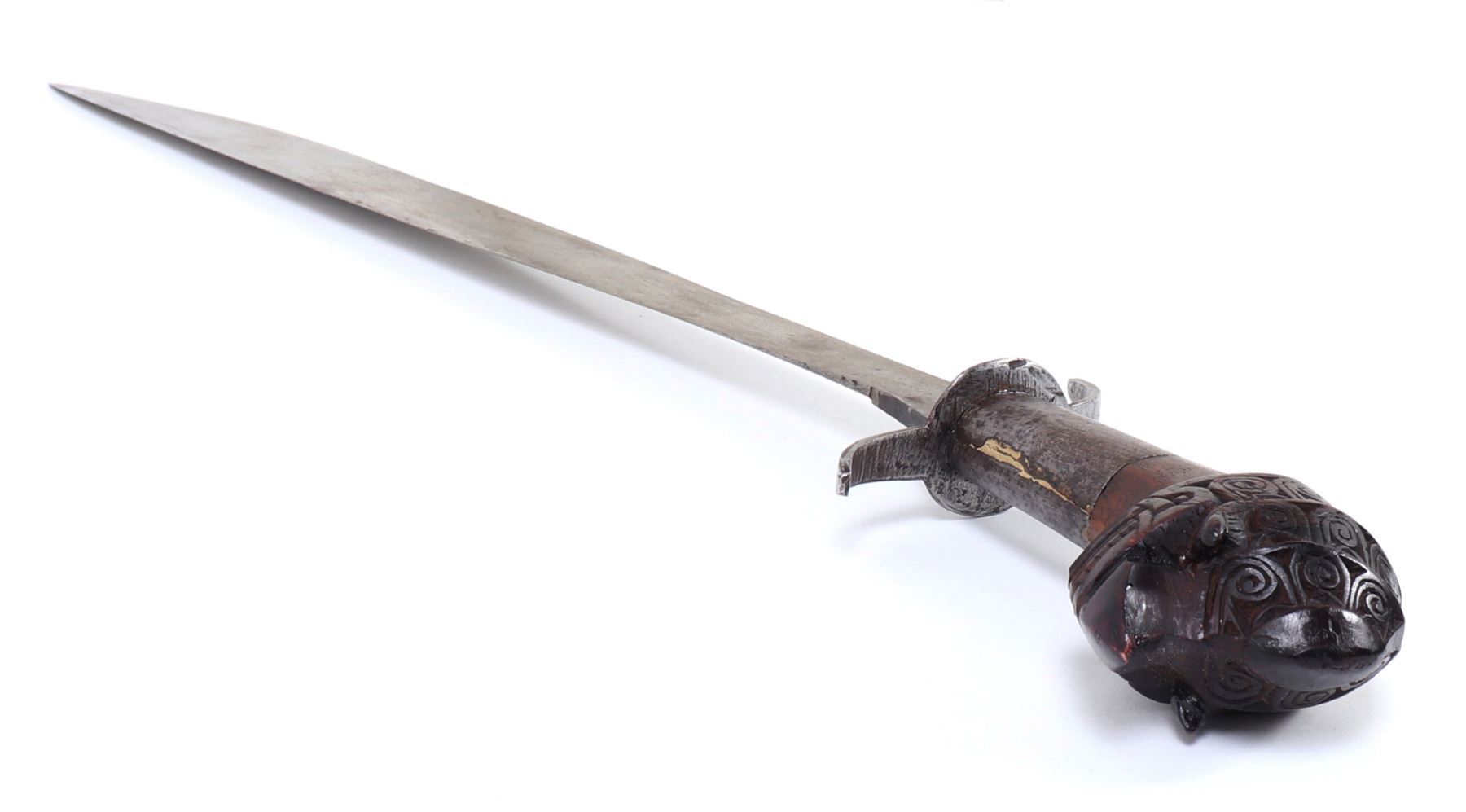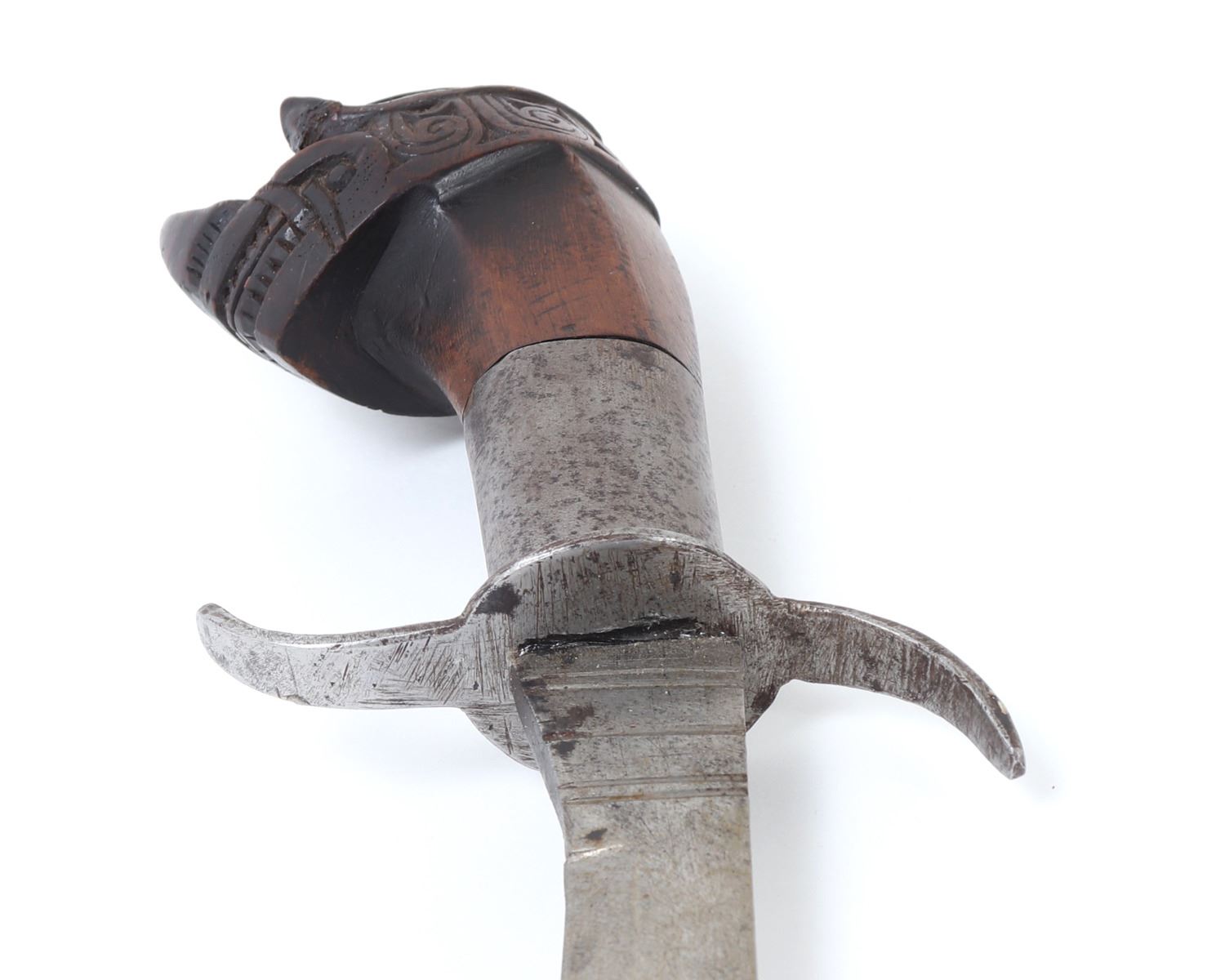 1800-1900's heavy 3lb Filipino Visayan wood and iron Tenegre sword. Single edged blade with 1/4" thick spine terminates into crossguard. Metal collar above carved zoomorphic diety with geometric head, baring teeth and a pointy nose. Thick and heavy black wood scabbard with leather wrapped base. Size 26 3/4" L, blade 19 1/2" L