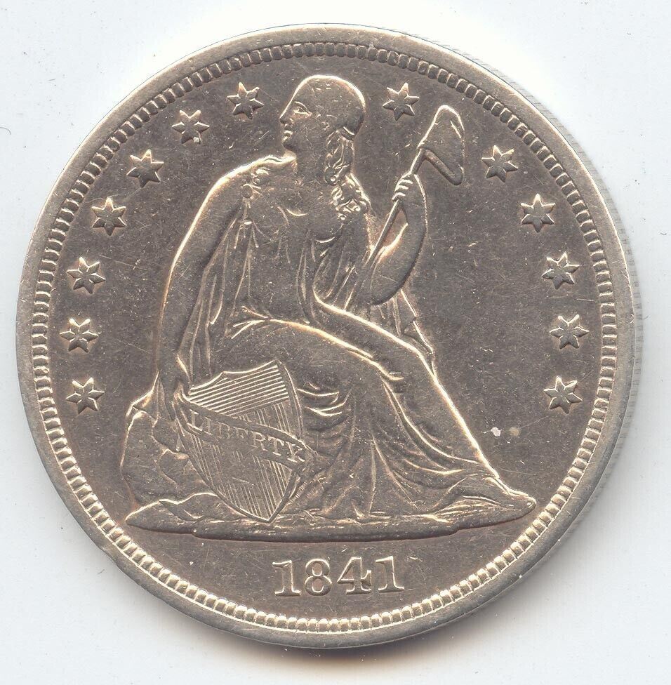 1841 Liberty Seated Dollar XF. The Liberty Seated Dollar, designed by Christian Gobrecht, was minted from 1840 to 1873. In 1841, only 173,000 Philadelphia mint Liberty Seated Dollars were struck, making it a tough coin to locate. Seated Liberty Silver Dollars were primarily minted in Philadelphia, although there are 12 different branch mint issues.