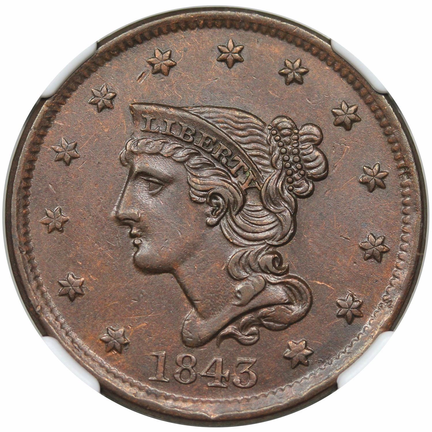 1843 Braided Hair Large Cent, Petite Head, Small Letters, N-3, R3, NGC AU55