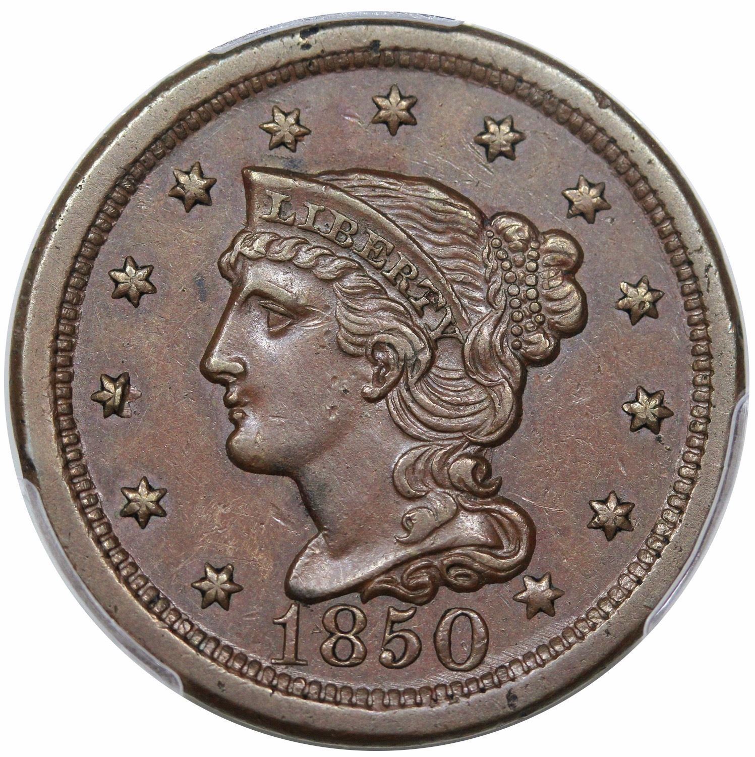 1850 Braided Hair Large Cent, N-13, R4, PCGS AU55, ex Twin Leaf.