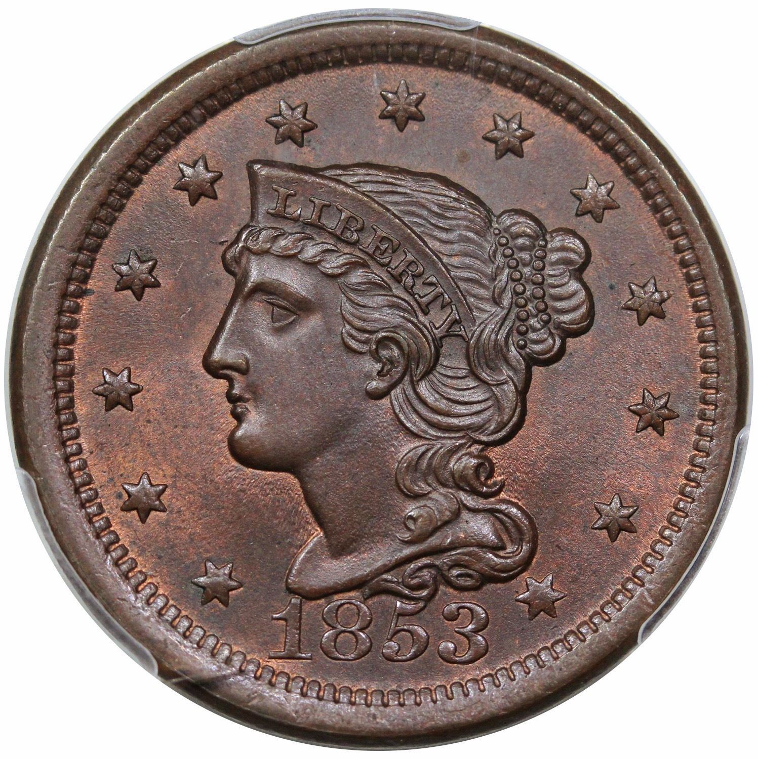 1853 Braided Hair Large Cent, N-25, R1, PCGS MS66BN.