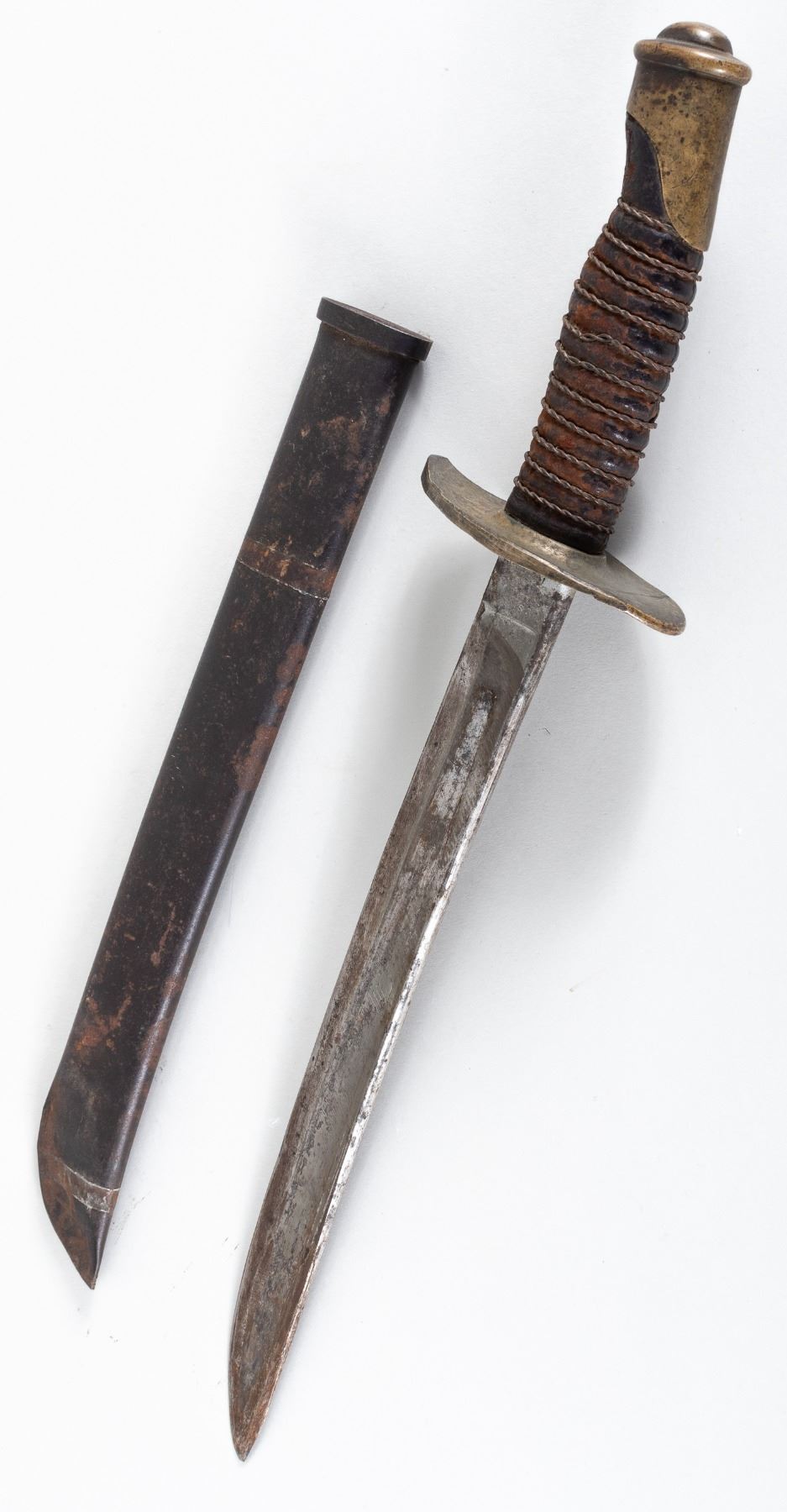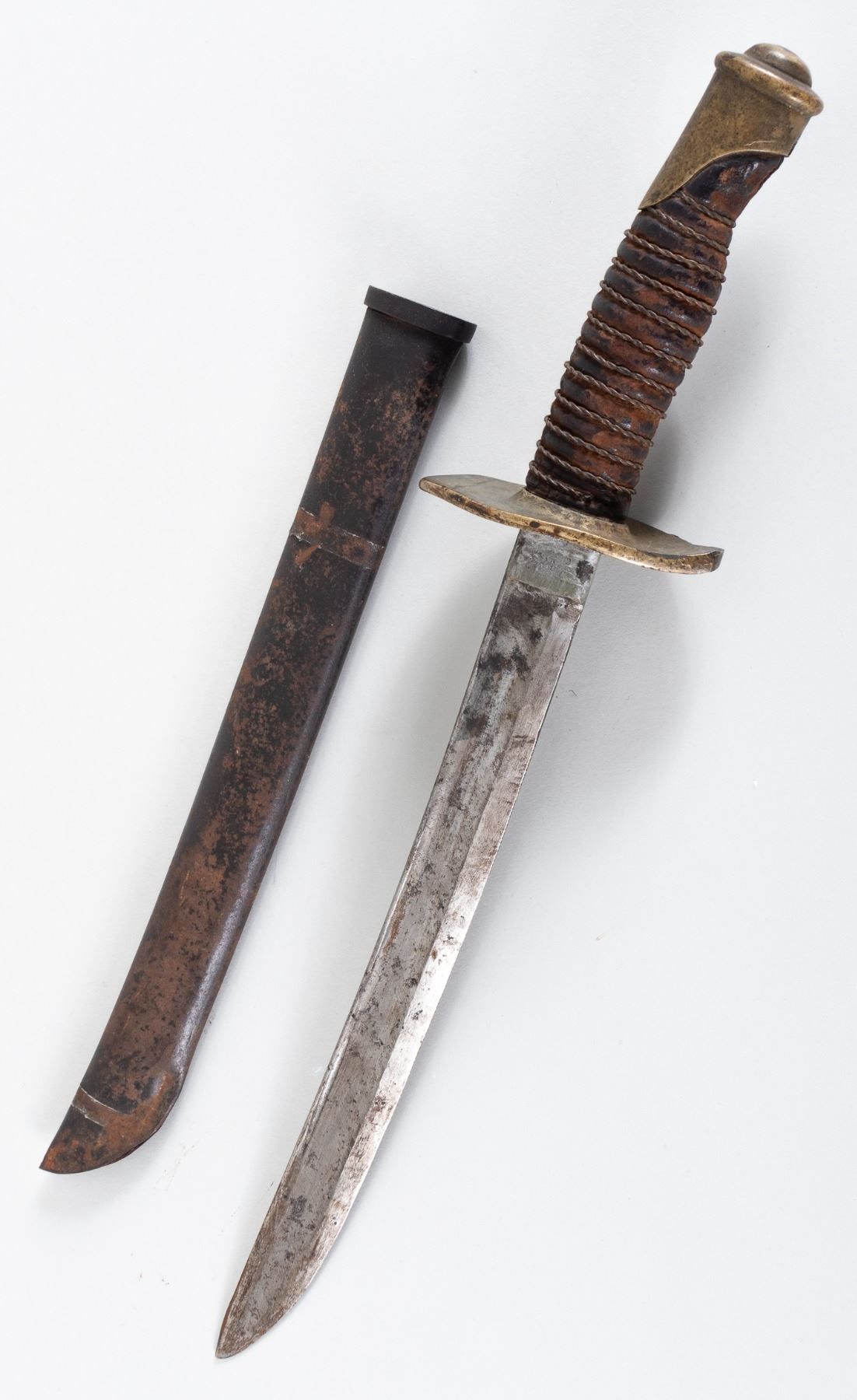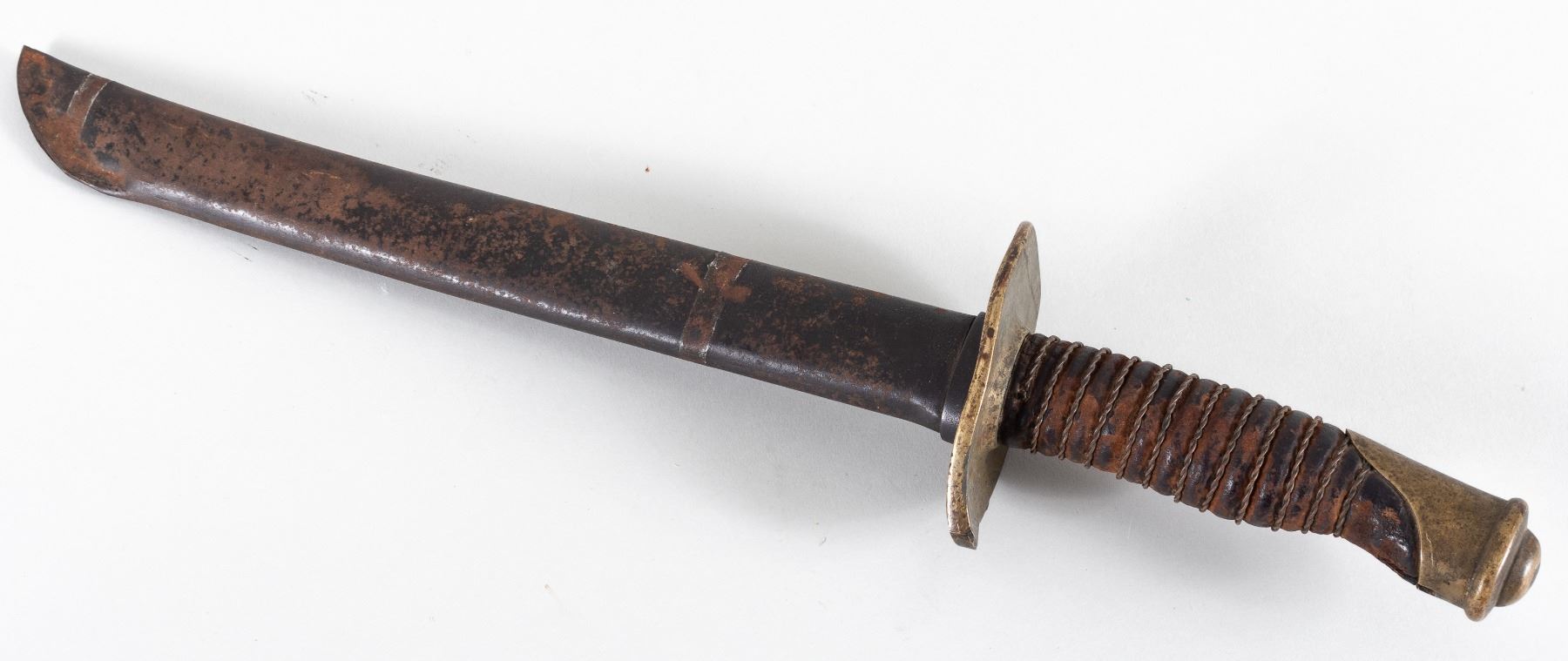 1860s cut-off sword with metal scabbard. Sword has leather grip with braided aluminum and brass pommel. Sharpened sword has partially illegible maker's mark, 'USA - ACK - 1863'. Crossguard has pitting and is bent. Scabbard has rust spots. Overall length is 18.5 inches. Blade is 12.25 inches.