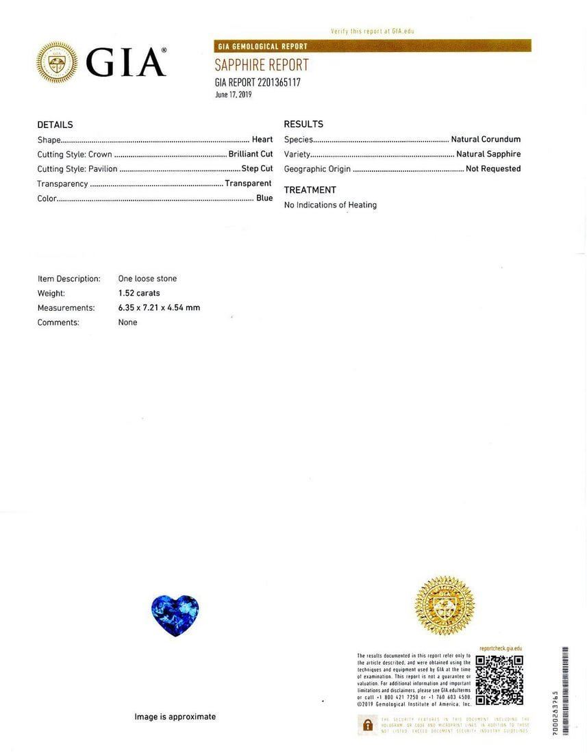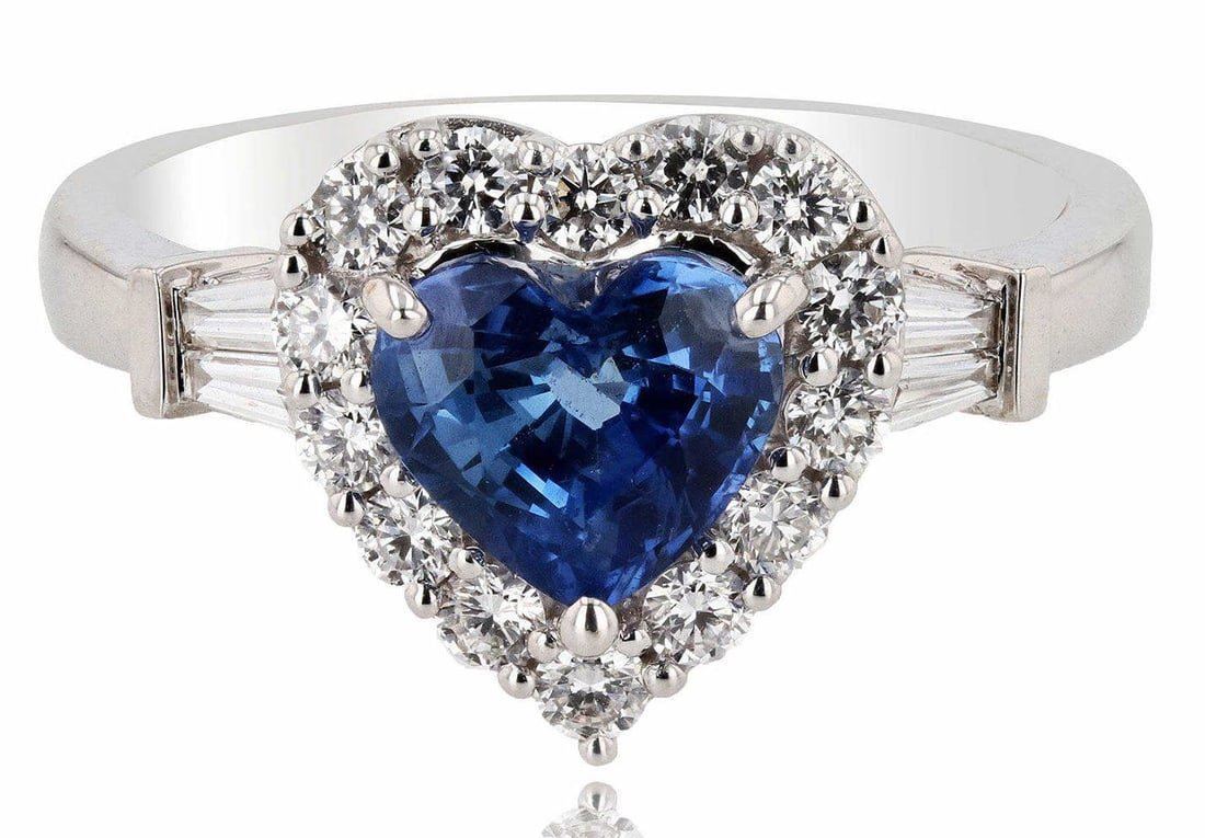 One electronically tested 18KT white ladies cast blue sapphire and diamond ring. The featured sapphire is set within a diamond bezel, supported by diamond set shoulders, completed by a three millimeter wide band.Identified with "750". Trademark is RT. Containing: One prong set heart mixed cut natural blue sapphire, measuring 6.35mm x 7.21mm x 4.54mm, exact weight 1.52ct., clarity is slightly included, type II, medium dark, moderately strong, blue color, (GIA B 6/4), cut is very good. Transmitting light with no distortion, transparent. Naturally occurring internal and external characteristics are present. Graded looseprior to setting in the GIA Laboratory, Report # 2201365117. The report is attached. Eighteen prong set round brilliant and baguette cut diamonds approximate total weight of 18 Stones = 0.40ct. Graded in thesetting. Clarity VS1 to SI1 Color G - I Total Weight of Colored Stones 1.52ct. Total Weight of Diamonds 0.40ct. Total Weight of Ring 5.40 gm